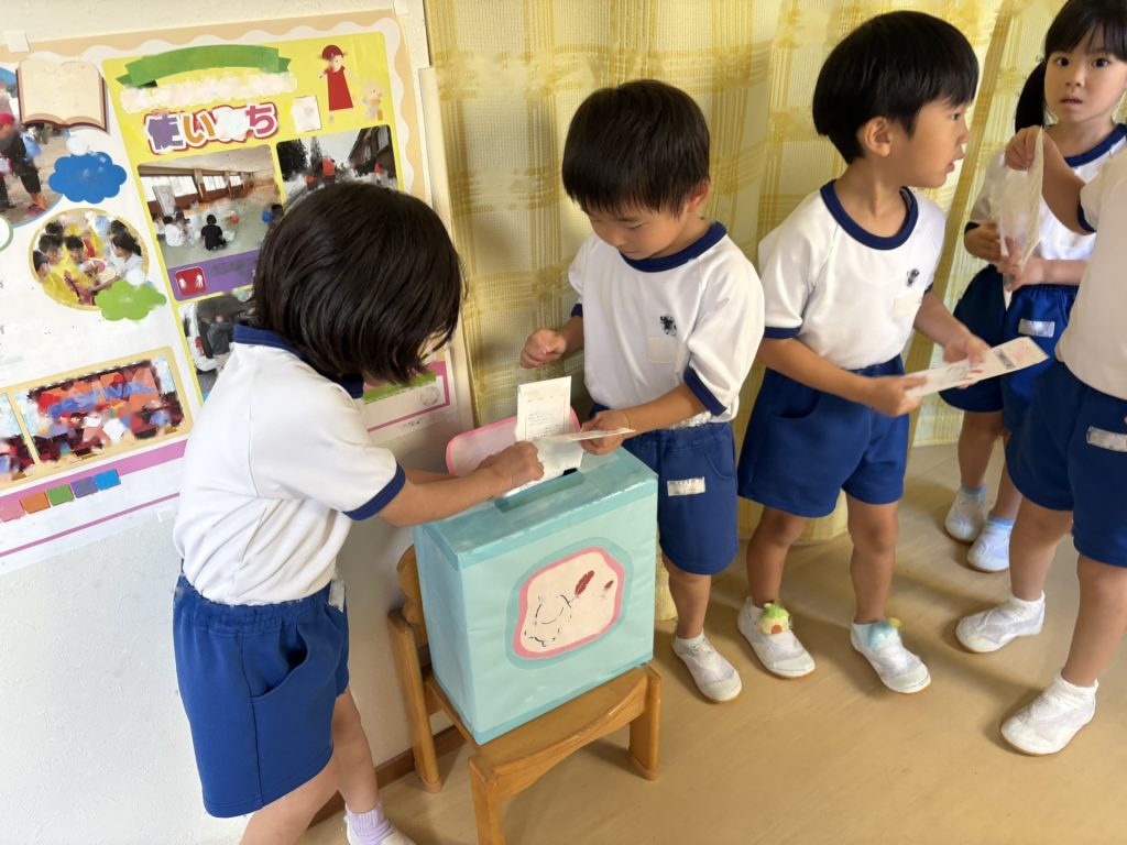 ②お子様の名前の書いてある紙袋をみつけ、子ども衣装をきます♪(今日はスモックを着ました!)