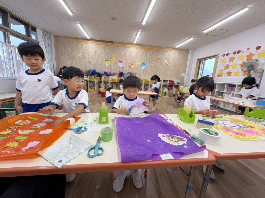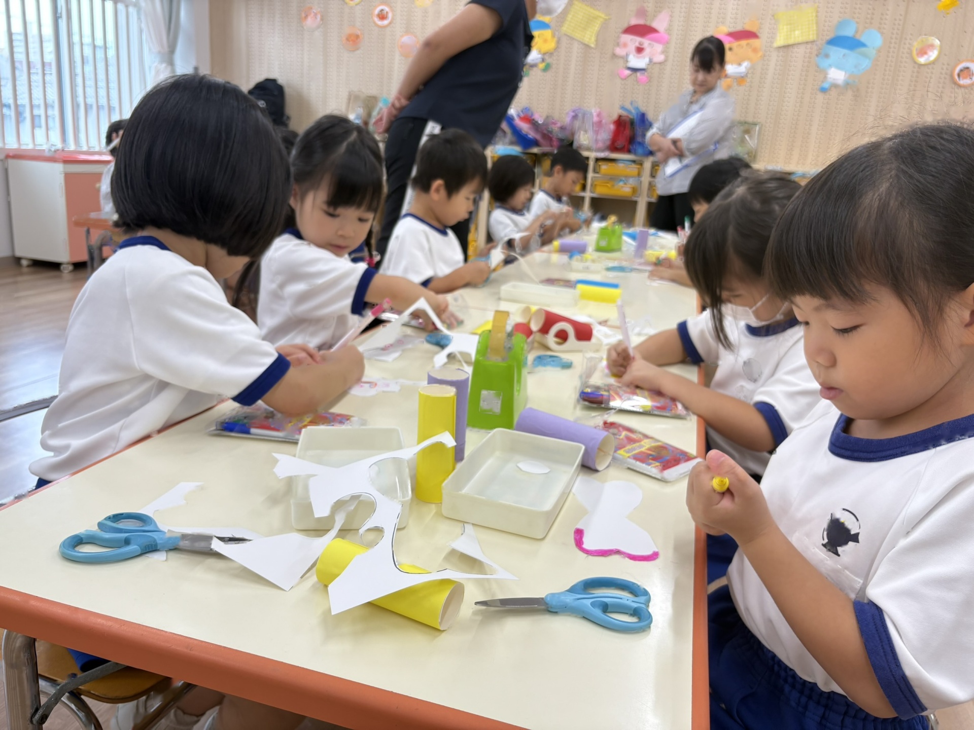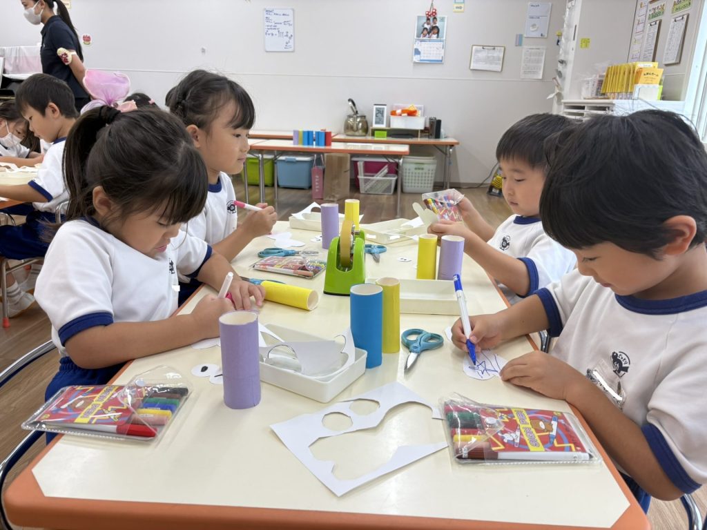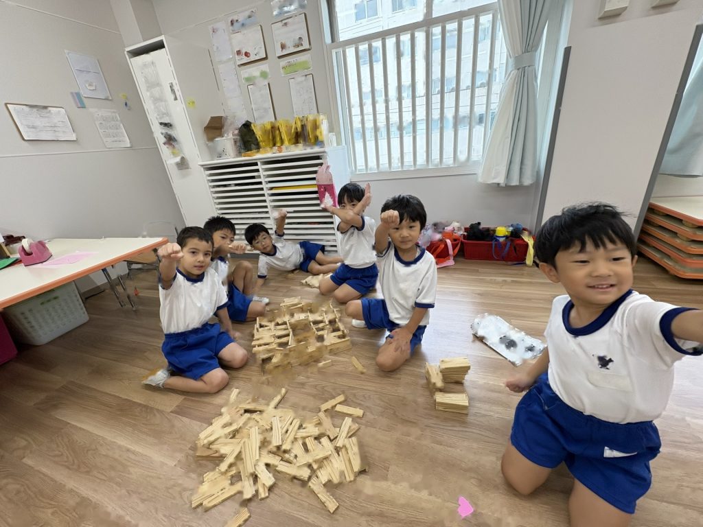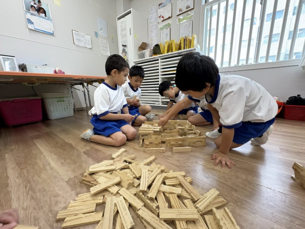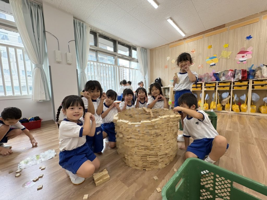 令和7年9月19日金曜日 お部屋遊び お部屋での遊びを楽しんでいる子ども達です。試行錯誤を繰り返しながら、お友達と一緒に好きな遊びを満喫中です♪ ★制作コーナー 作った作品でかわいく変身! 手裏剣づくり! ★つみきコーナー 高く積めるかな? 続きはまた来週♪