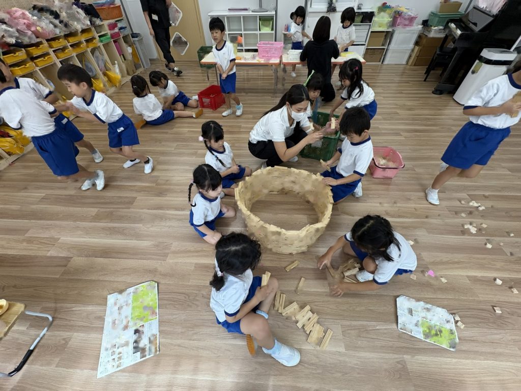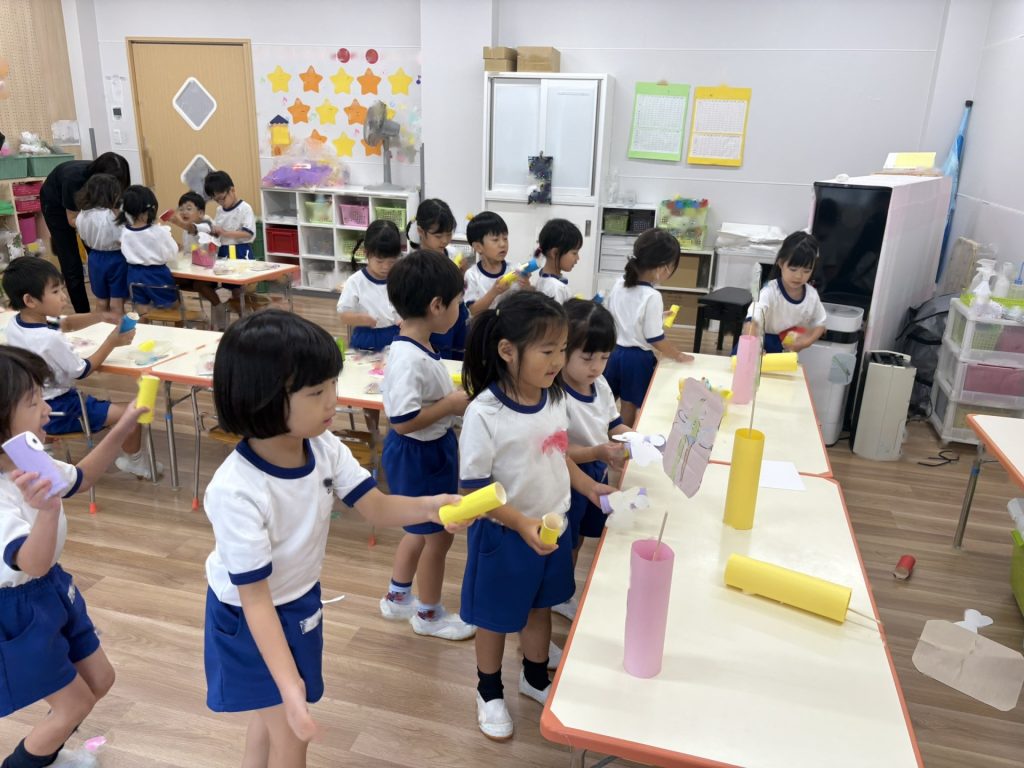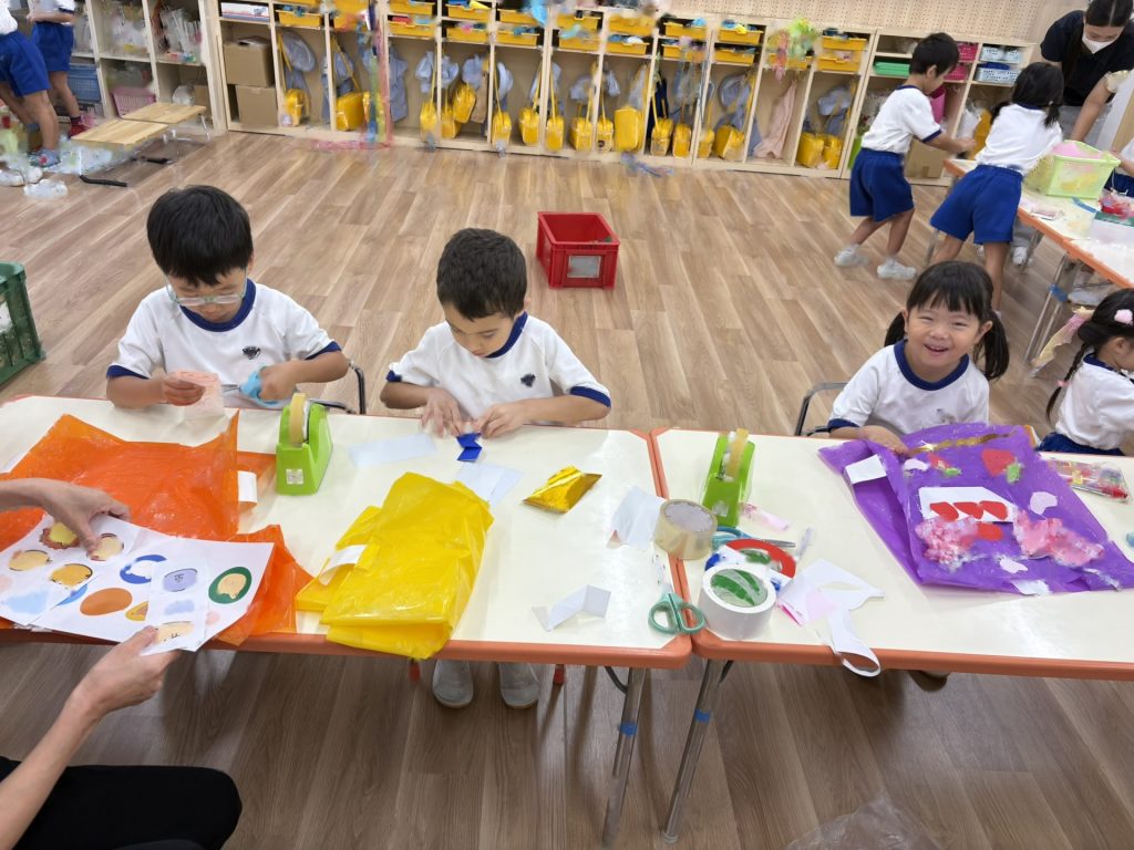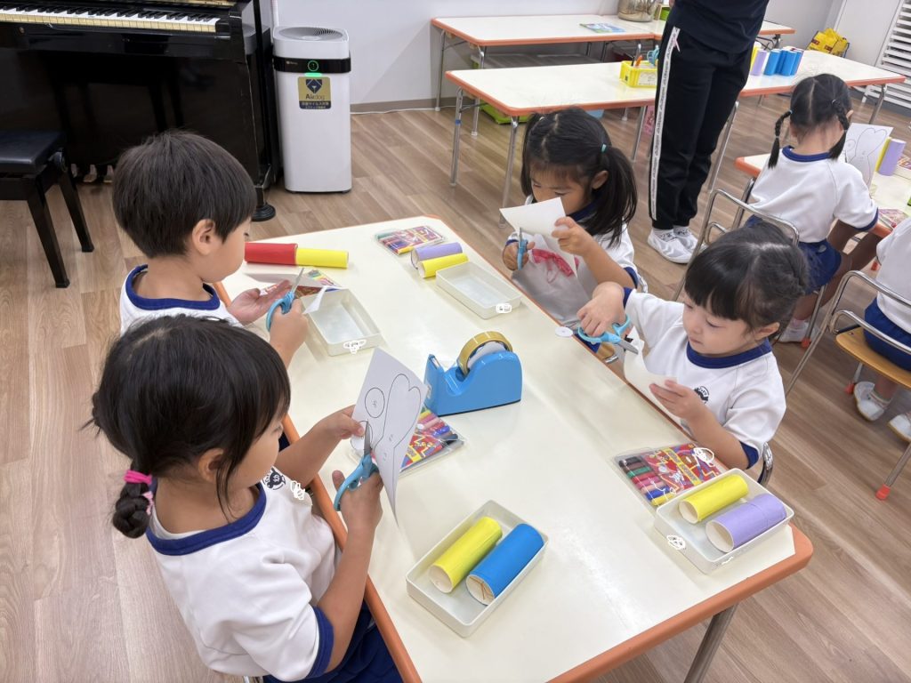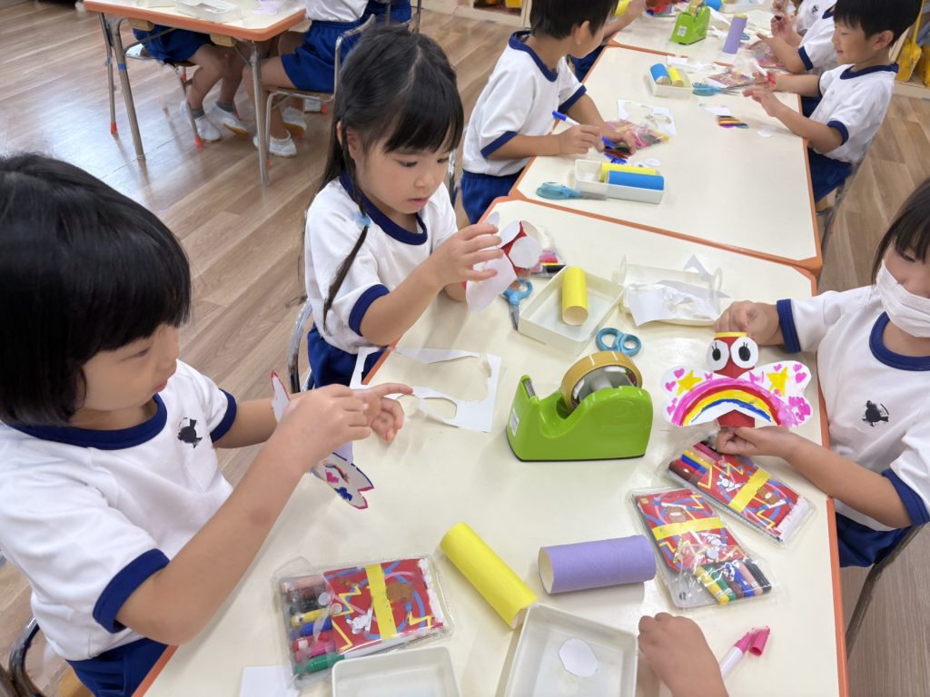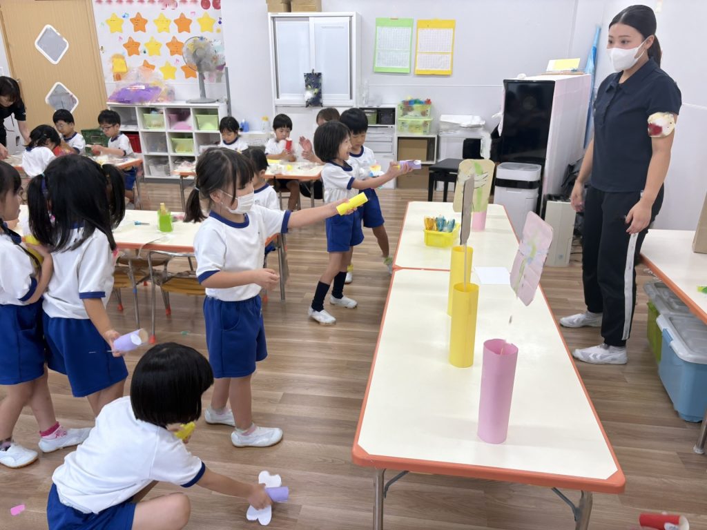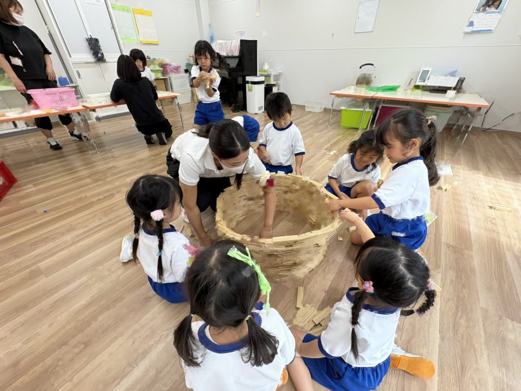 令和7年9月19日金曜日 お部屋遊び お部屋での遊びを楽しんでいる子ども達です。試行錯誤を繰り返しながら、お友達と一緒に好きな遊びを満喫中です♪ ★制作コーナー 作った作品でかわいく変身! 手裏剣づくり! ★つみきコーナー 高く積めるかな? 続きはまた来週♪