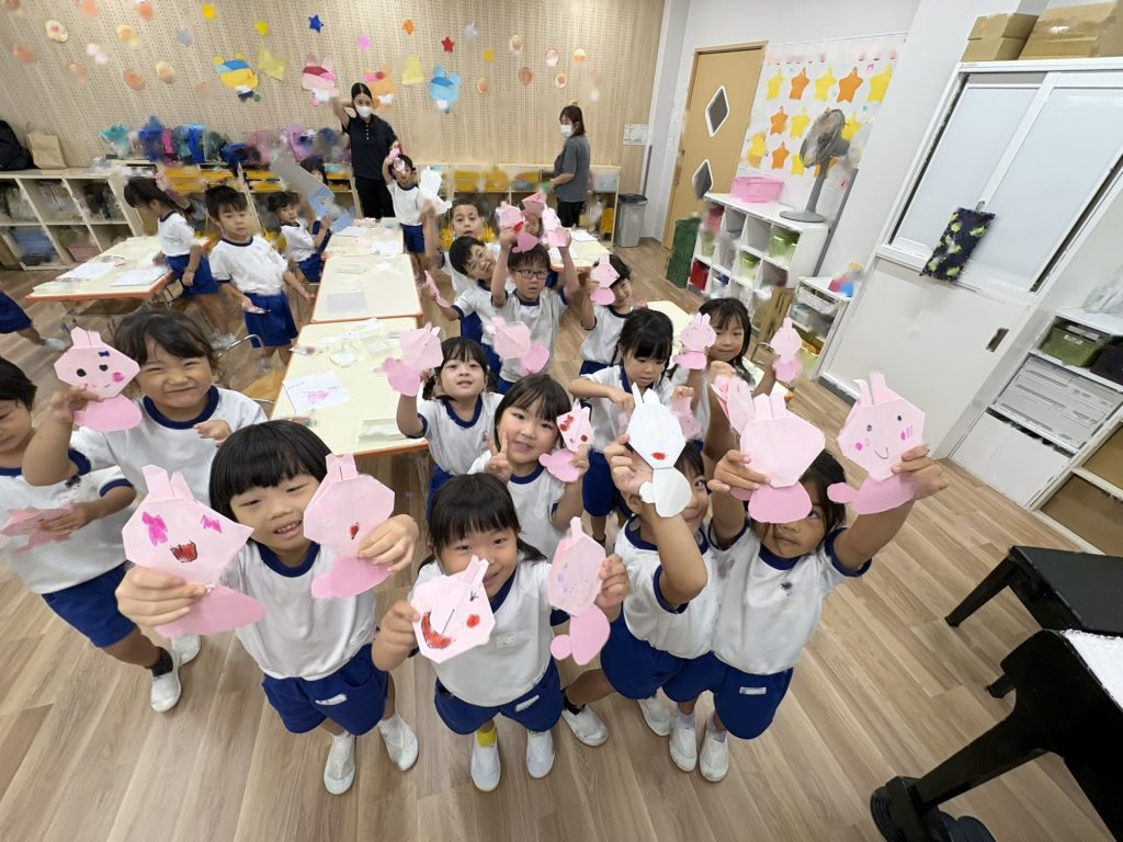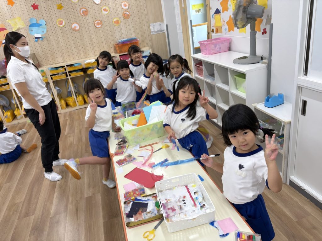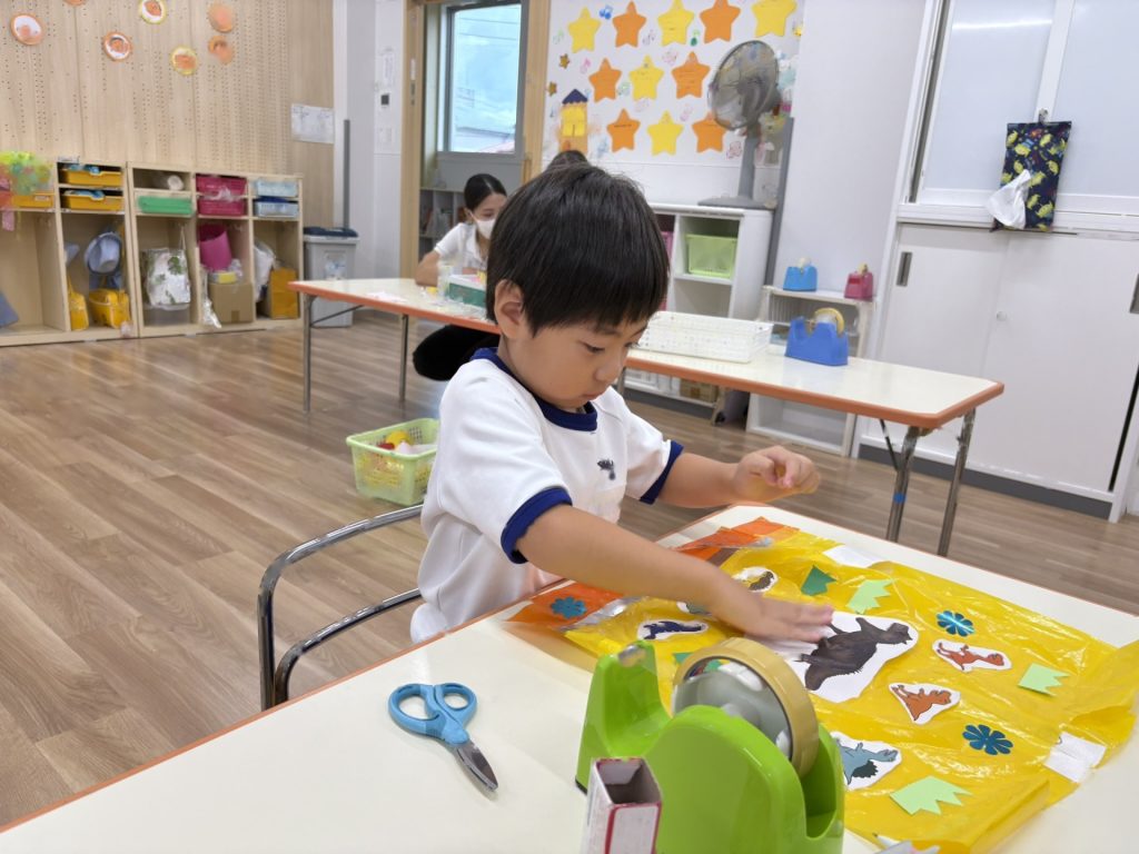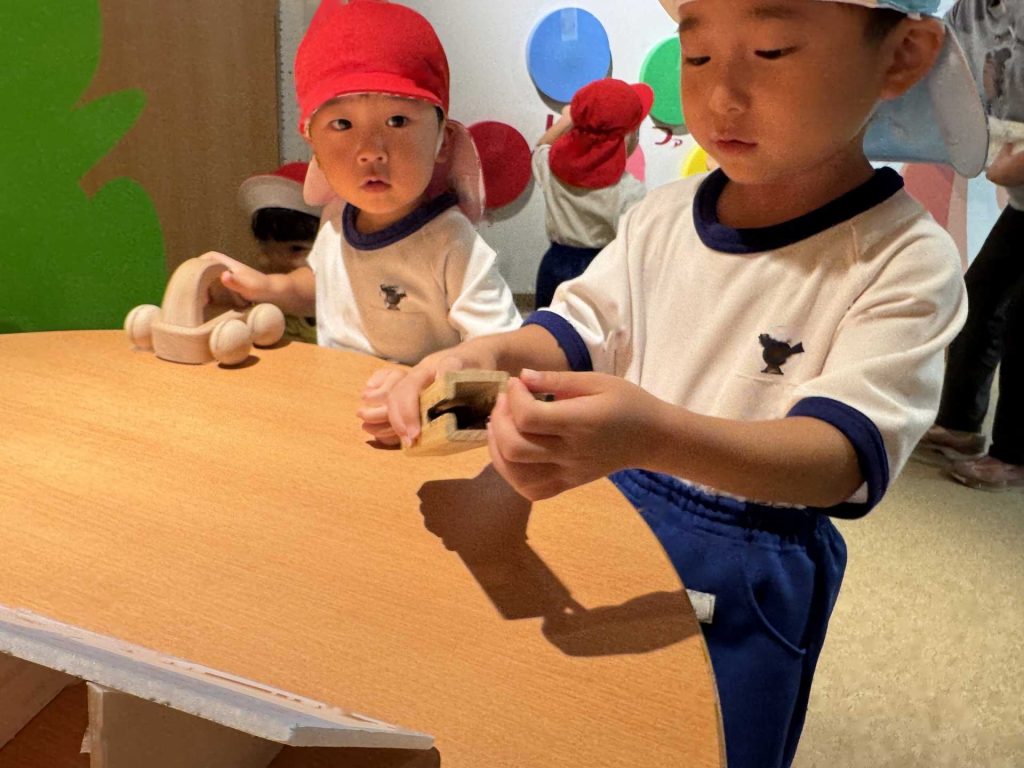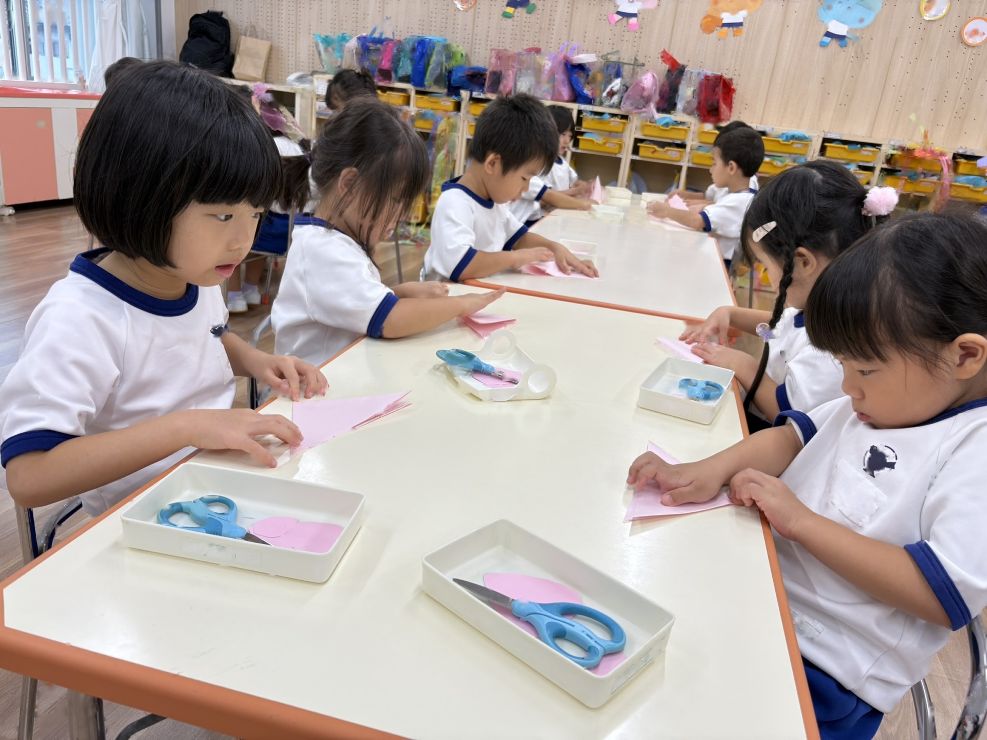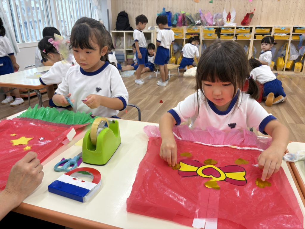 令和7年9月19日金曜日 お部屋遊び お部屋での遊びを楽しんでいる子ども達です。試行錯誤を繰り返しながら、お友達と一緒に好きな遊びを満喫中です♪ ★制作コーナー 作った作品でかわいく変身! 手裏剣づくり! ★つみきコーナー 高く積めるかな? 続きはまた来週♪
