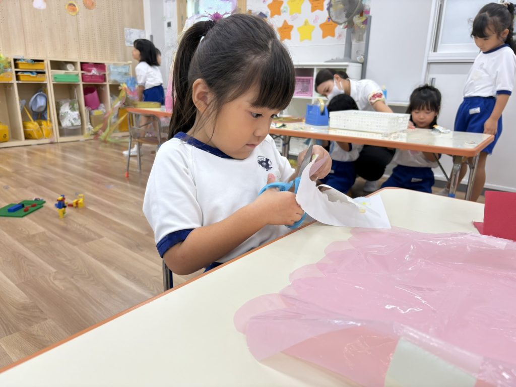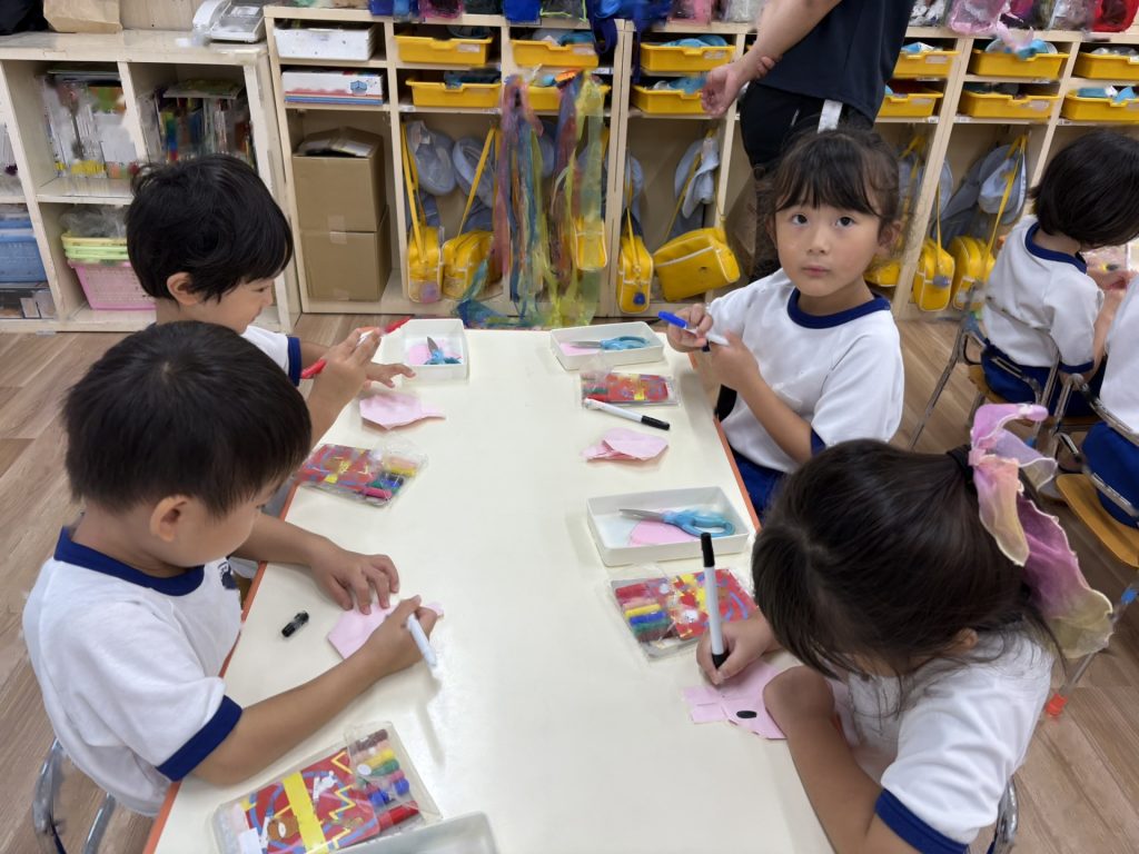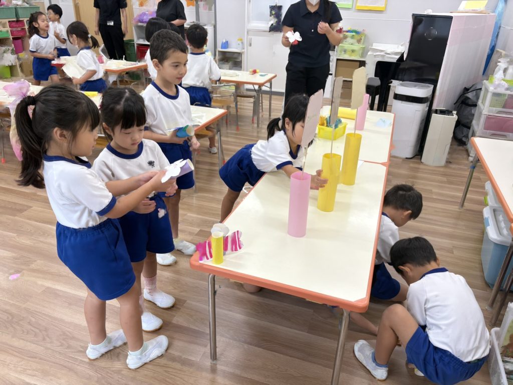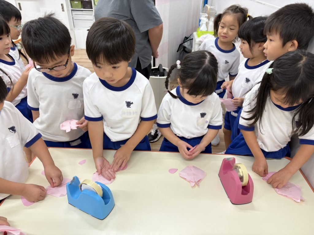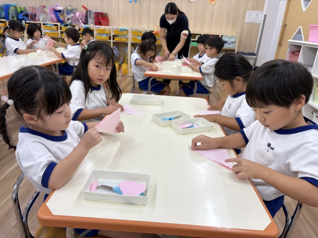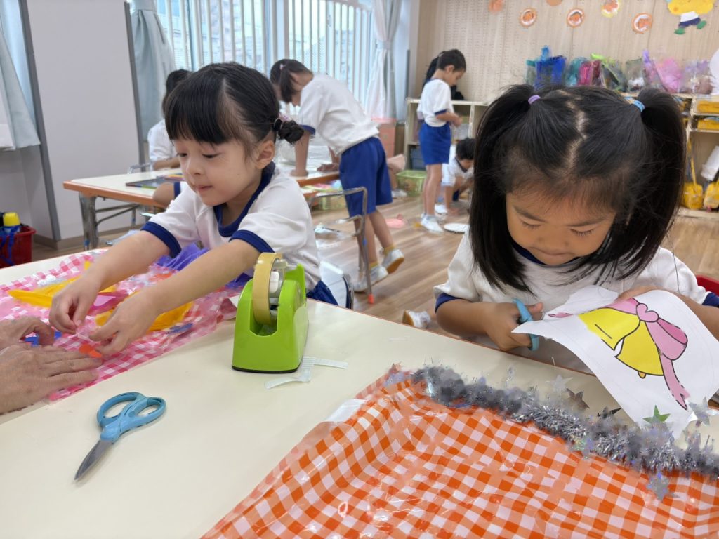 令和7年9月19日金曜日 お部屋遊び お部屋での遊びを楽しんでいる子ども達です。試行錯誤を繰り返しながら、お友達と一緒に好きな遊びを満喫中です♪ ★制作コーナー 作った作品でかわいく変身! 手裏剣づくり! ★つみきコーナー 高く積めるかな? 続きはまた来週♪
