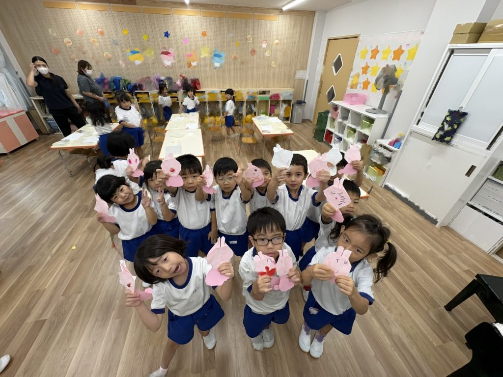 令和7年9月18日木曜日 制作活動 折り紙で「うさぎ」を作って遊びました。作り方を聞きながら、みんなで楽しく制作しました。 ①うさぎの身体作り~ハサミで線切り~ ②うさぎの顔づくり~折り紙~ ③顔をかく&体とくっつける ☆完成☆かわいいうさぎちゃんができました。