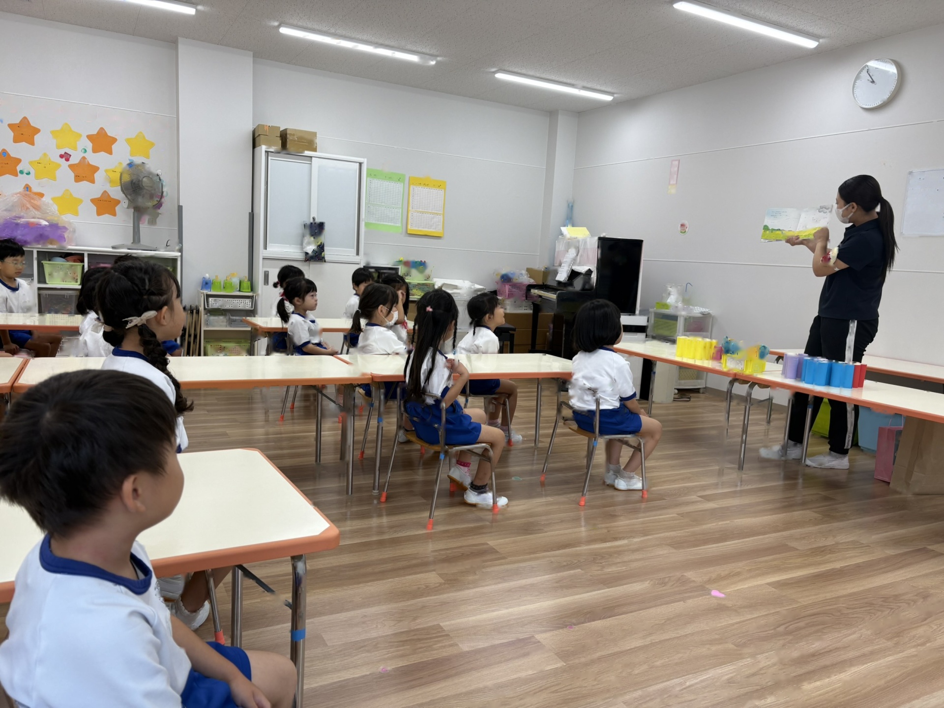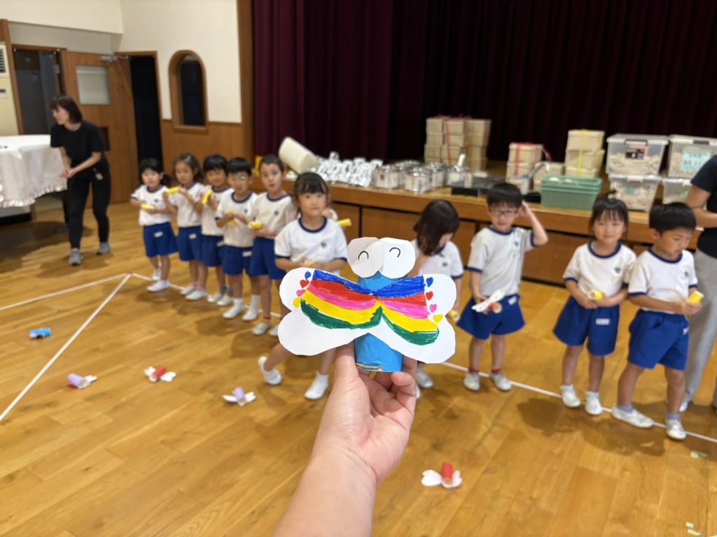 令和7年9月24日水曜日 制作遊び 今日は実習の先生と一緒に制作をして遊びました。秋にでてくる虫”とんぼ”作りに挑戦しました。 ①絵本を読みます。トンボについてお勉強♪ ②制作スタート!ハサミで目と羽を切ります。 ③サインペンで模様を描いたら、テープで貼ります。 ④最後はとばして遊びました。 たのしい時間はあっという間、もう少し園で遊んでからお家へ持ち帰ります!