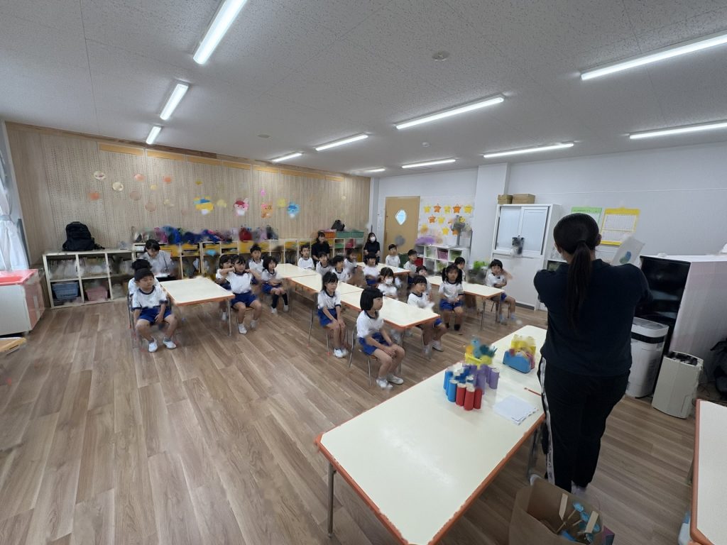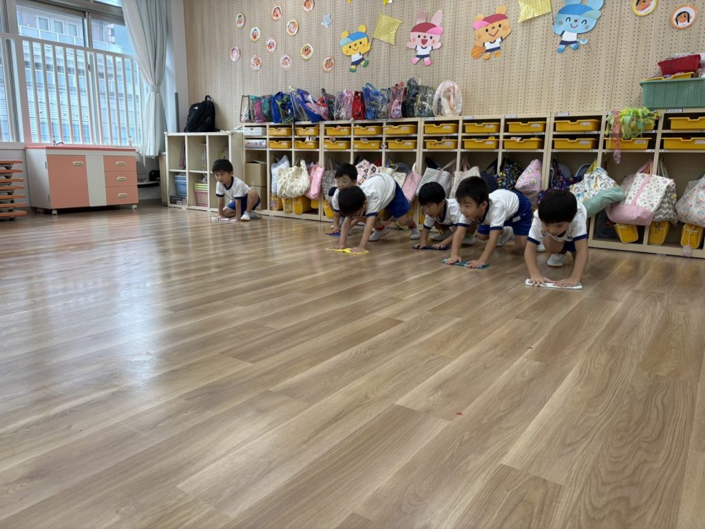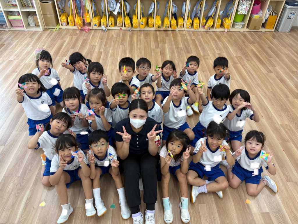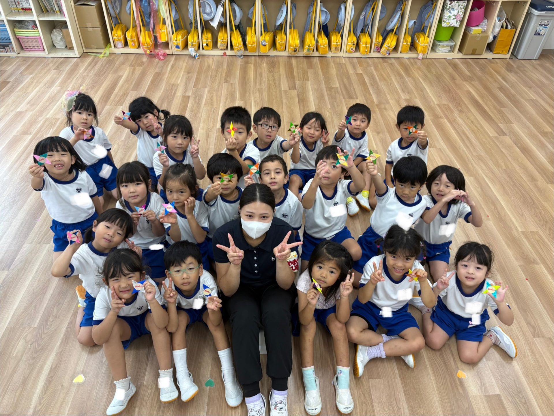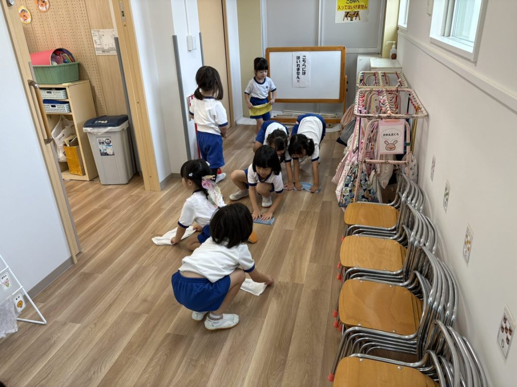 令和7年9月26日金曜日 きらりんタイム 週末の金曜日は、きらりんタイムでお部屋の掃除を頑張っています。雑巾がけも上手になってきました。(お部屋と廊下を掃除中♪) 運動会にむけてダンス練習も楽しんで取り組んでいます。(また、ダンスの様子も来週HPでお知らせしますね。) 実習の先生と一緒に作った”とんぼ”を飛ばして遊びました。本日、お荷物袋に入れて持ち帰っています。