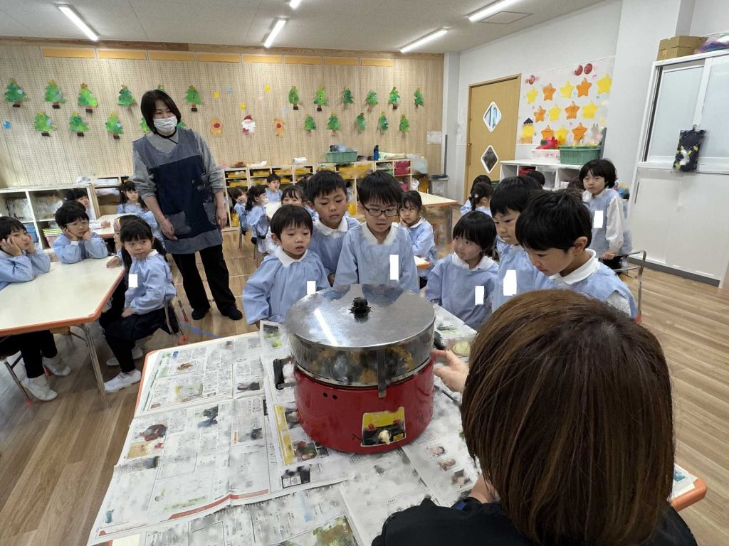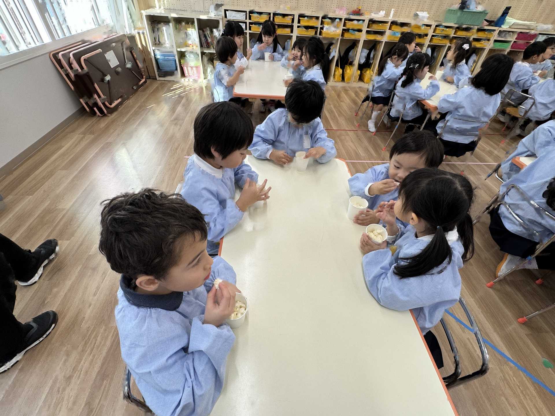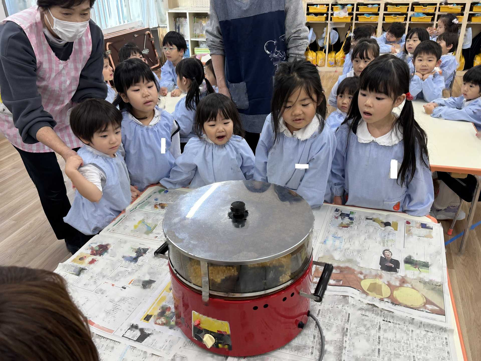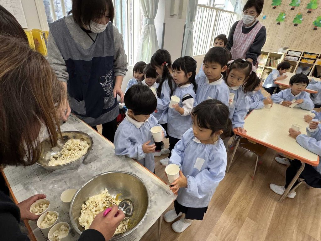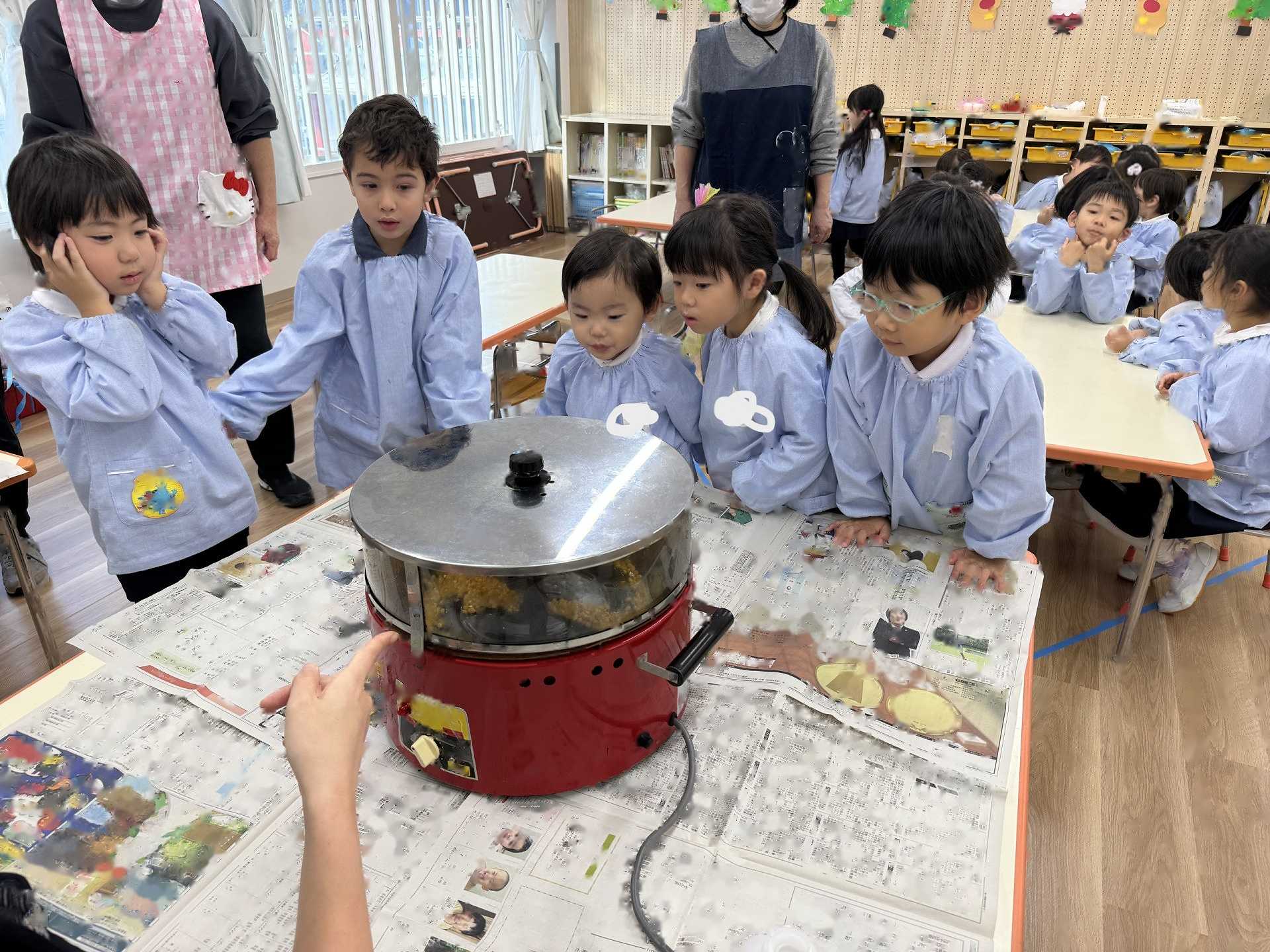 発表会では大勢のお客さまの前で素敵な姿を見せてくれた子ども達!ゆり組・りんご組一緒に発表会頑張りましたご褒美クッキングでポップコーンを食べました!ポップコーンは何からできるの?と聞かれると「コーン!!」「かたいやつ!」と何からポップコーンができるのかよく知っていました