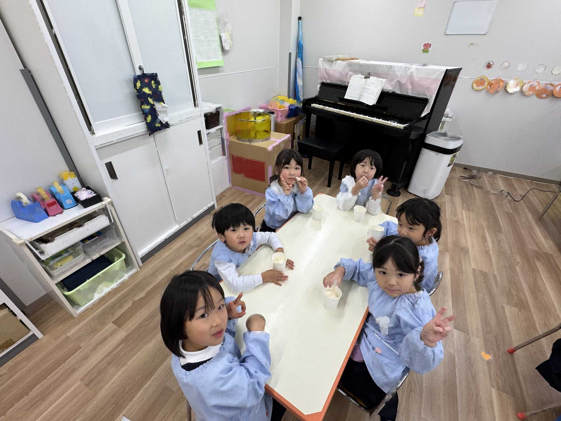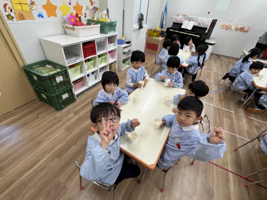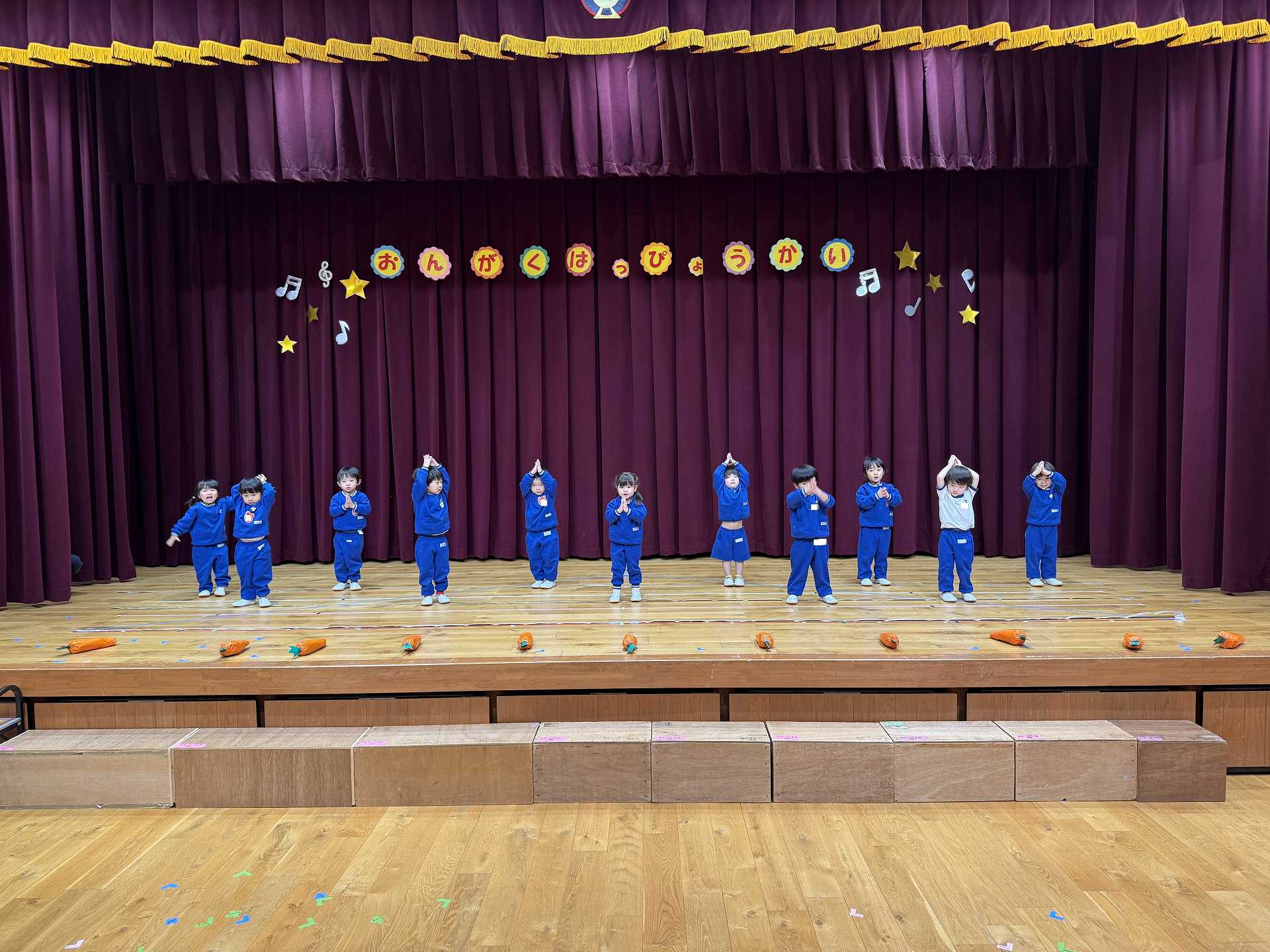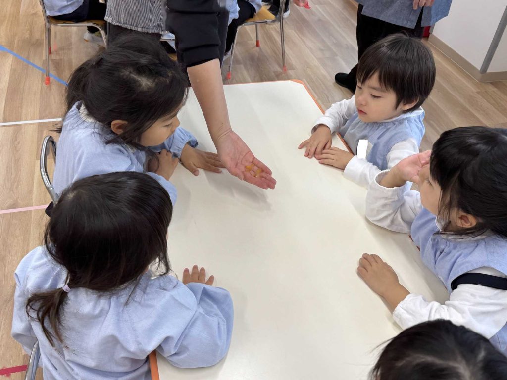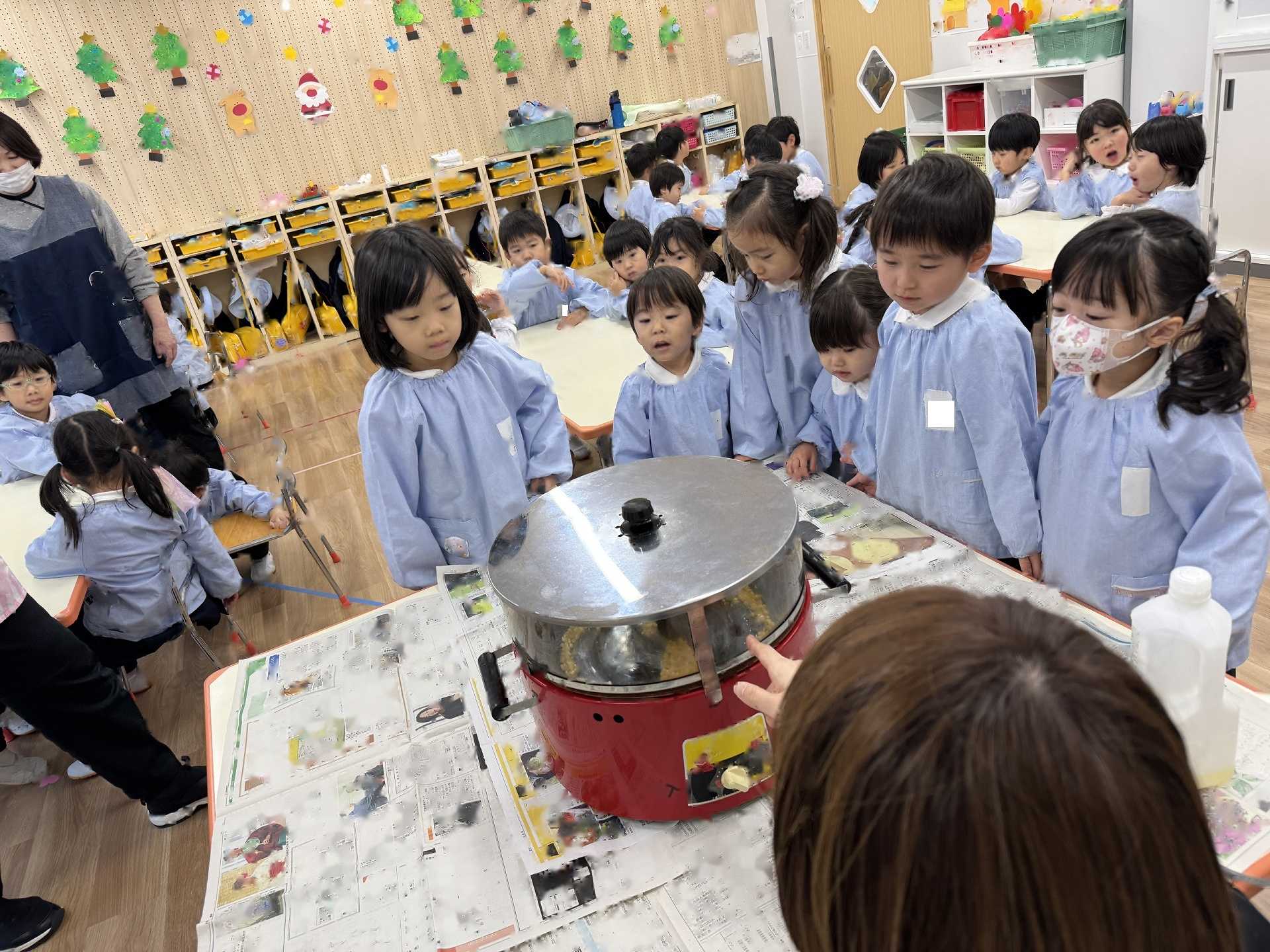 発表会では大勢のお客さまの前で素敵な姿を見せてくれた子ども達!ゆり組・りんご組一緒に発表会頑張りましたご褒美クッキングでポップコーンを食べました!ポップコーンは何からできるの?と聞かれると「コーン!!」「かたいやつ!」と何からポップコーンができるのかよく知っていました