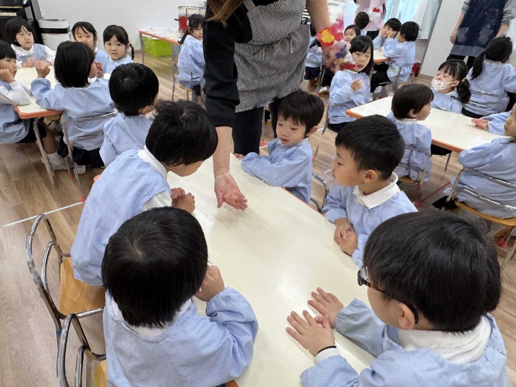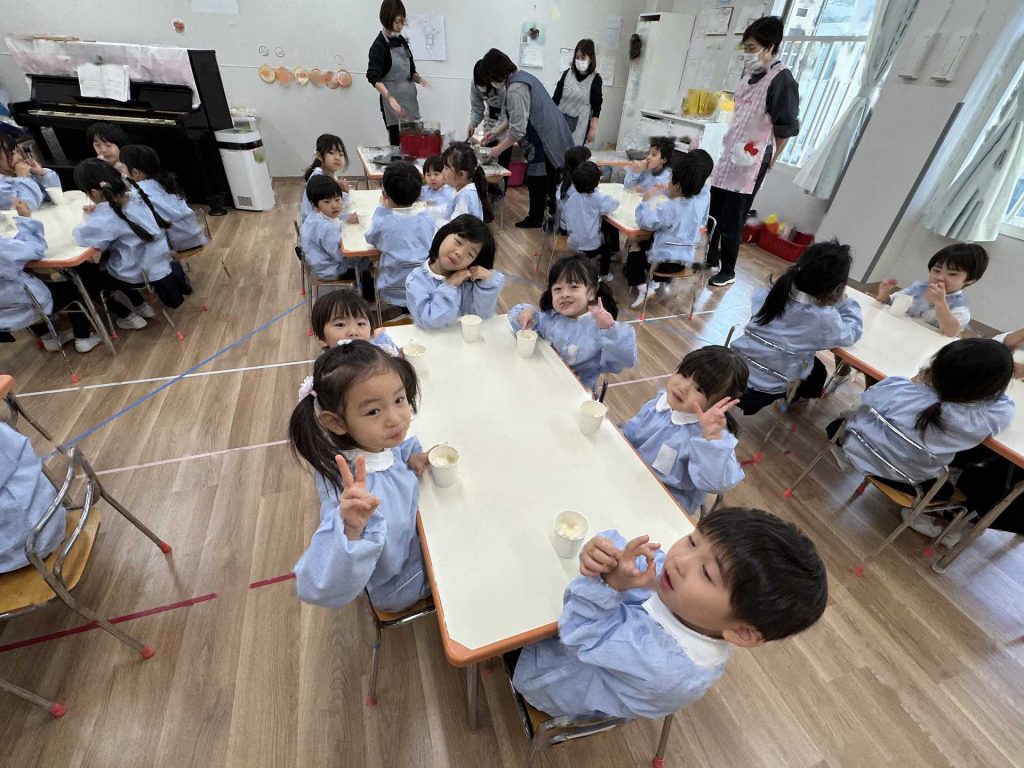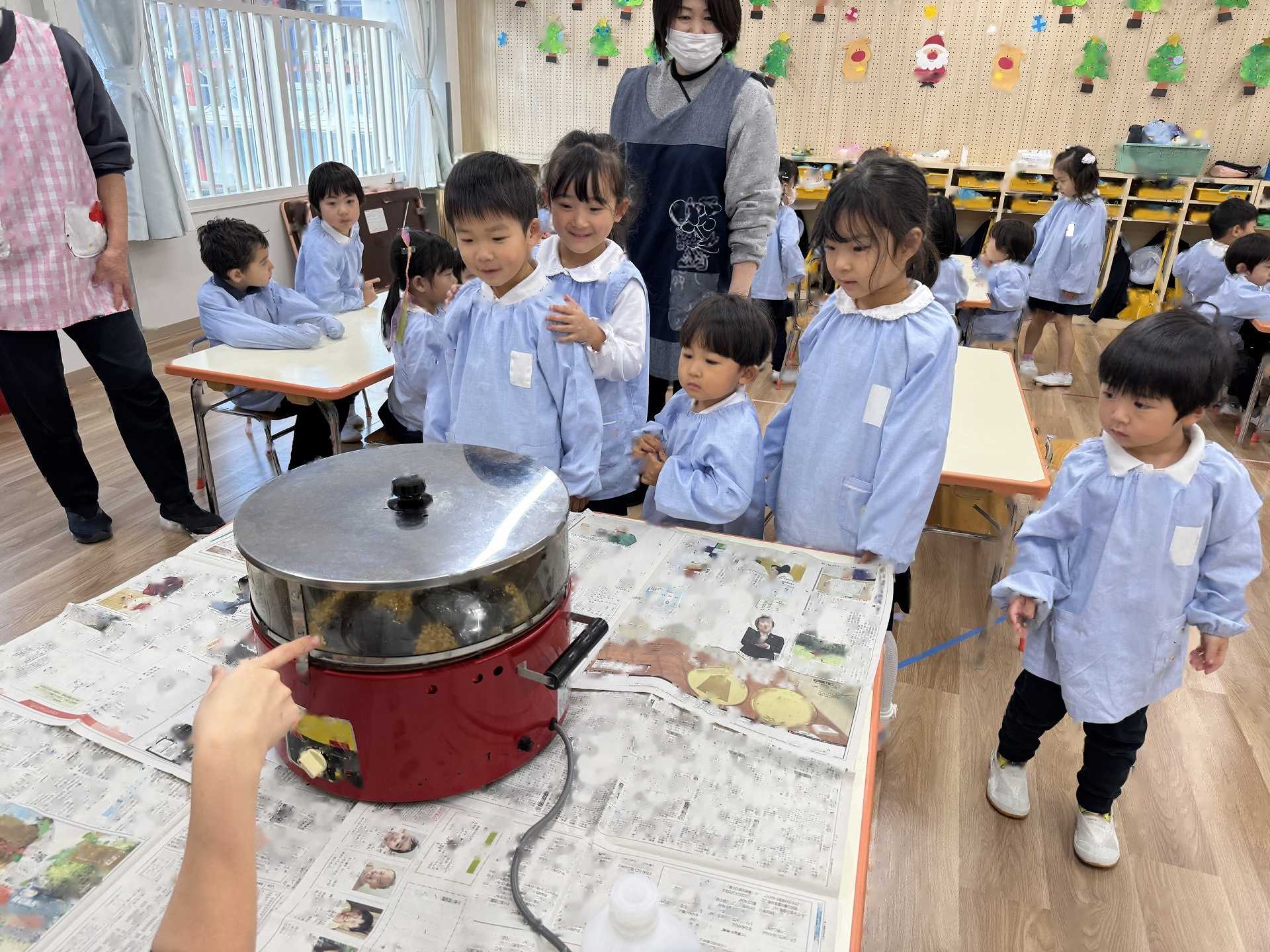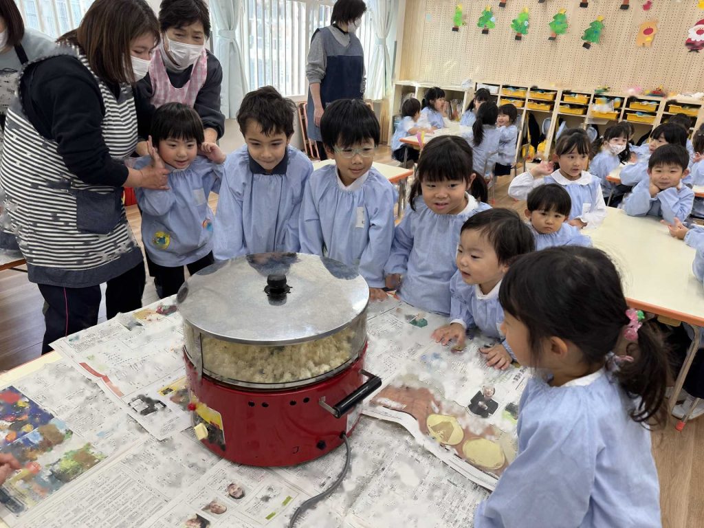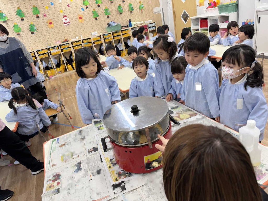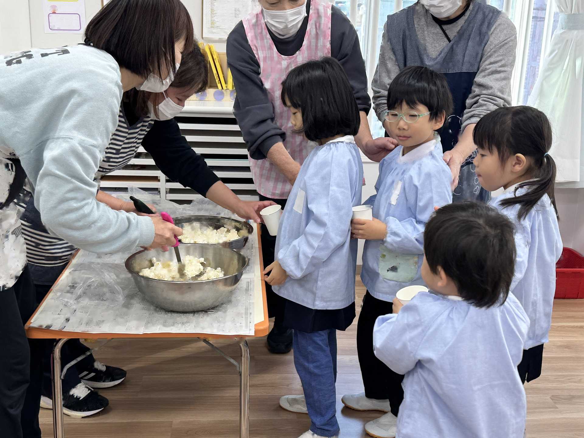発表会では大勢のお客さまの前で素敵な姿を見せてくれた子ども達!ゆり組・りんご組一緒に発表会頑張りましたご褒美クッキングでポップコーンを食べました!ポップコーンは何からできるの?と聞かれると「コーン!!」「かたいやつ!」と何からポップコーンができるのかよく知っていました