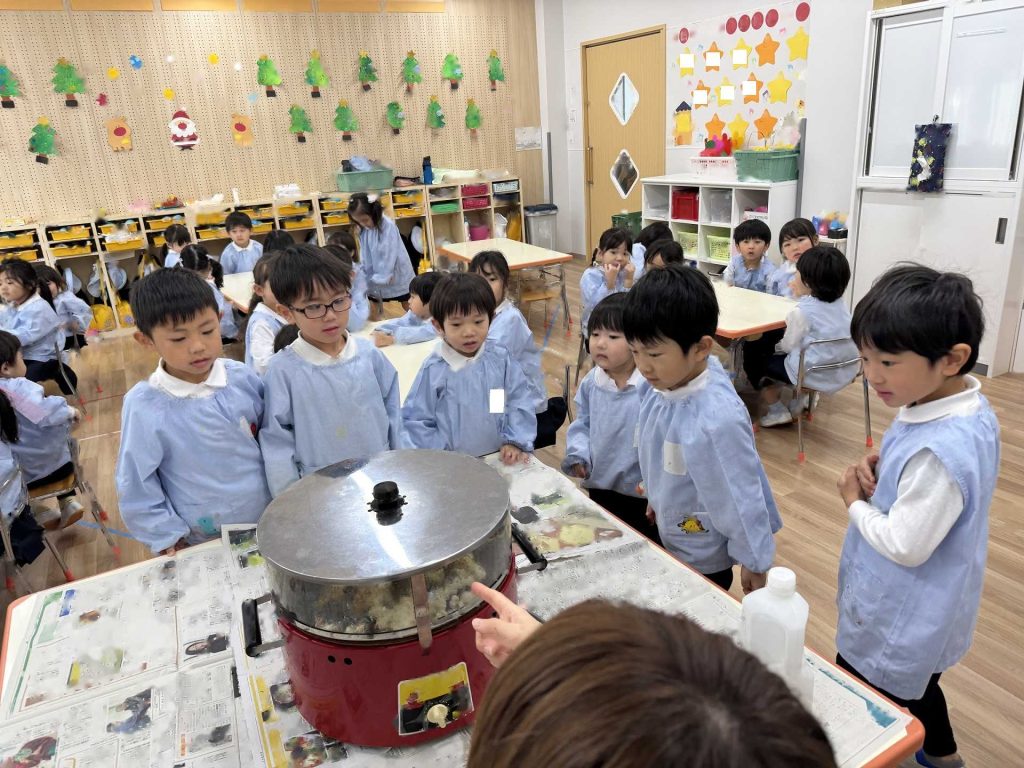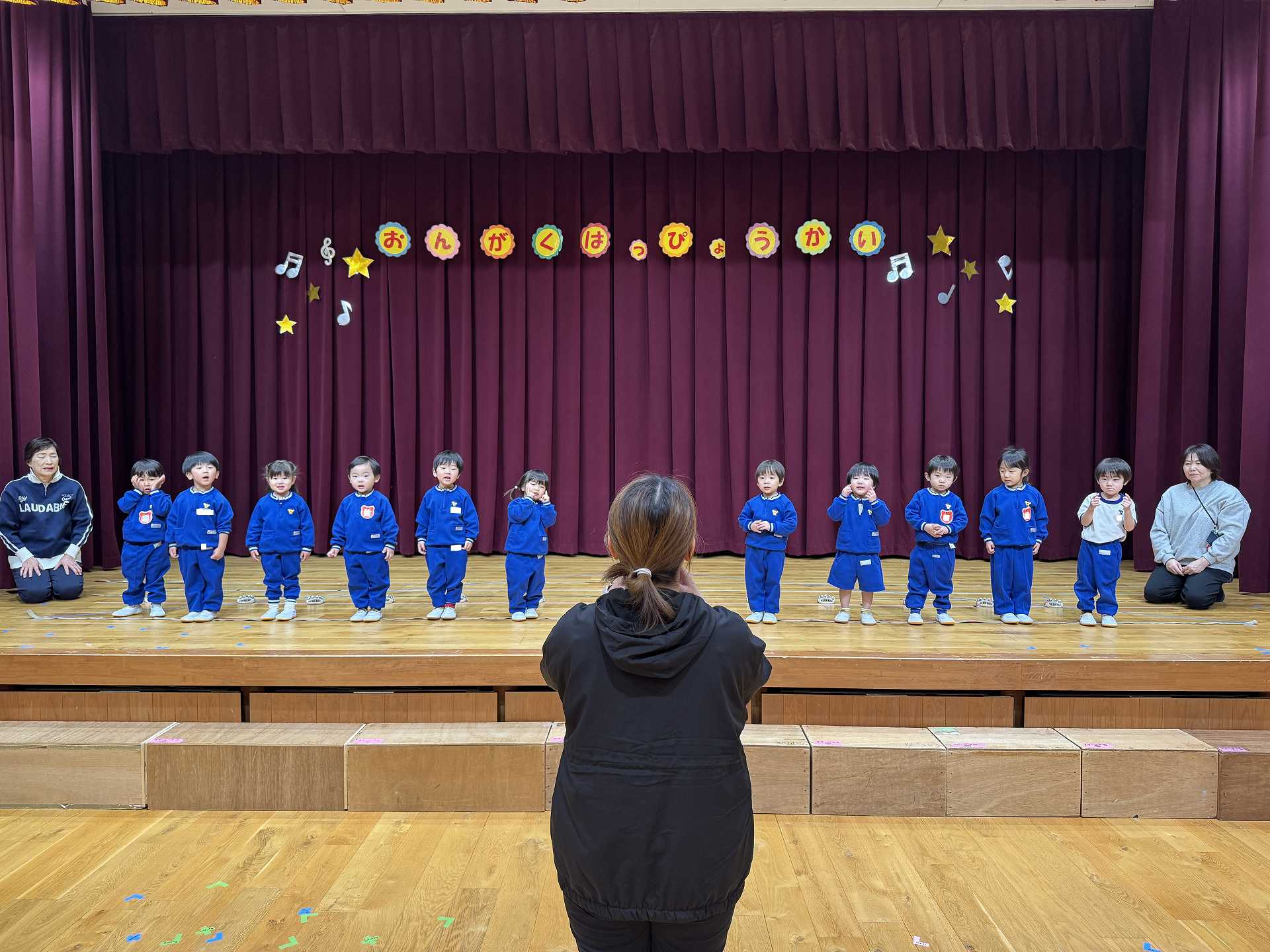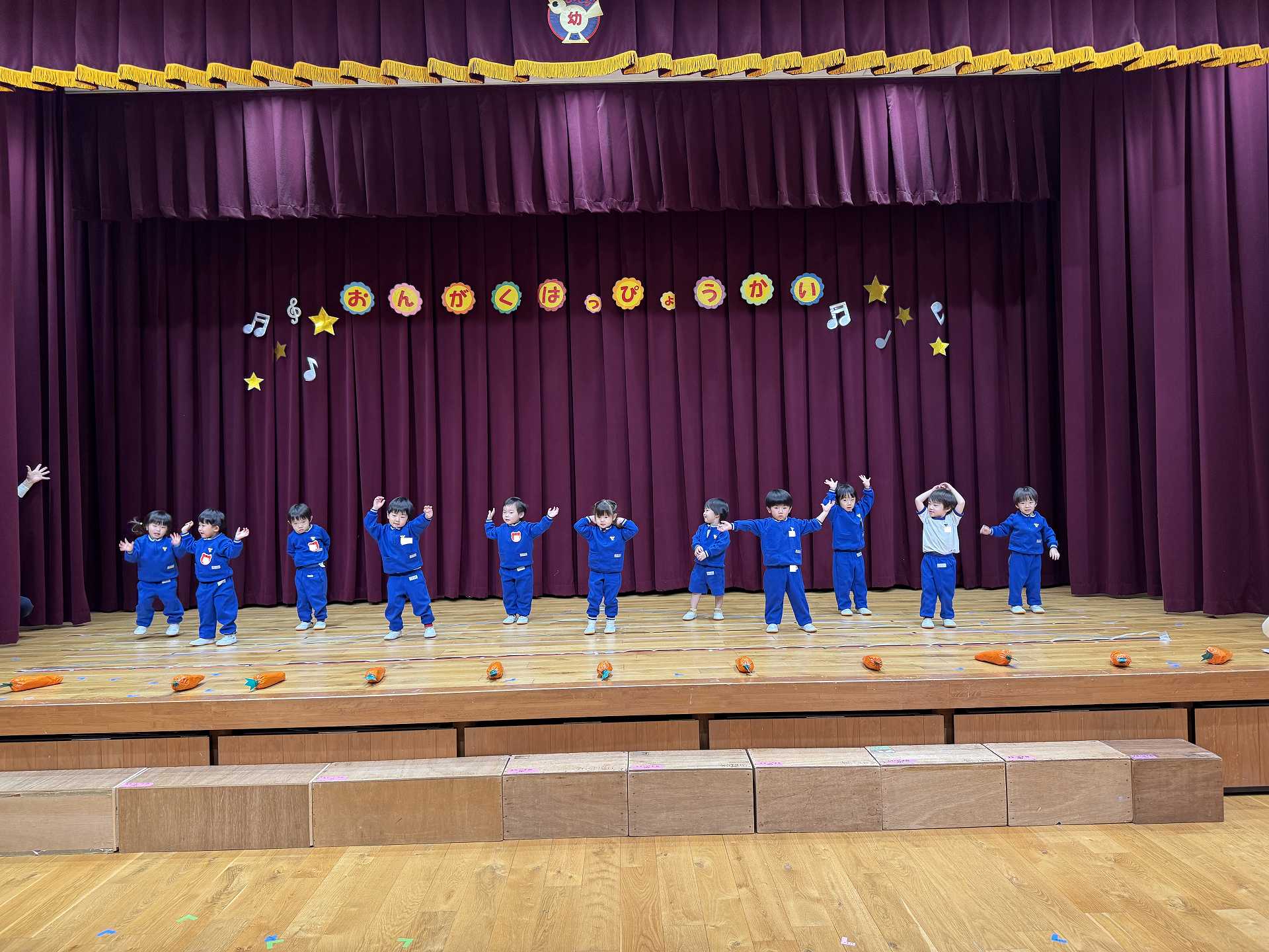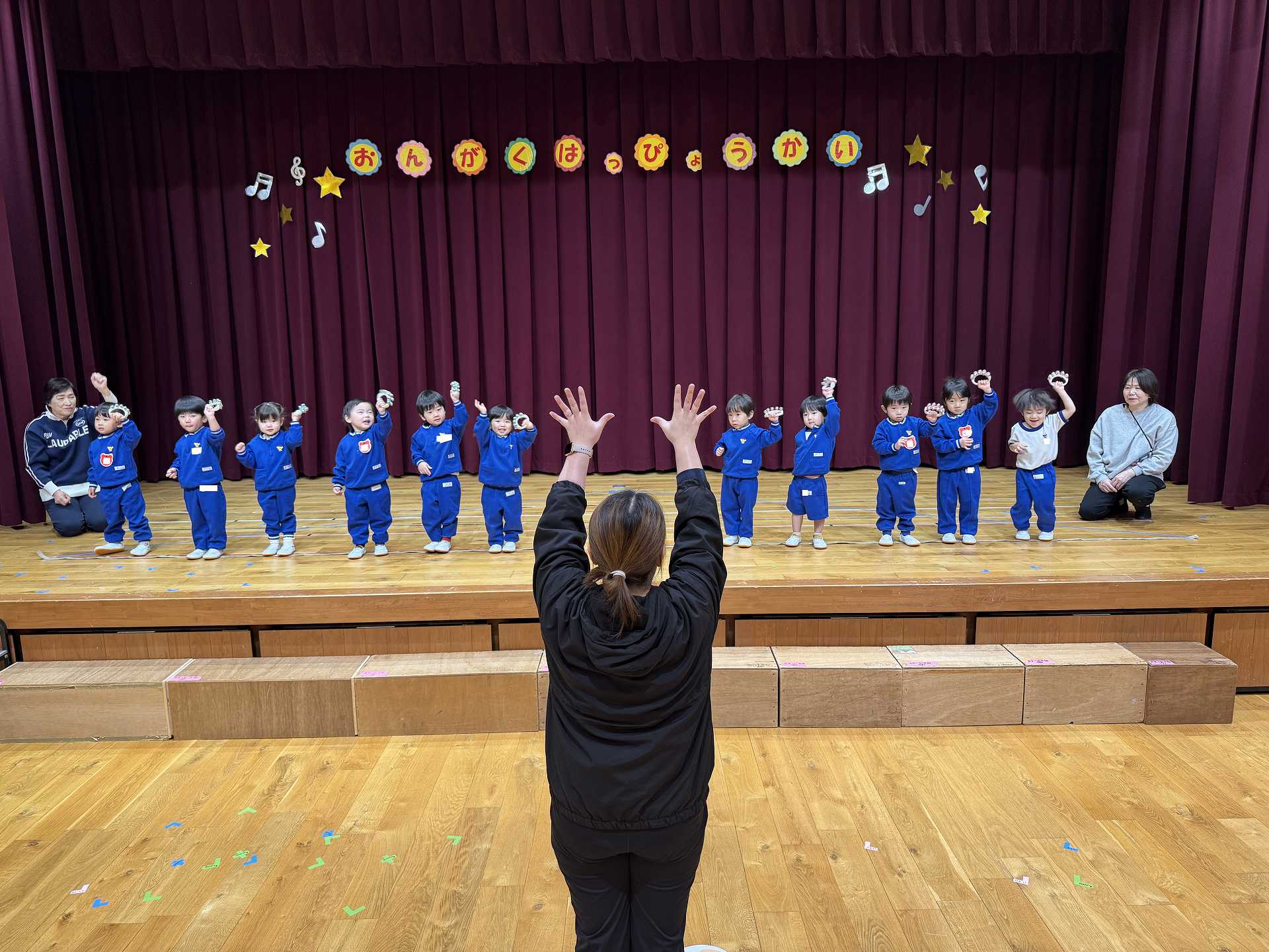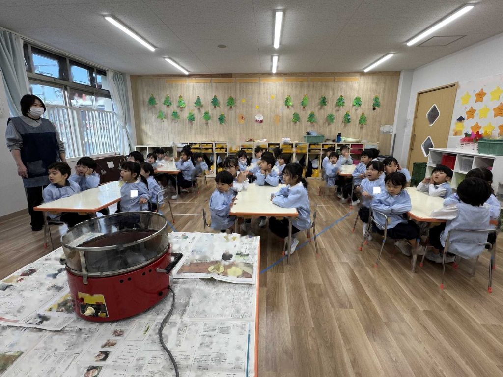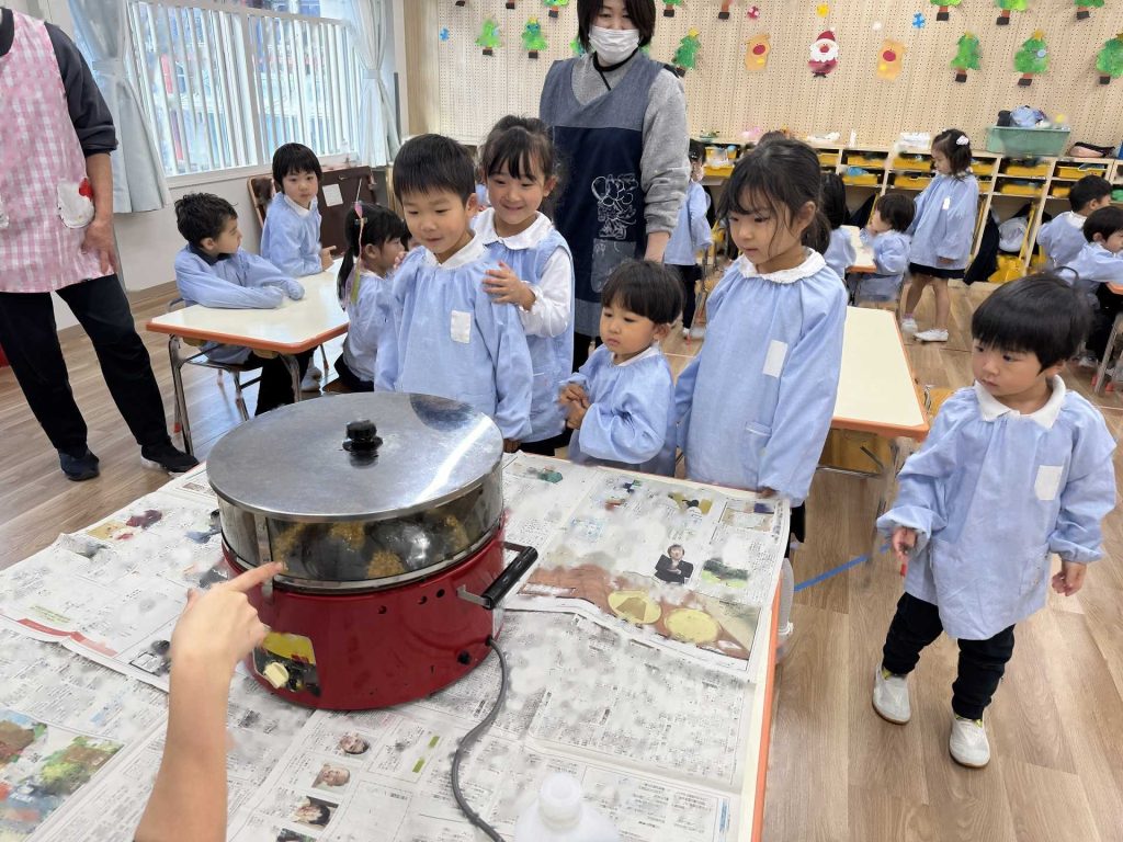 発表会では大勢のお客さまの前で素敵な姿を見せてくれた子ども達!ゆり組・りんご組一緒に発表会頑張りましたご褒美クッキングでポップコーンを食べました!ポップコーンは何からできるの?と聞かれると「コーン!!」「かたいやつ!」と何からポップコーンができるのかよく知っていました