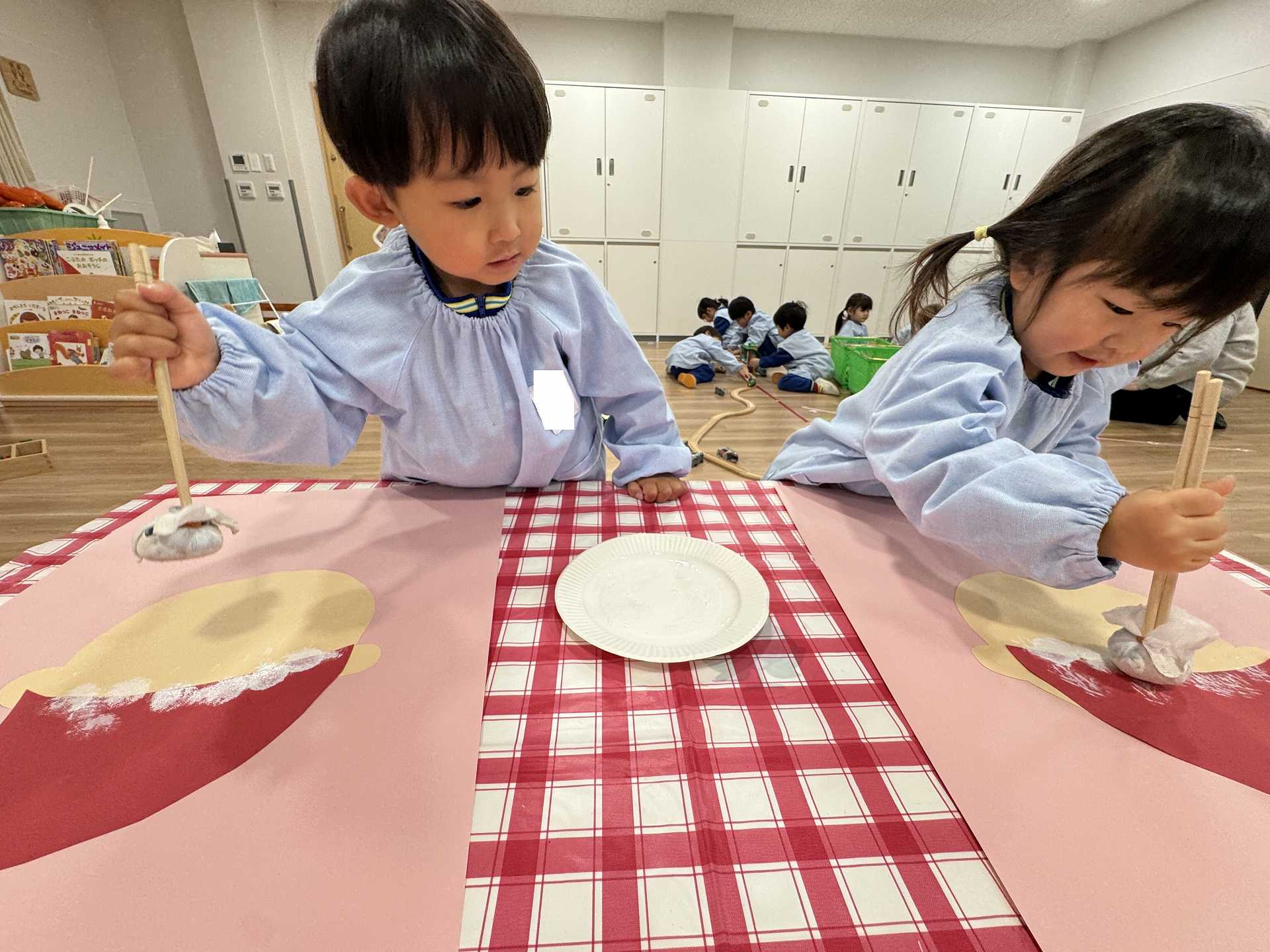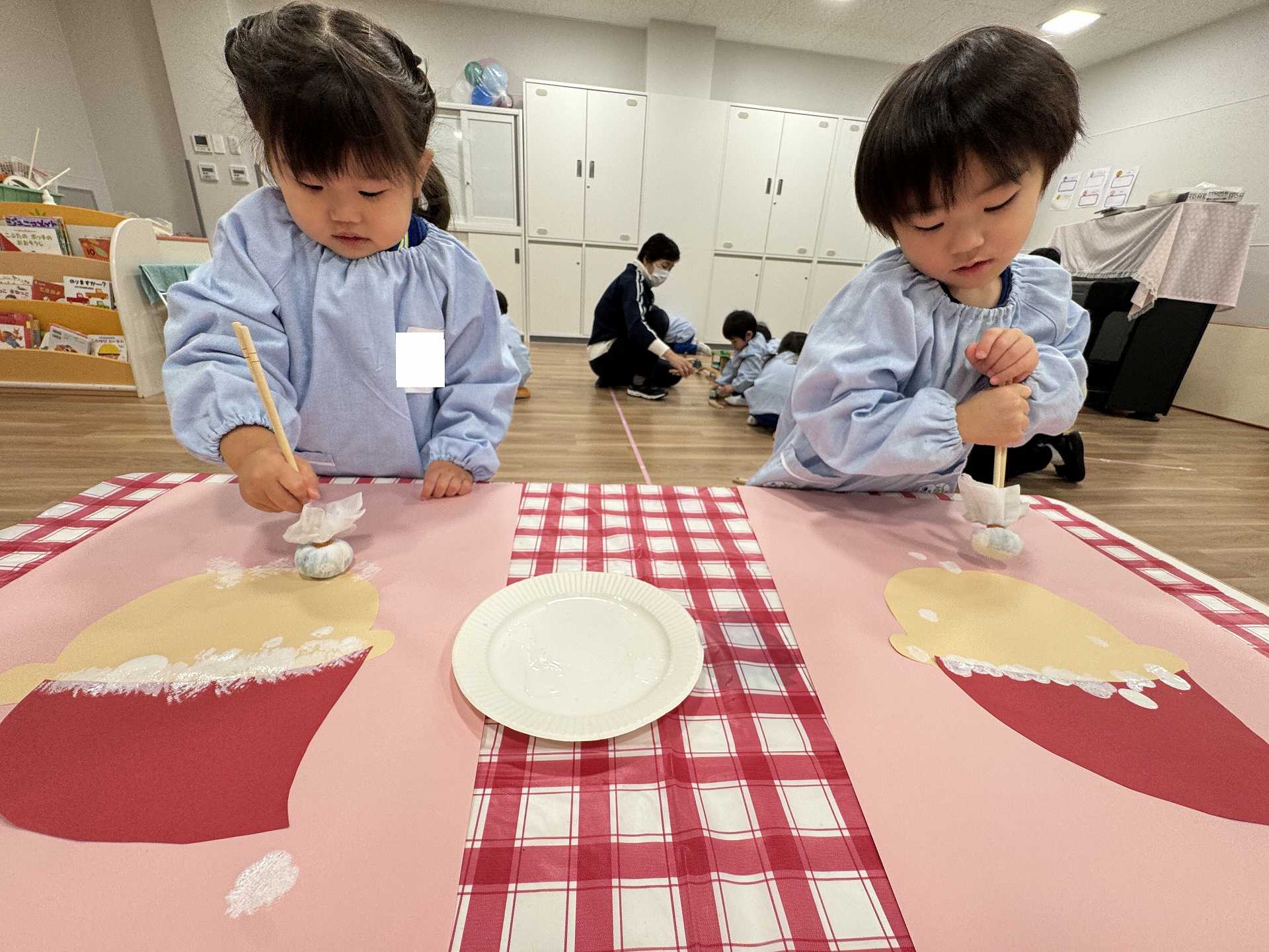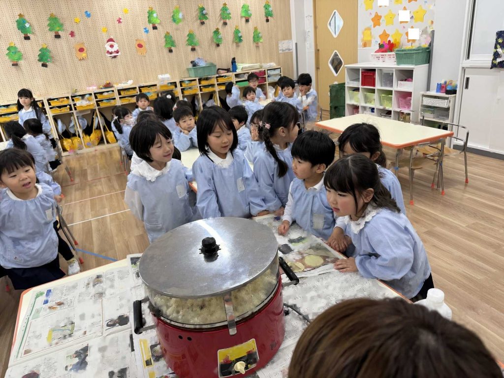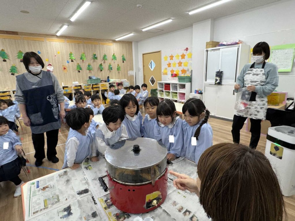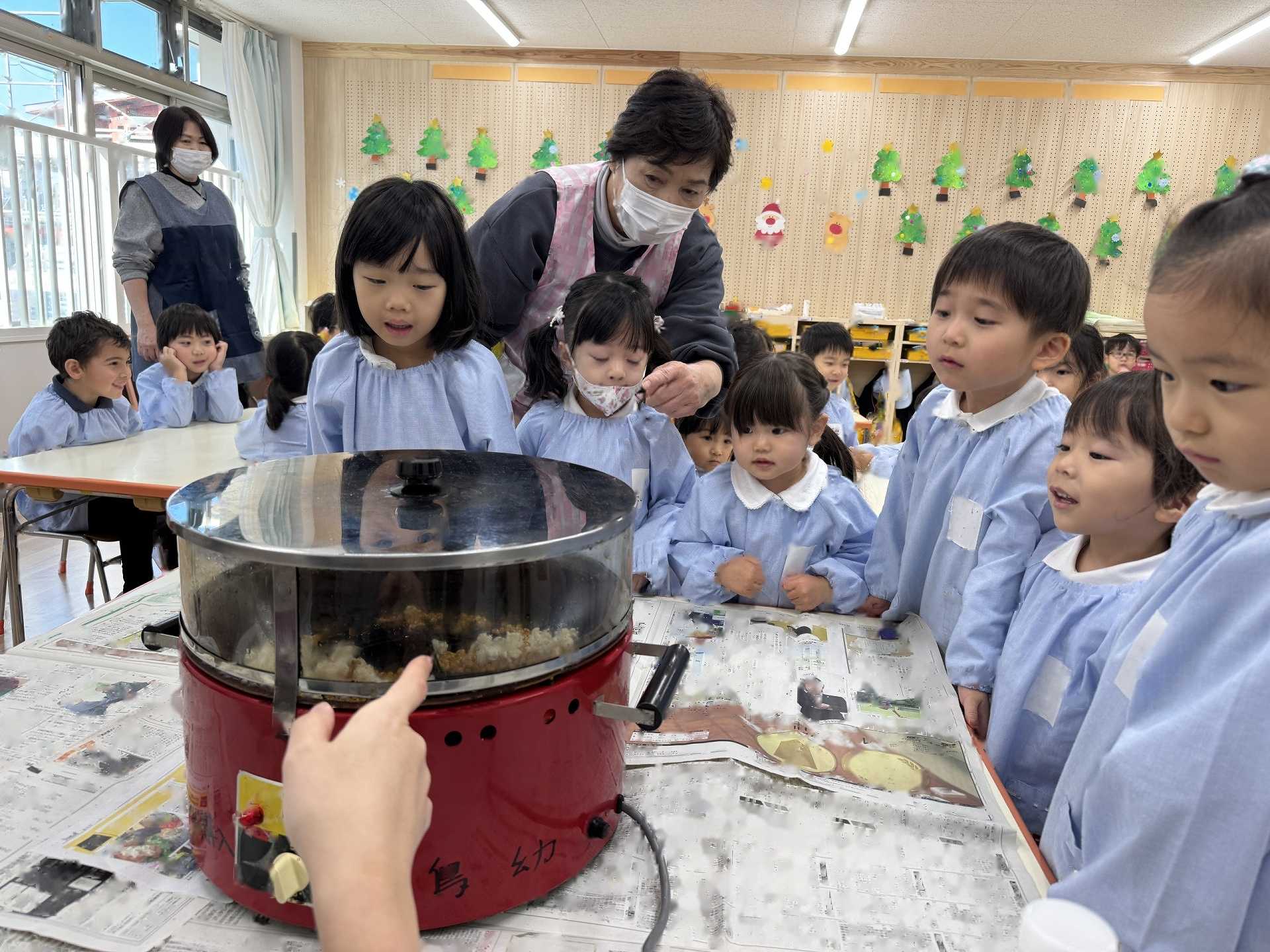 発表会では大勢のお客さまの前で素敵な姿を見せてくれた子ども達!ゆり組・りんご組一緒に発表会頑張りましたご褒美クッキングでポップコーンを食べました!ポップコーンは何からできるの?と聞かれると「コーン!!」「かたいやつ!」と何からポップコーンができるのかよく知っていました