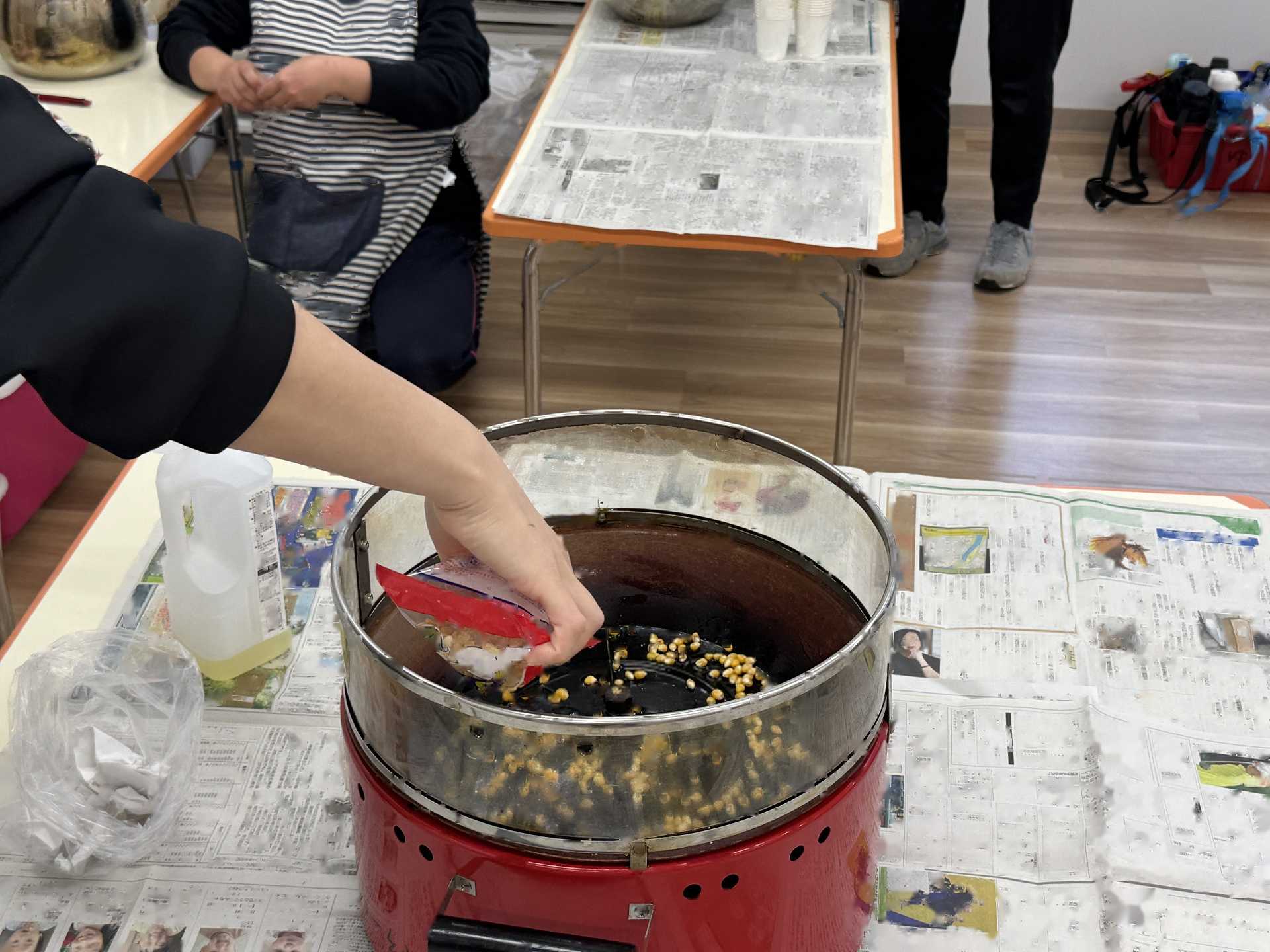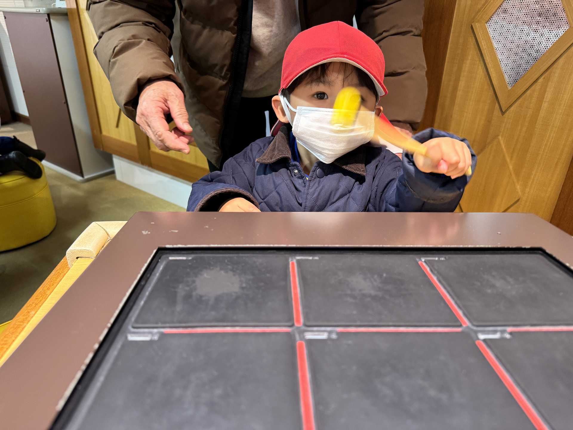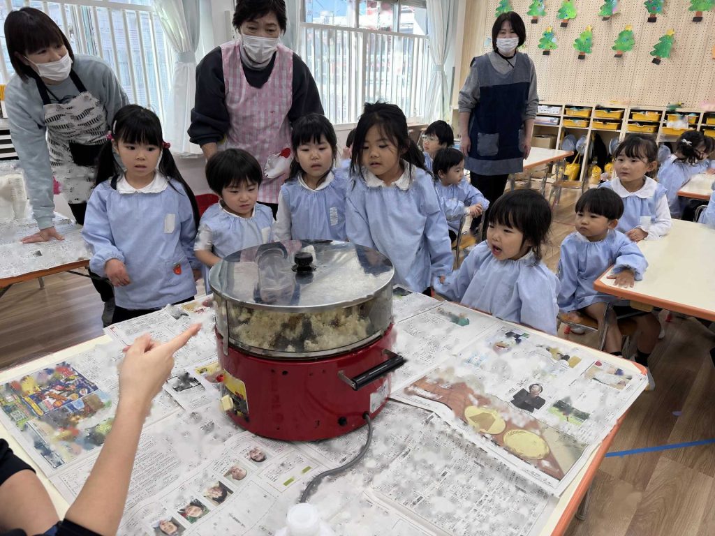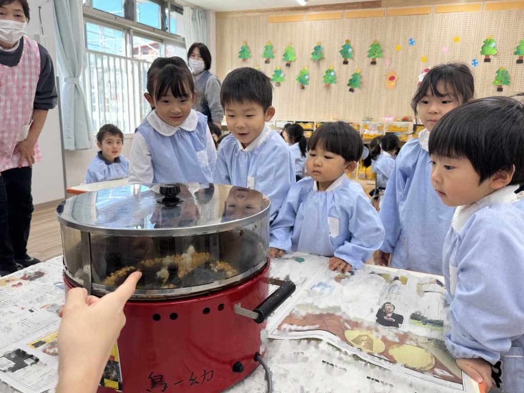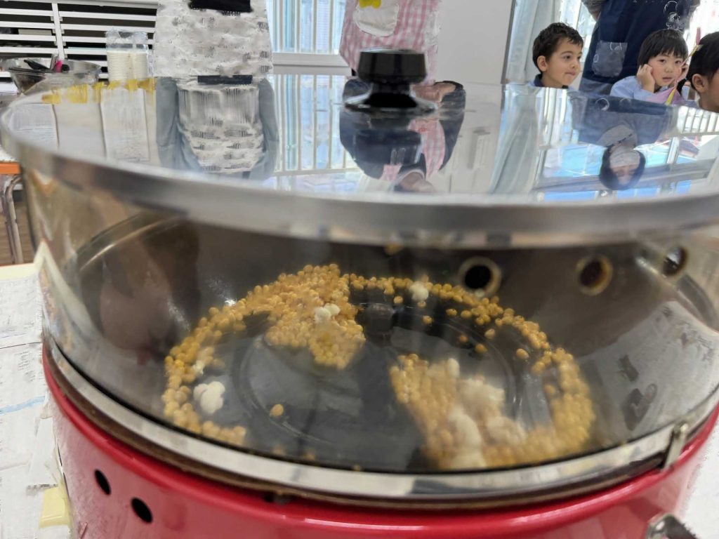 静かにしていると・・・「ポンッ!ポンッ!」とはじける音が聴こえて、子ども達は大興奮!!機械の中ではじける様子に目をキラキラさせていました♪