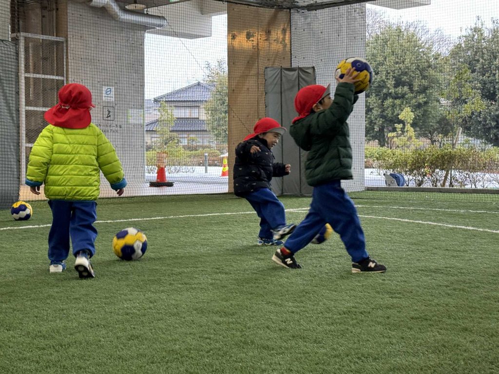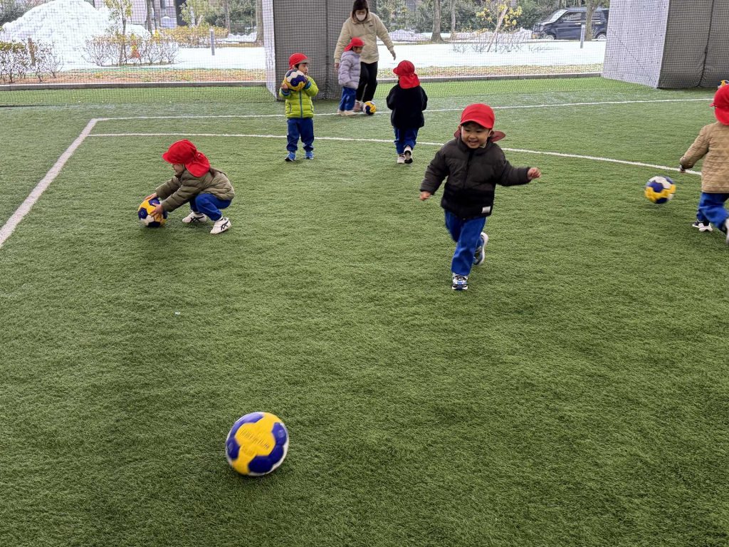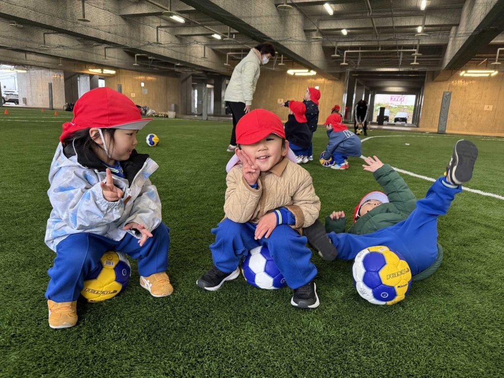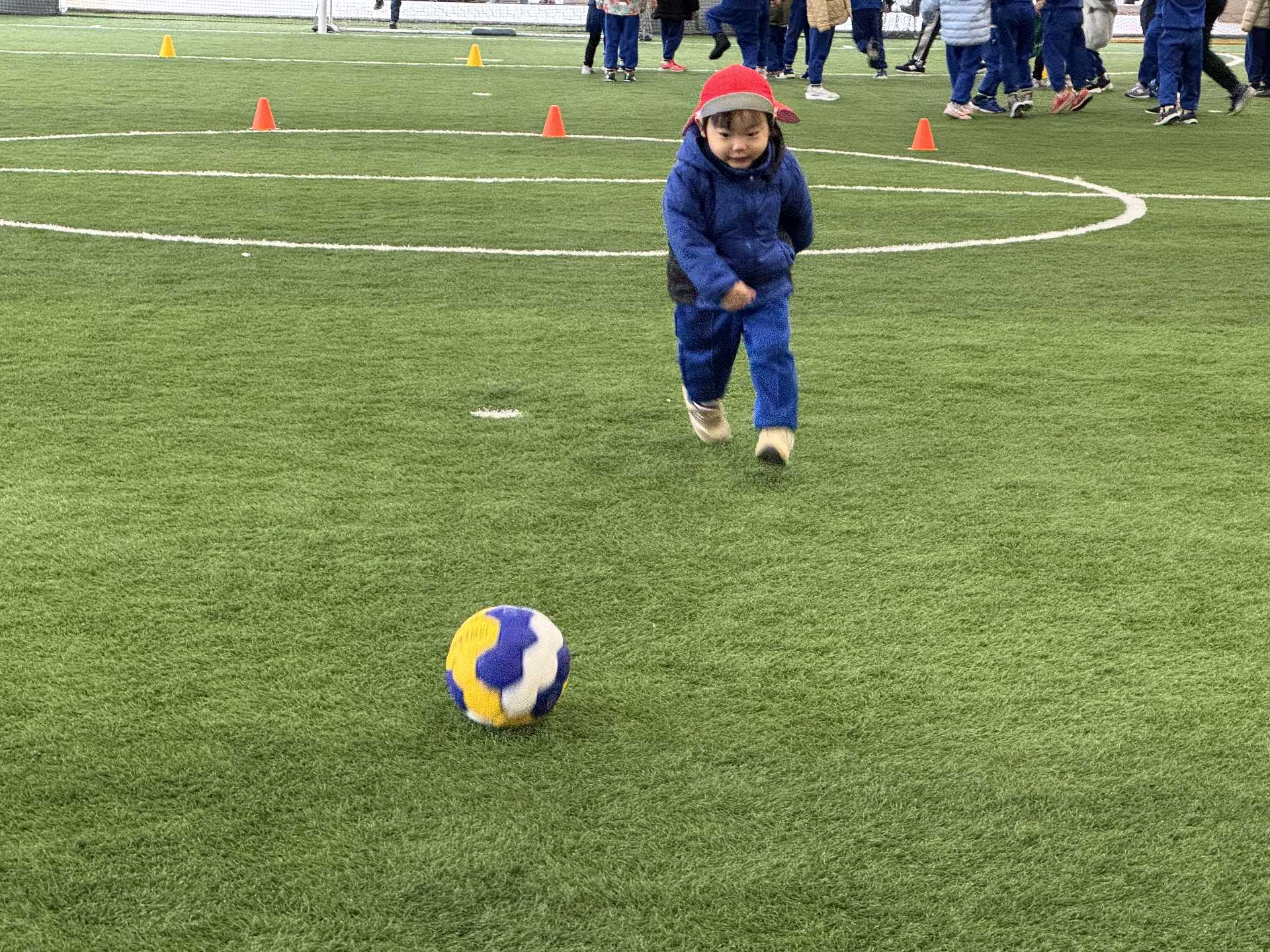 子ども達の楽しみにしていたボールを使って遊びました。ボールを蹴って追いかけて、投げて、ボールに座ってみたりと思い思いに遊びを楽しんでいました!