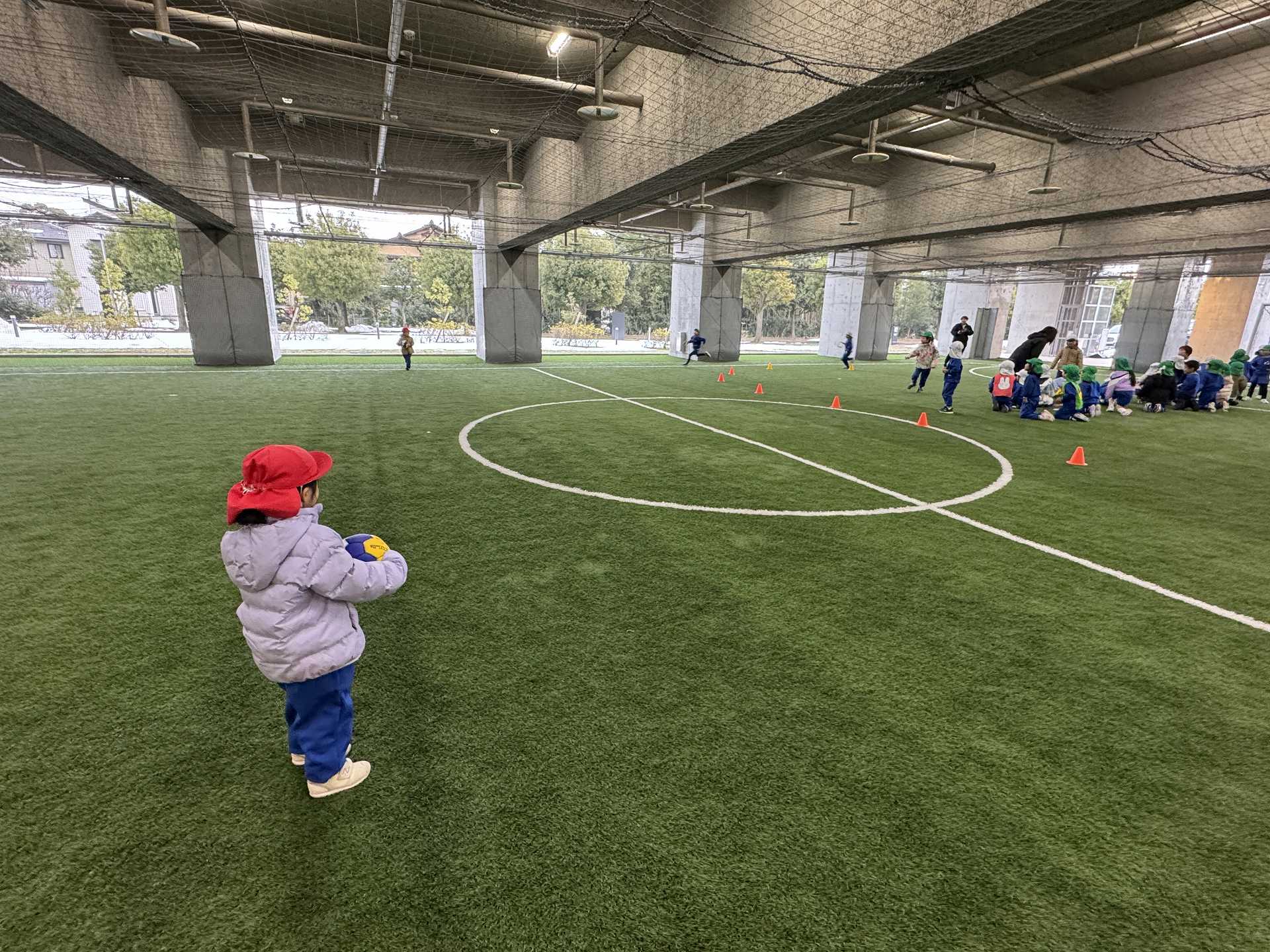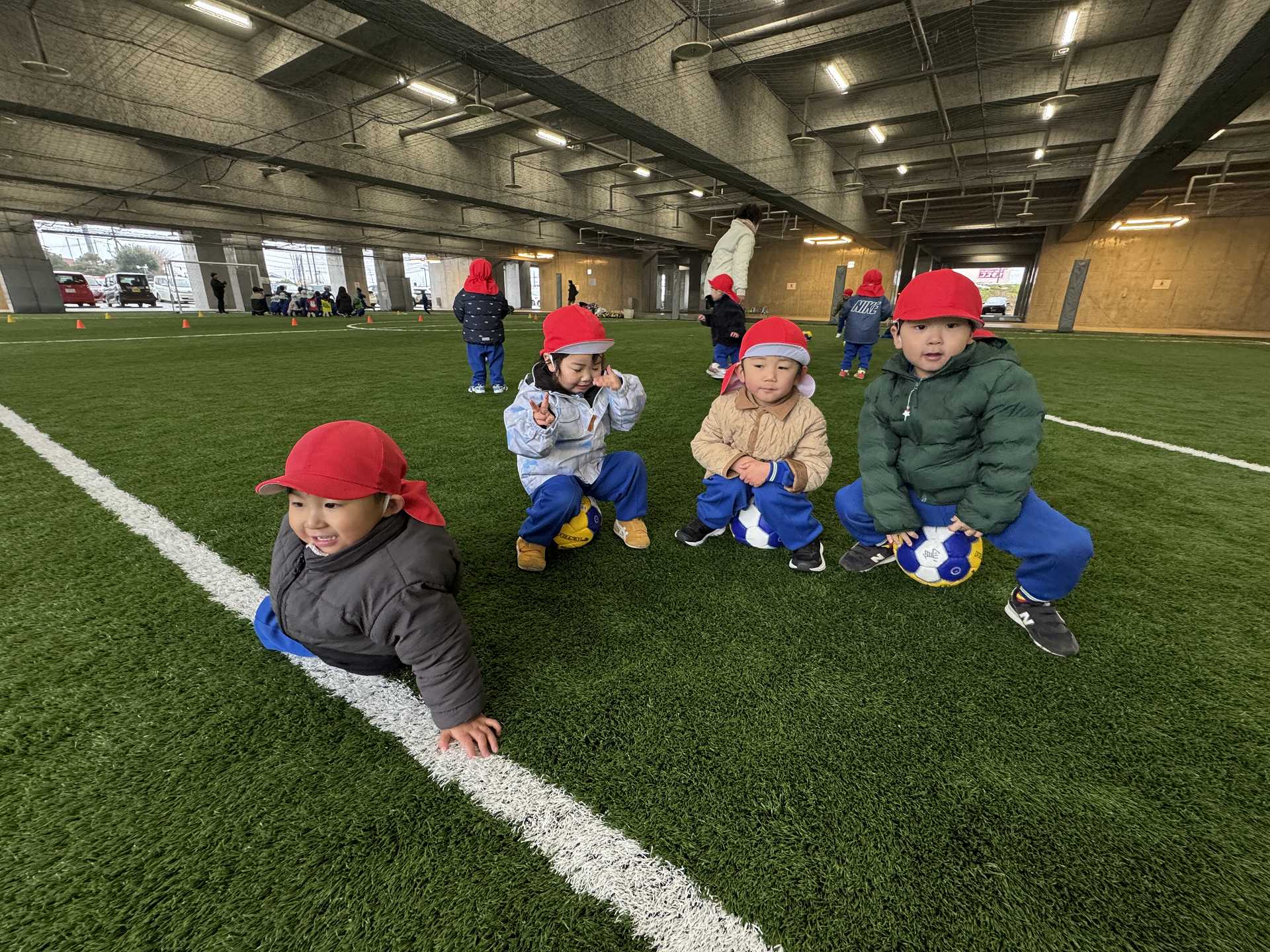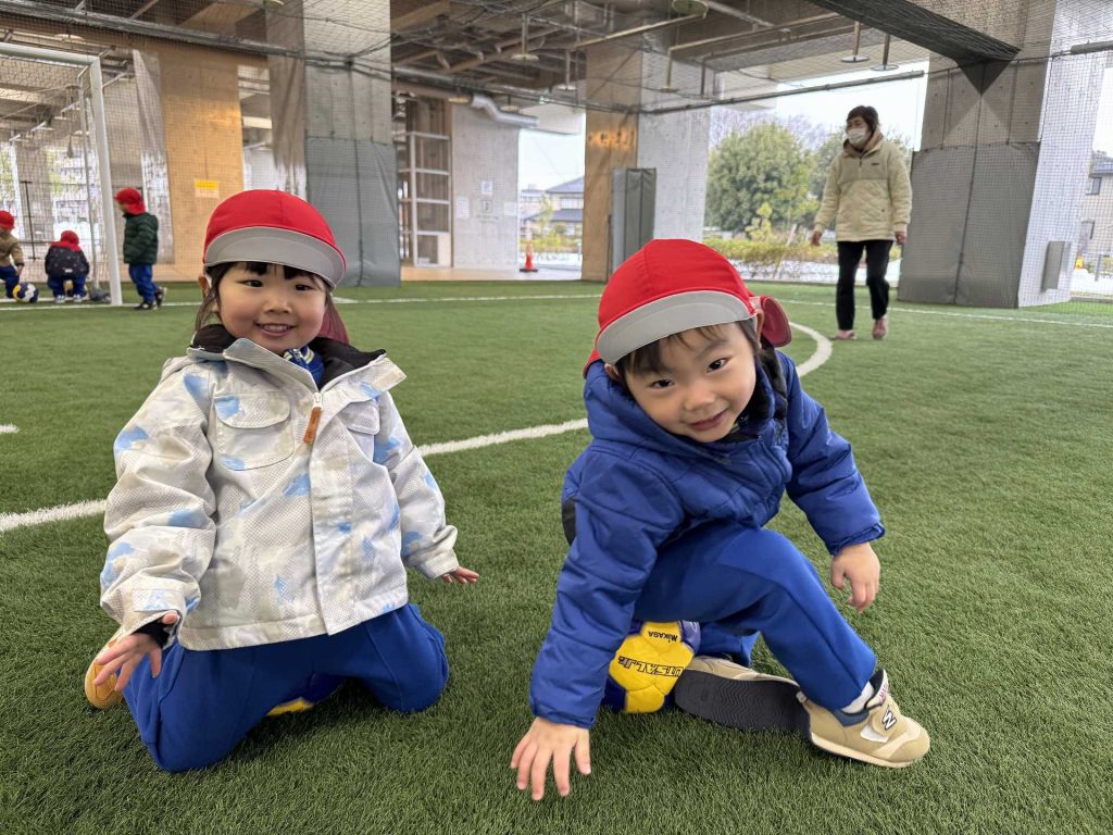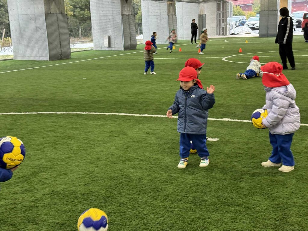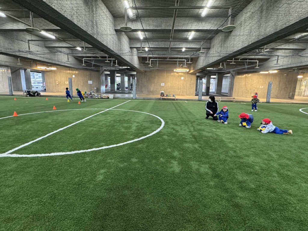 年長組さんと一緒に市民体育館のフットサル場にお出掛けしました!年長組さんと初めての園外保育で少し緊張している様子の子ども達でした。フットサル場に到着して、まずは準備体操!!たくさん動くためにしっかり体操をします!