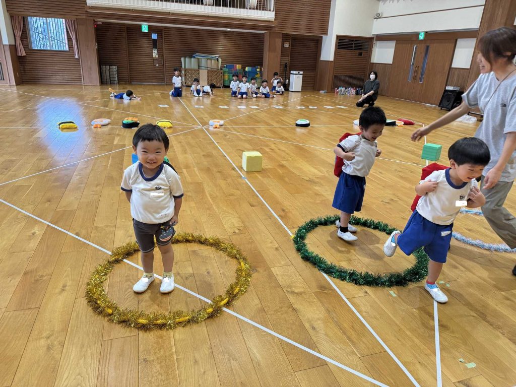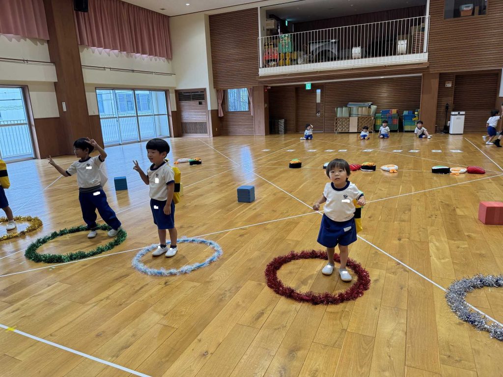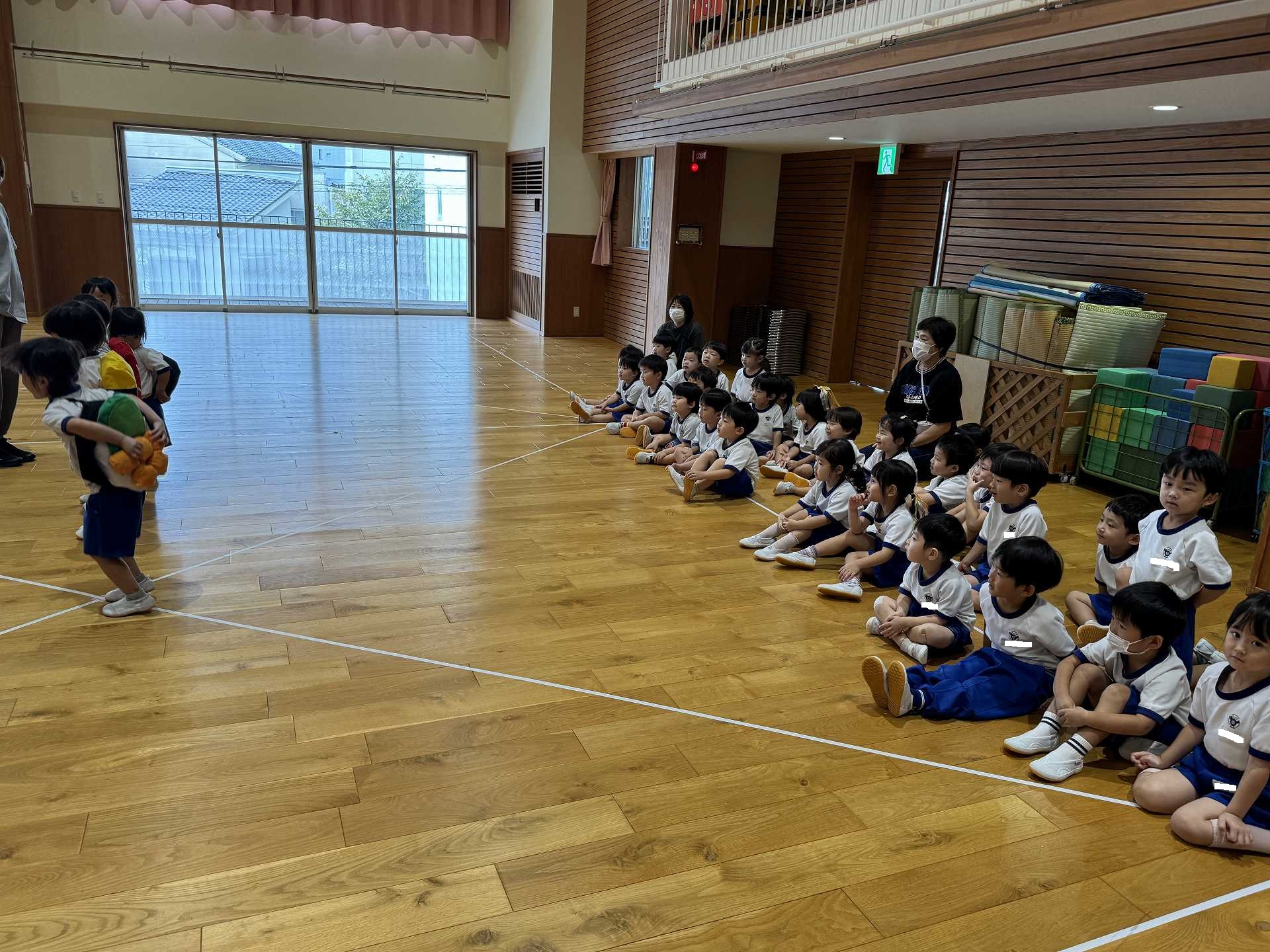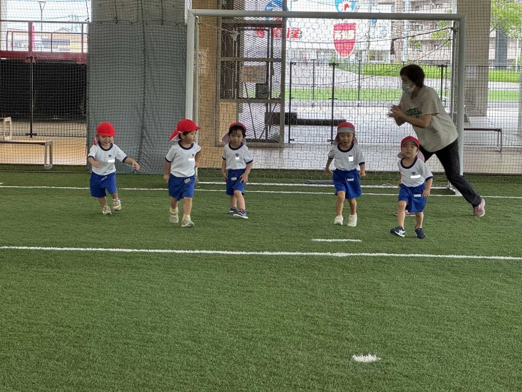 令和7年9月17日水曜日 ☆運動会練習☆ 年中組さんと一緒に市民体育館のフットサル場に出かけました!まずは一緒に体操!! その後のかけっこでは、ゴールにお兄さん・お姉さんが待っていてくれて、ゴールするとギュー!!と抱きしめてくれました。嬉しいけど少し恥ずかしそうな子ども達でした♪ 運動会のダンスも見てもらい、ジャンプがかわいかった!手を振るのがかわいかった!と褒めてもらいました☆年中さんのダンスも見せてもらい、かっこいい姿に興味津々な子ども達でした♪ 最後はボールで遊んだり、走ったりして楽しみました!!