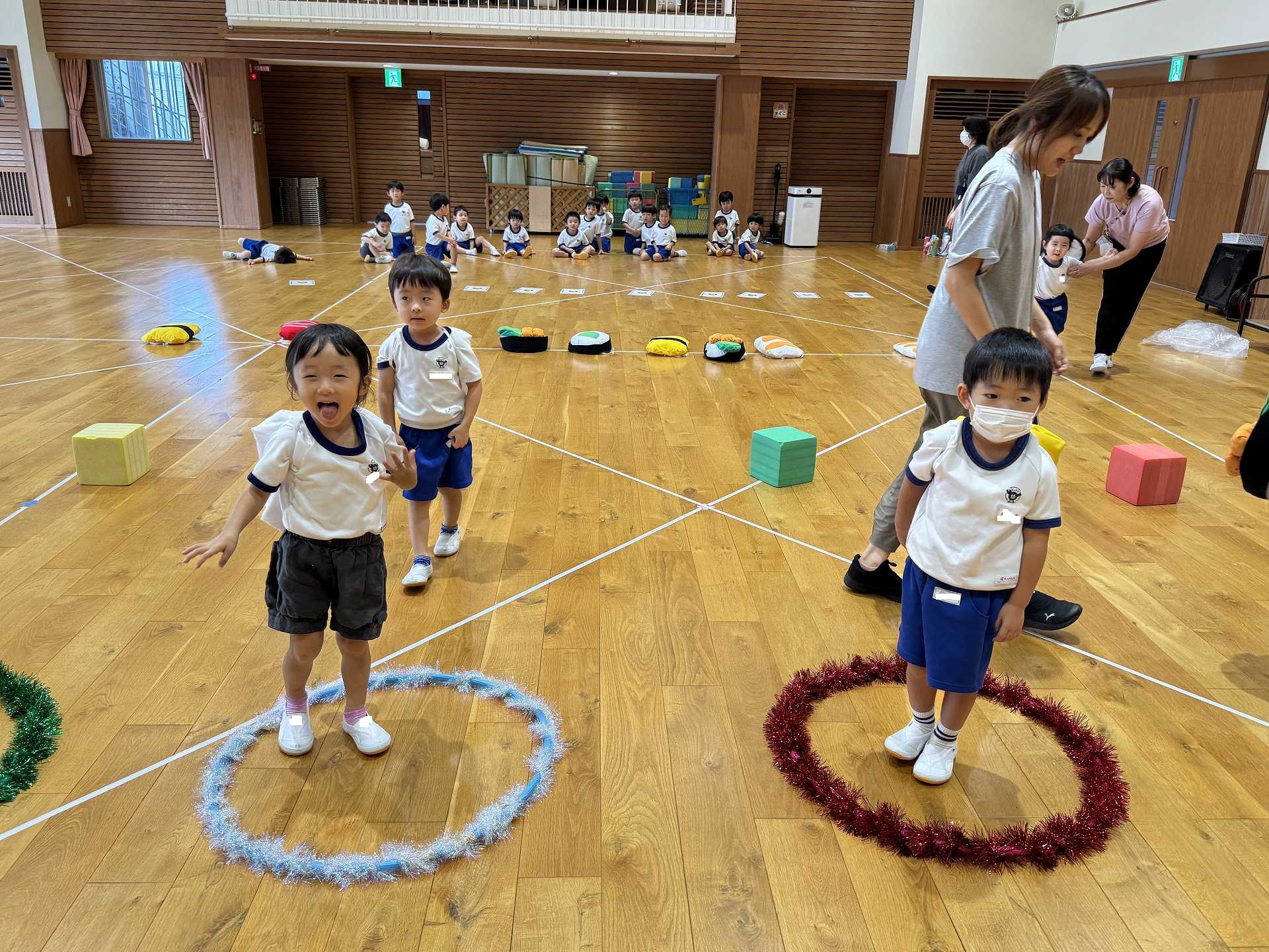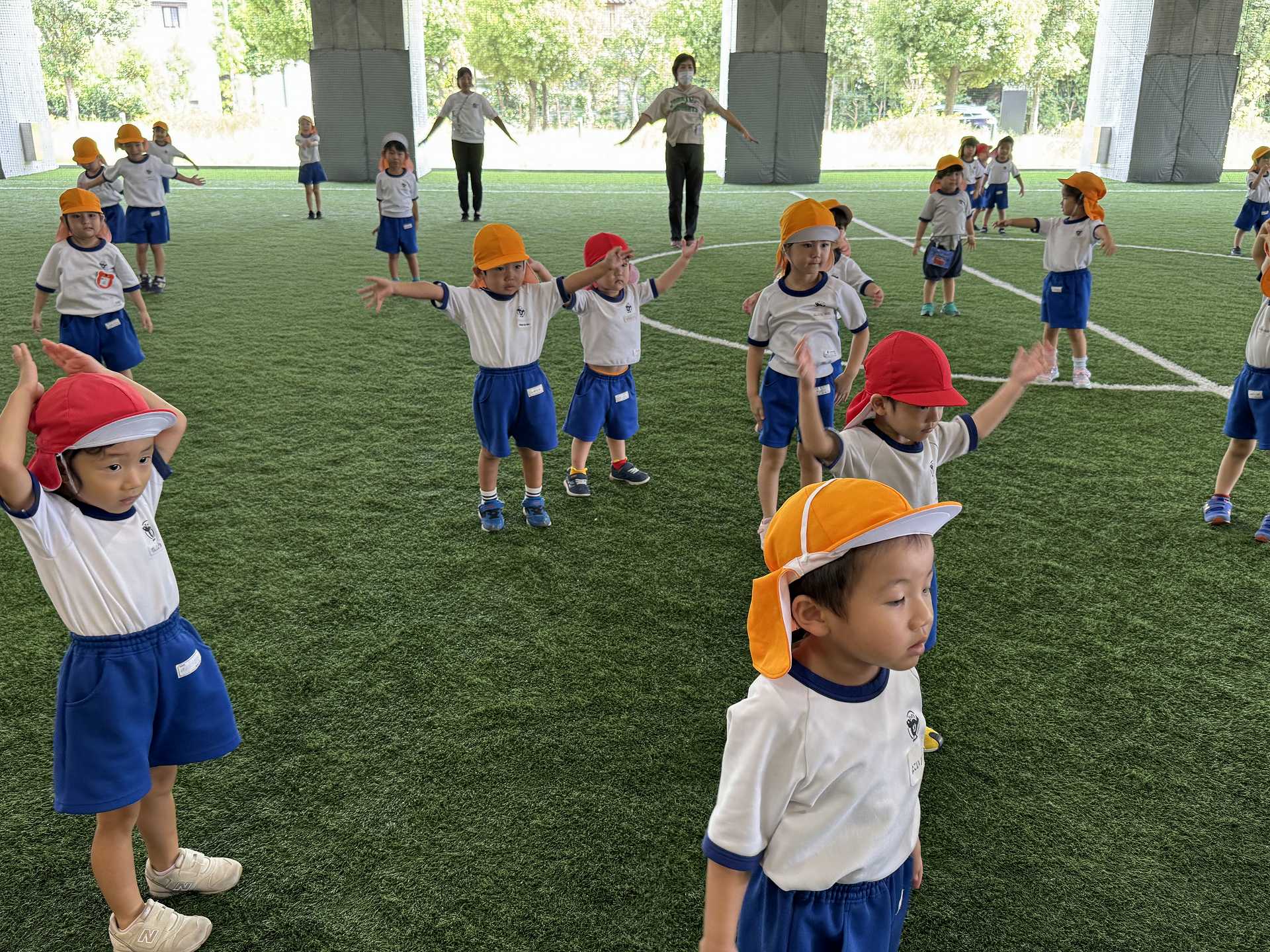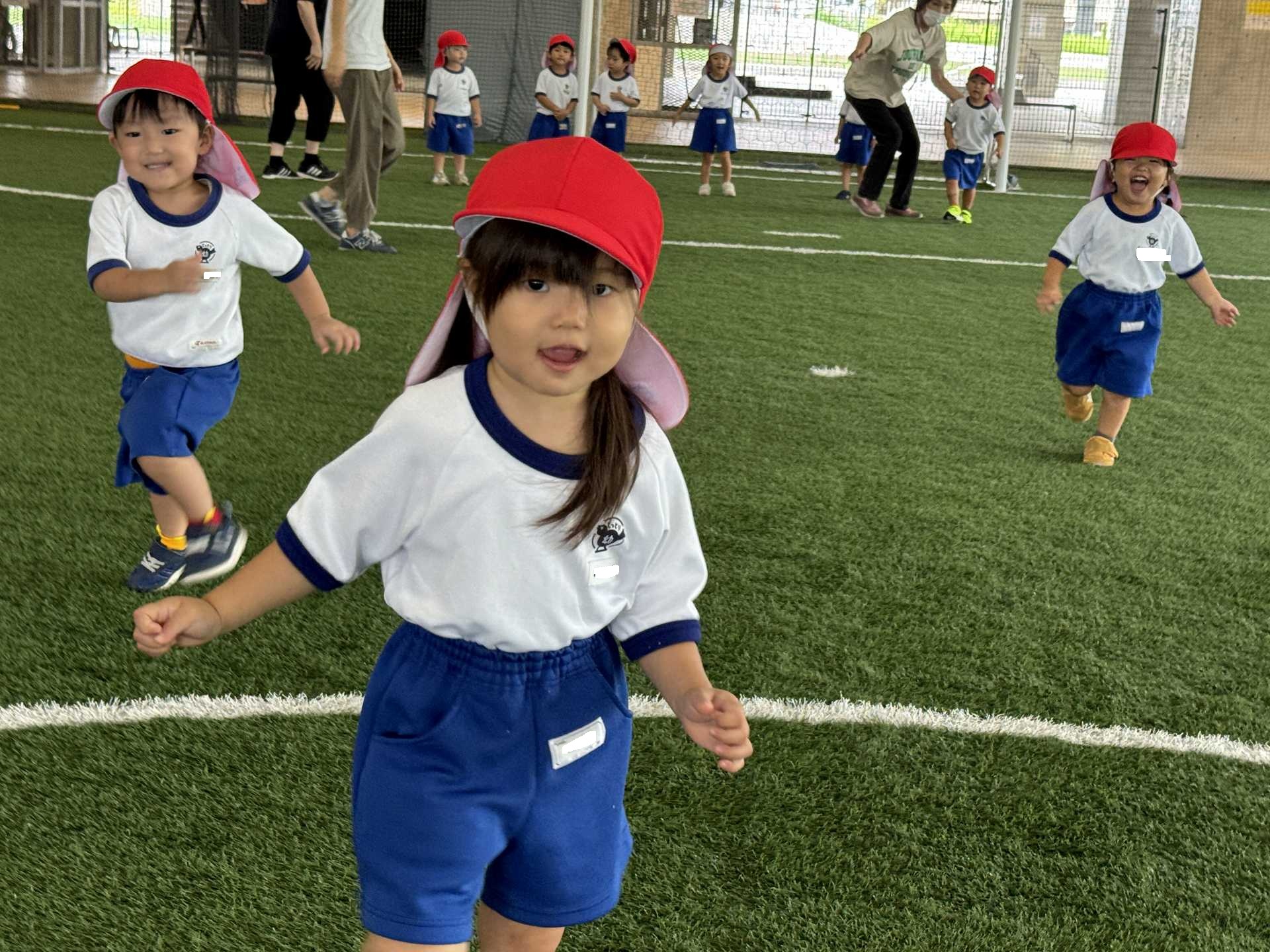 令和7年9月17日水曜日 ☆運動会練習☆ 年中組さんと一緒に市民体育館のフットサル場に出かけました!まずは一緒に体操!! その後のかけっこでは、ゴールにお兄さん・お姉さんが待っていてくれて、ゴールするとギュー!!と抱きしめてくれました。嬉しいけど少し恥ずかしそうな子ども達でした♪ 運動会のダンスも見てもらい、ジャンプがかわいかった!手を振るのがかわいかった!と褒めてもらいました☆年中さんのダンスも見せてもらい、かっこいい姿に興味津々な子ども達でした♪ 最後はボールで遊んだり、走ったりして楽しみました!!