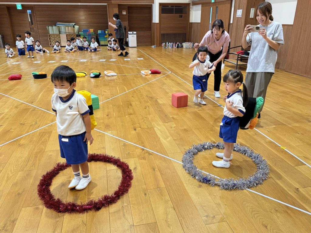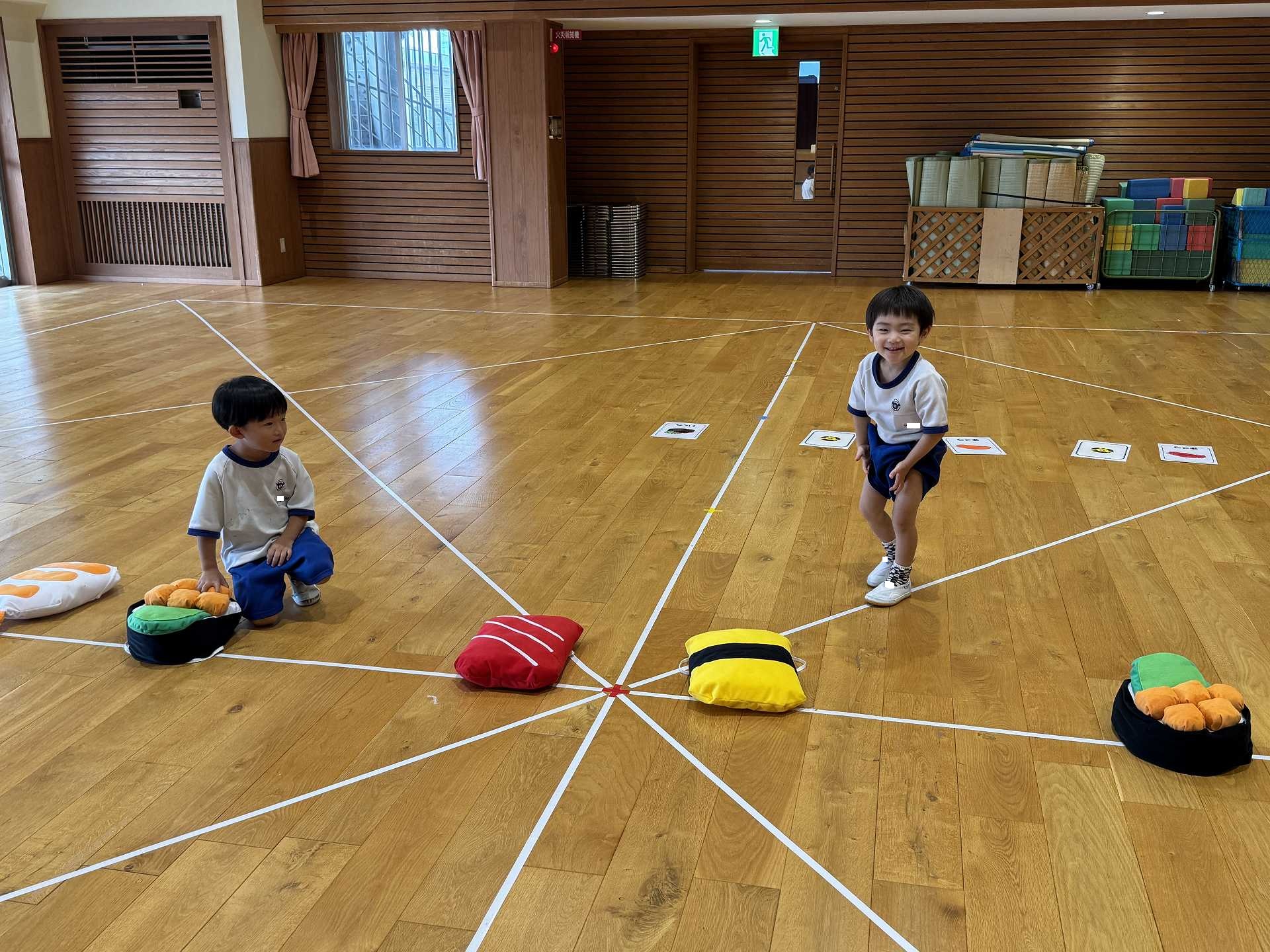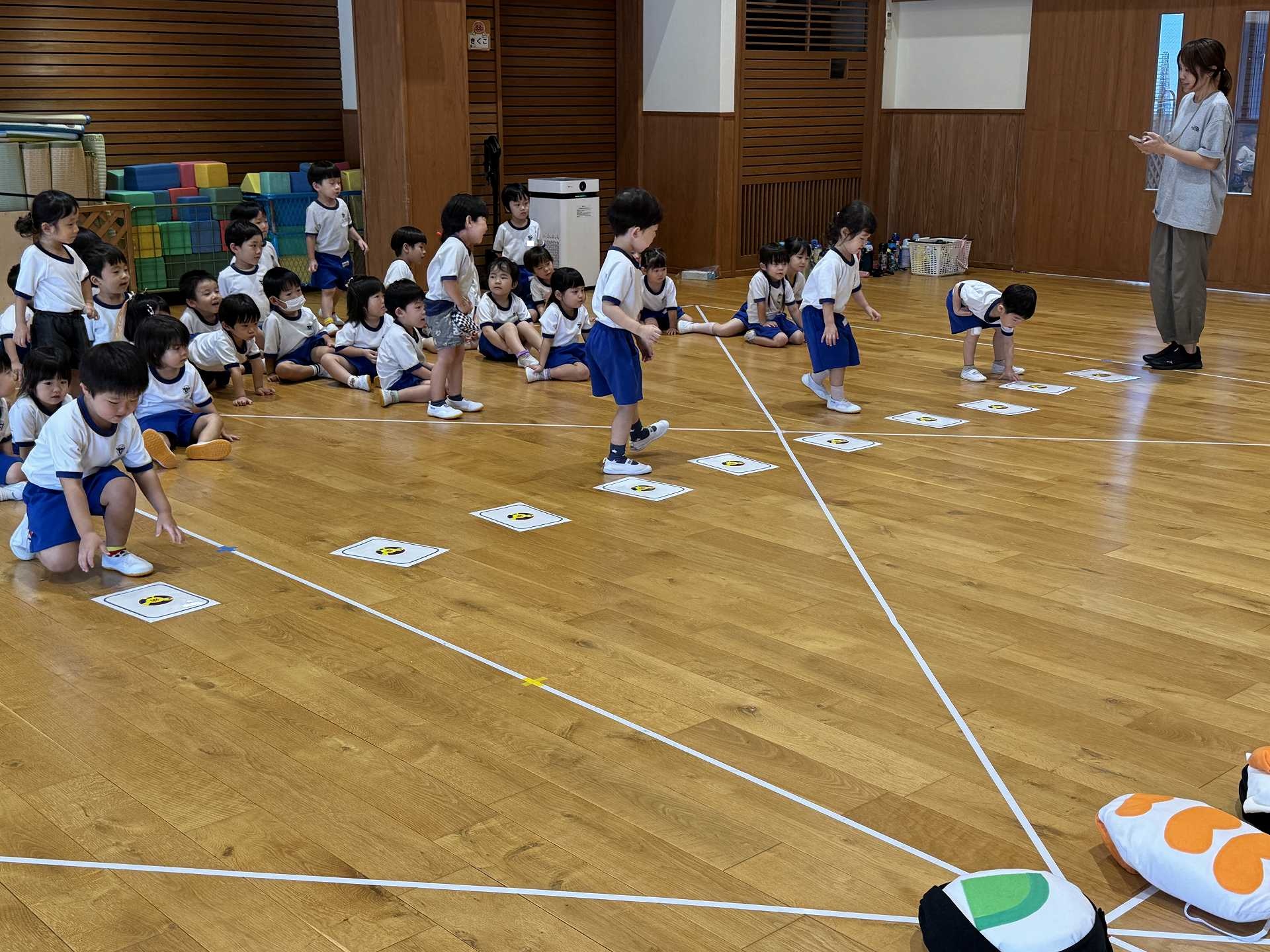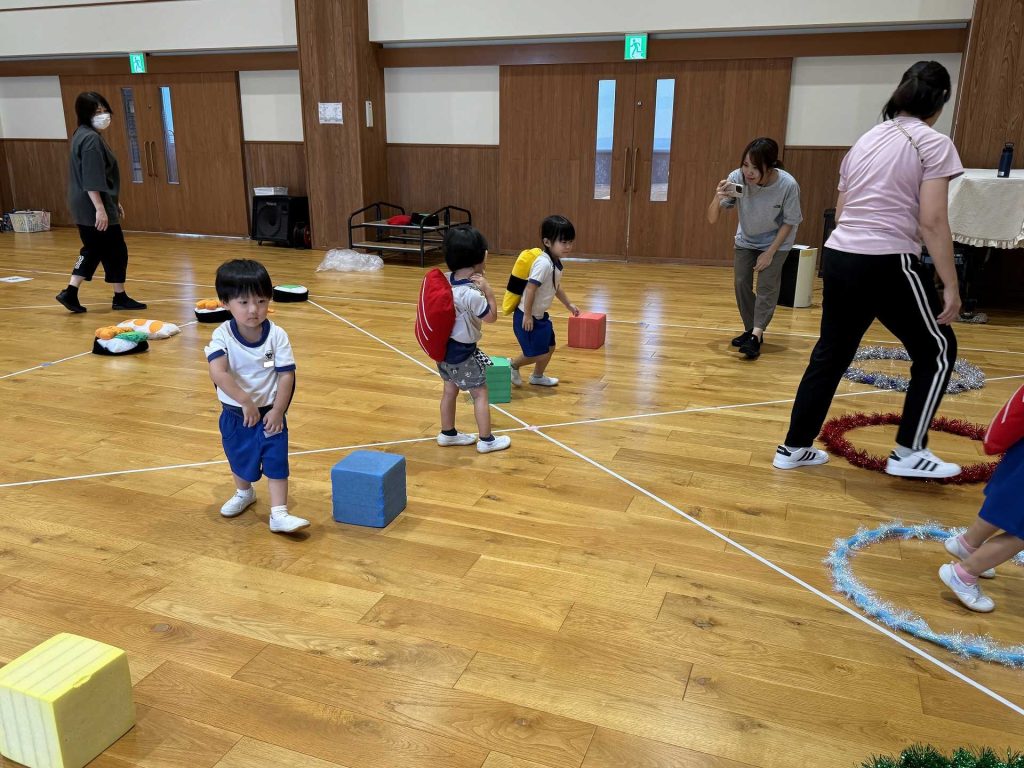 令和7年9月30日火曜日 ☆運動会練習~あつまれ おすしちゃん~☆ たんぽぽ組さんと一緒に運動会の親子競技で行う「あつまれ おすしちゃん」をしました!かわいいおすしのリュックを見て「わぁー!!」と大喜びの子ども達♪当日はお家の方と一緒におすしになることを楽しみにしている子ども達です!!