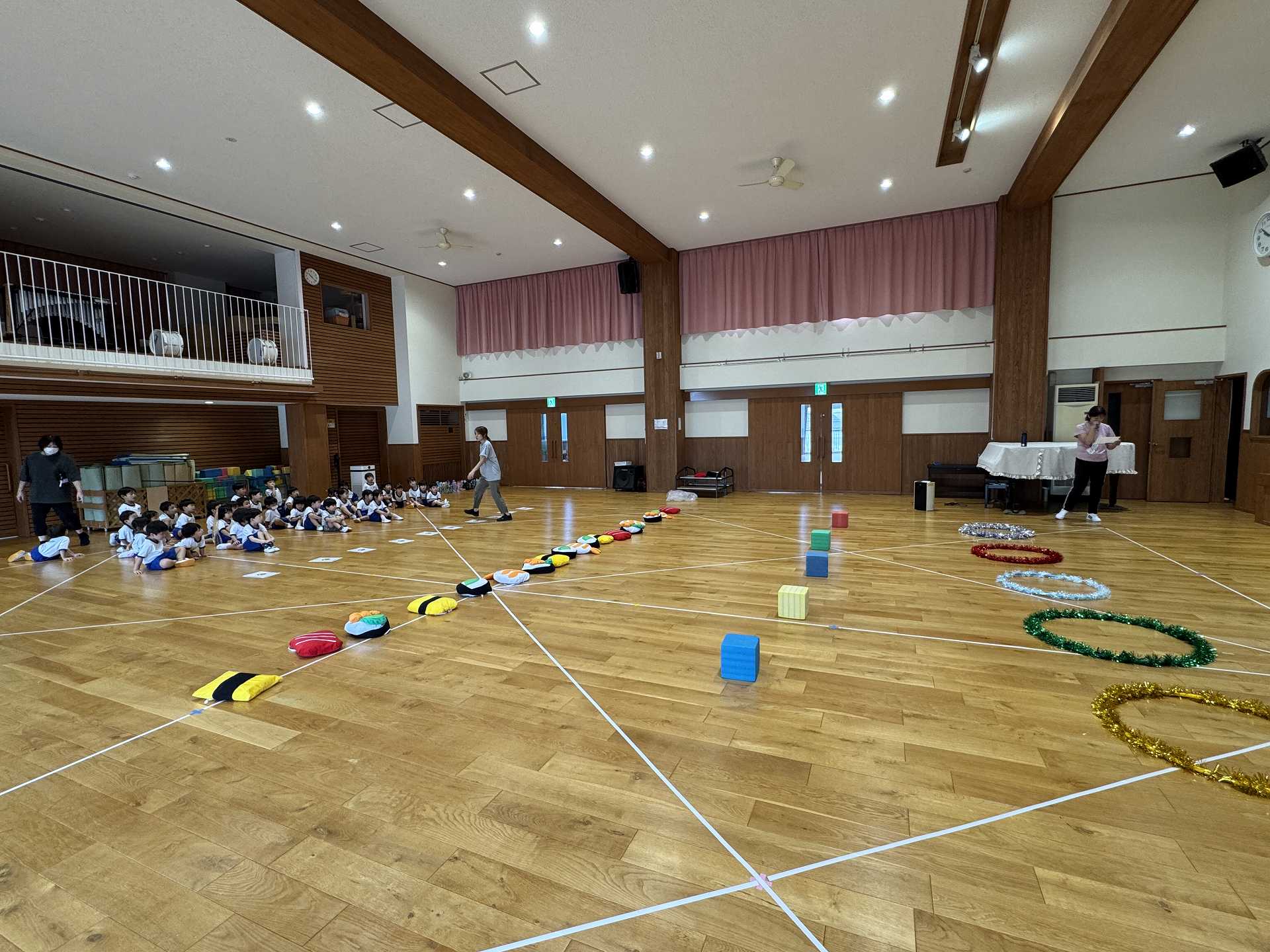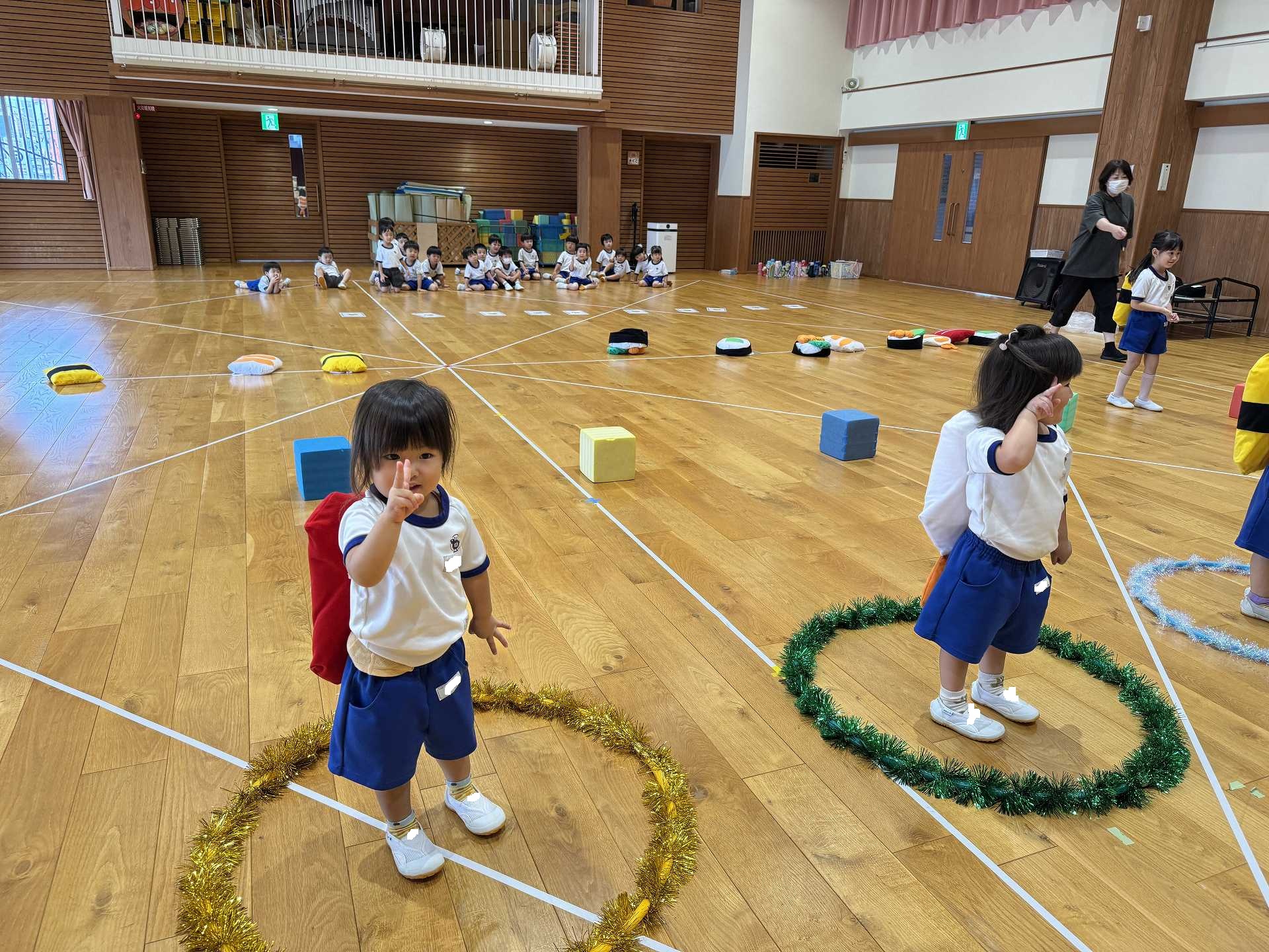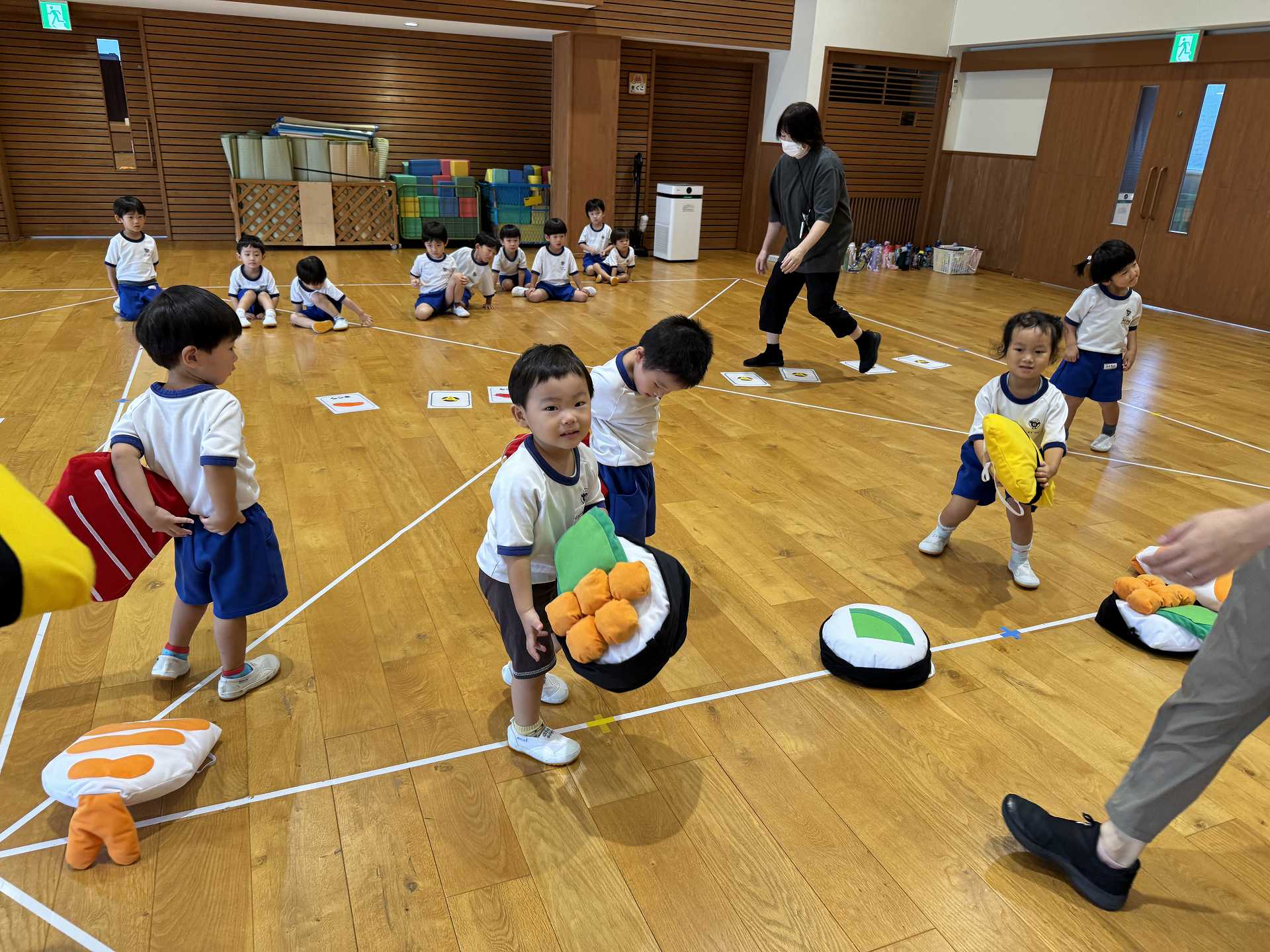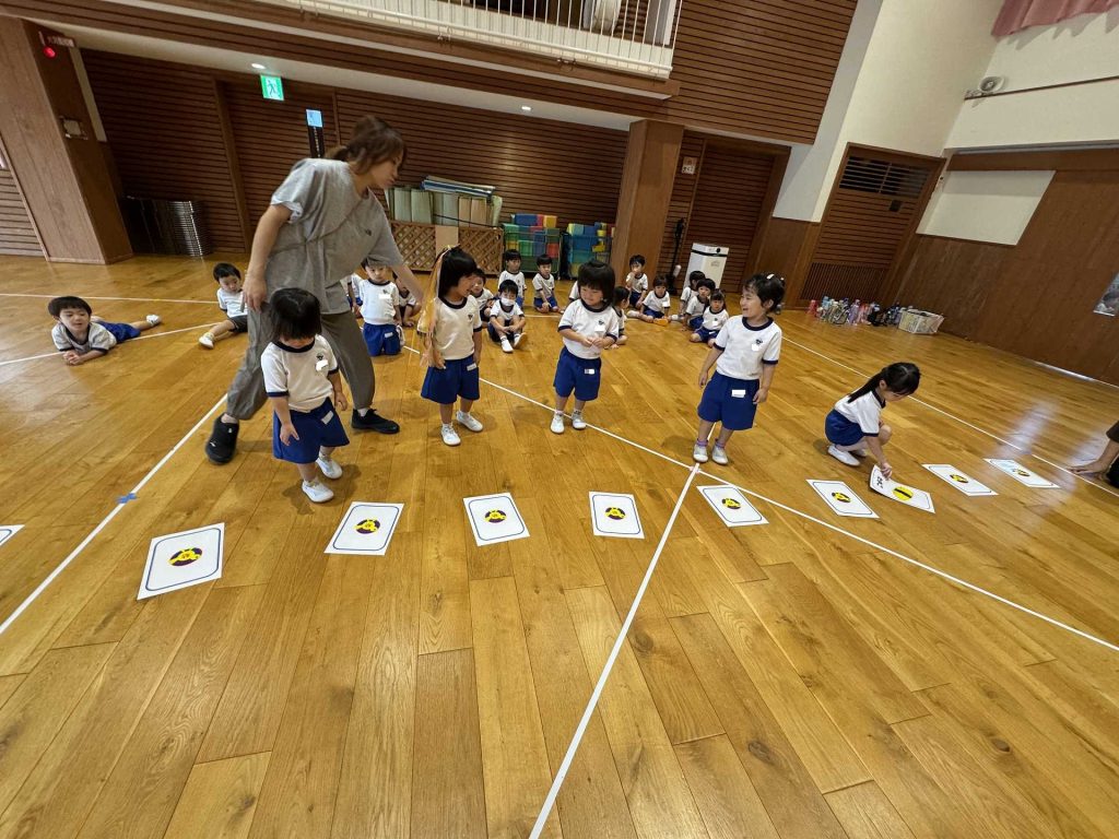 令和7年9月30日火曜日 ☆運動会練習~あつまれ おすしちゃん~☆ たんぽぽ組さんと一緒に運動会の親子競技で行う「あつまれ おすしちゃん」をしました!かわいいおすしのリュックを見て「わぁー!!」と大喜びの子ども達♪当日はお家の方と一緒におすしになることを楽しみにしている子ども達です!!