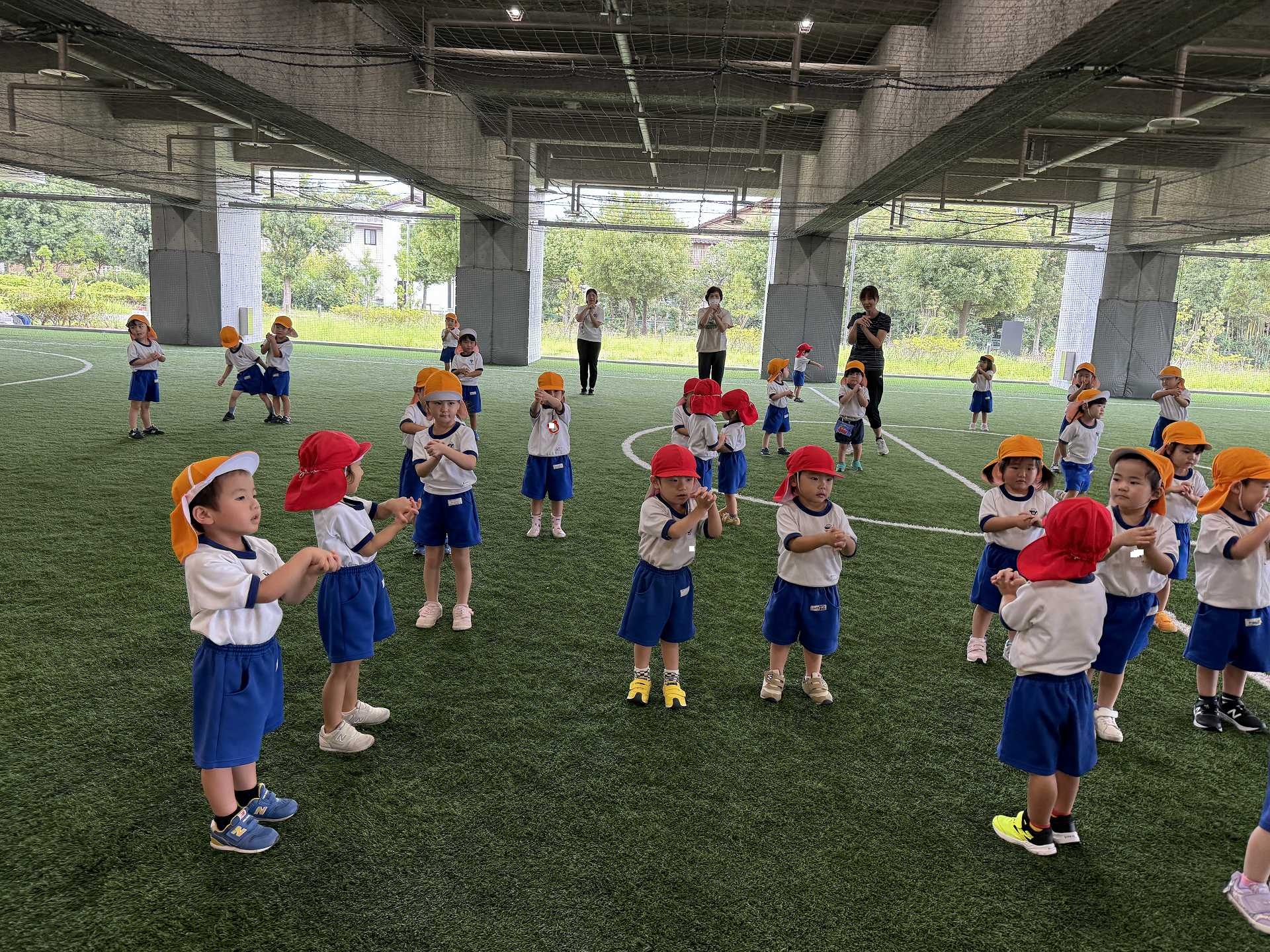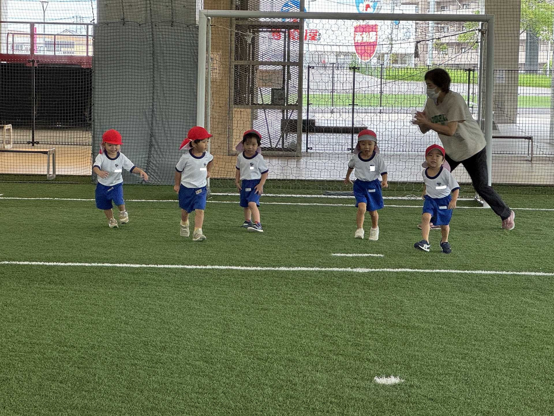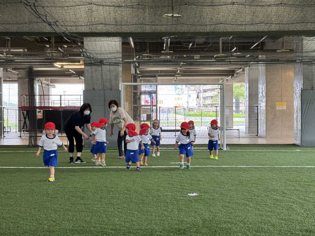 令和7年9月22日月曜日 ☆最近のりんご組☆ 年少さんと一緒にフットサル場に出かけました!体操をしてかけっこをした後はボールを使って遊びました!フットサル場にも慣れてきた子ども達は、思いきり体を動かして遊ぶことを楽しんでいました!