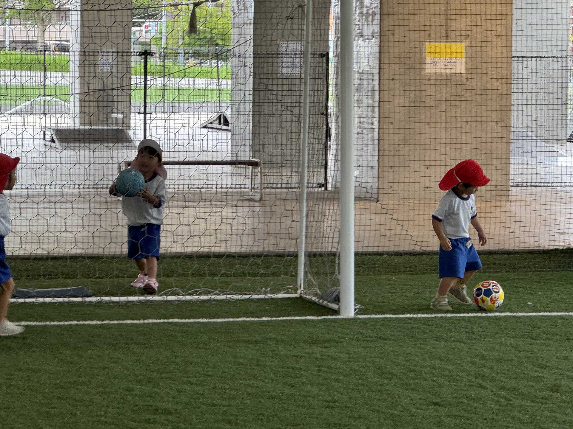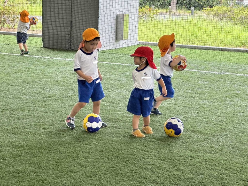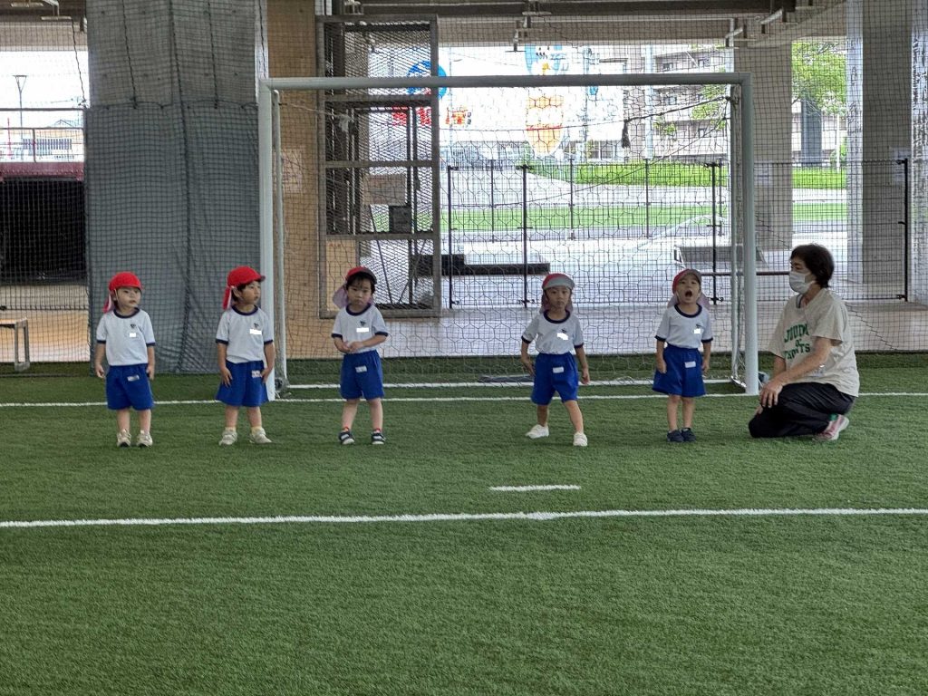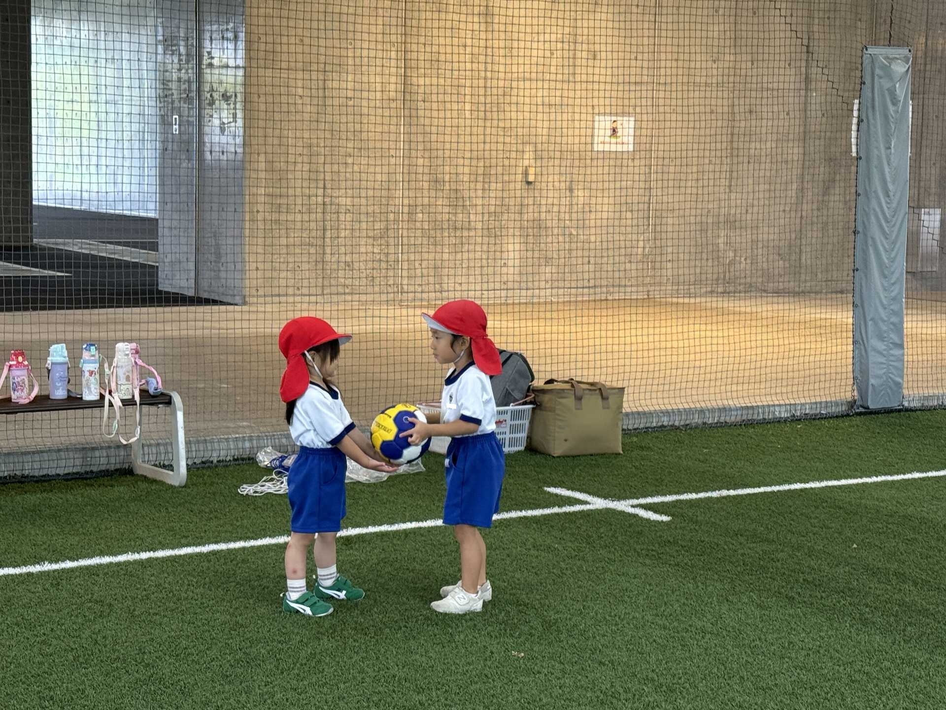 令和7年9月22日月曜日 ☆最近のりんご組☆ 年少さんと一緒にフットサル場に出かけました!体操をしてかけっこをした後はボールを使って遊びました!フットサル場にも慣れてきた子ども達は、思いきり体を動かして遊ぶことを楽しんでいました!