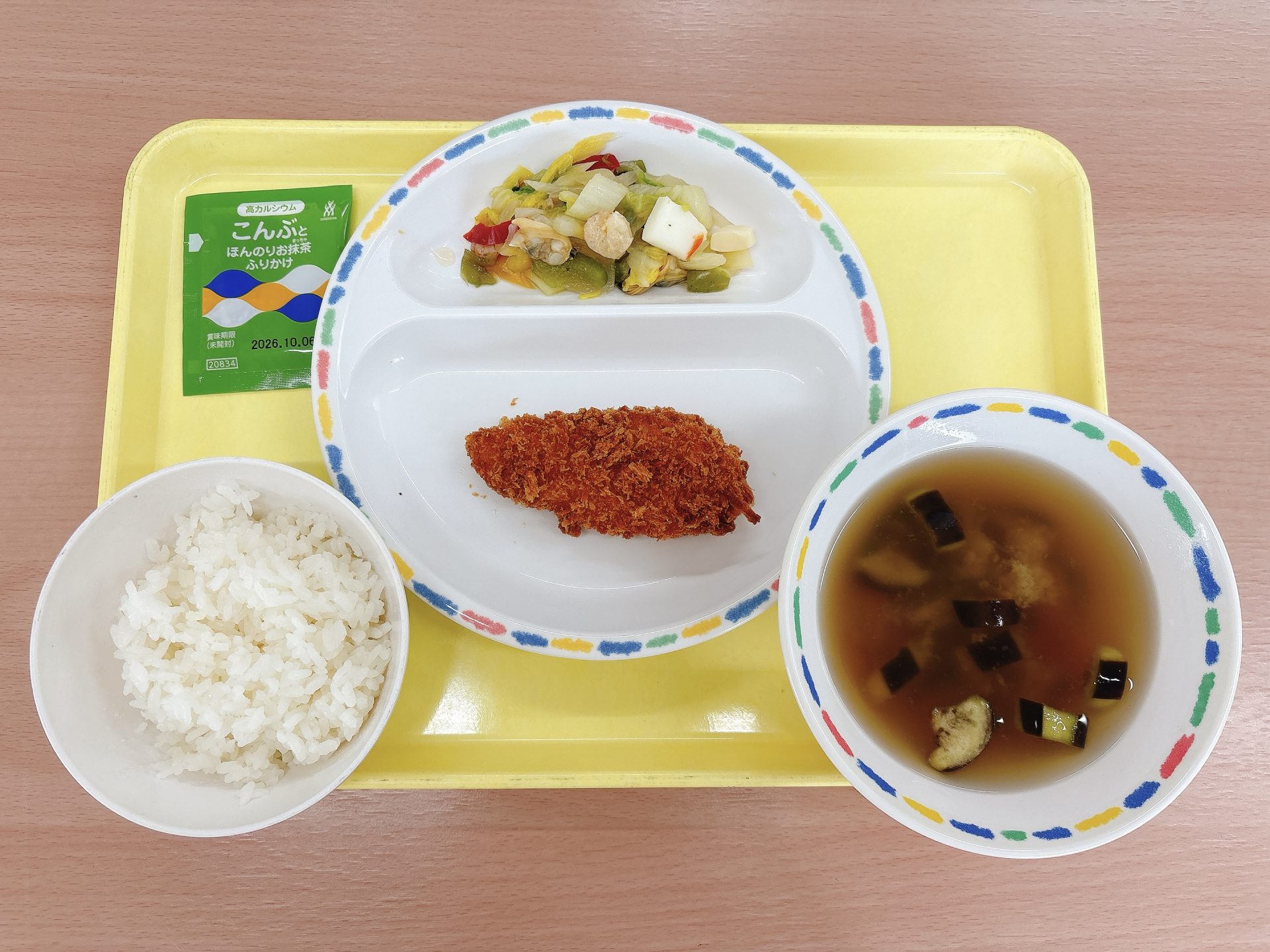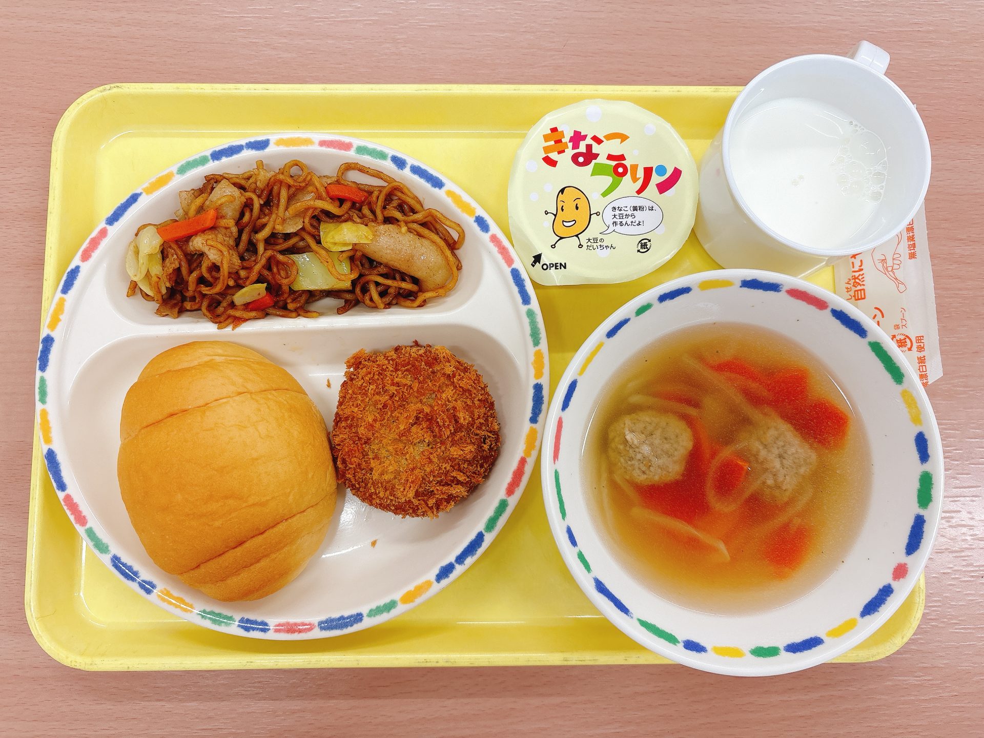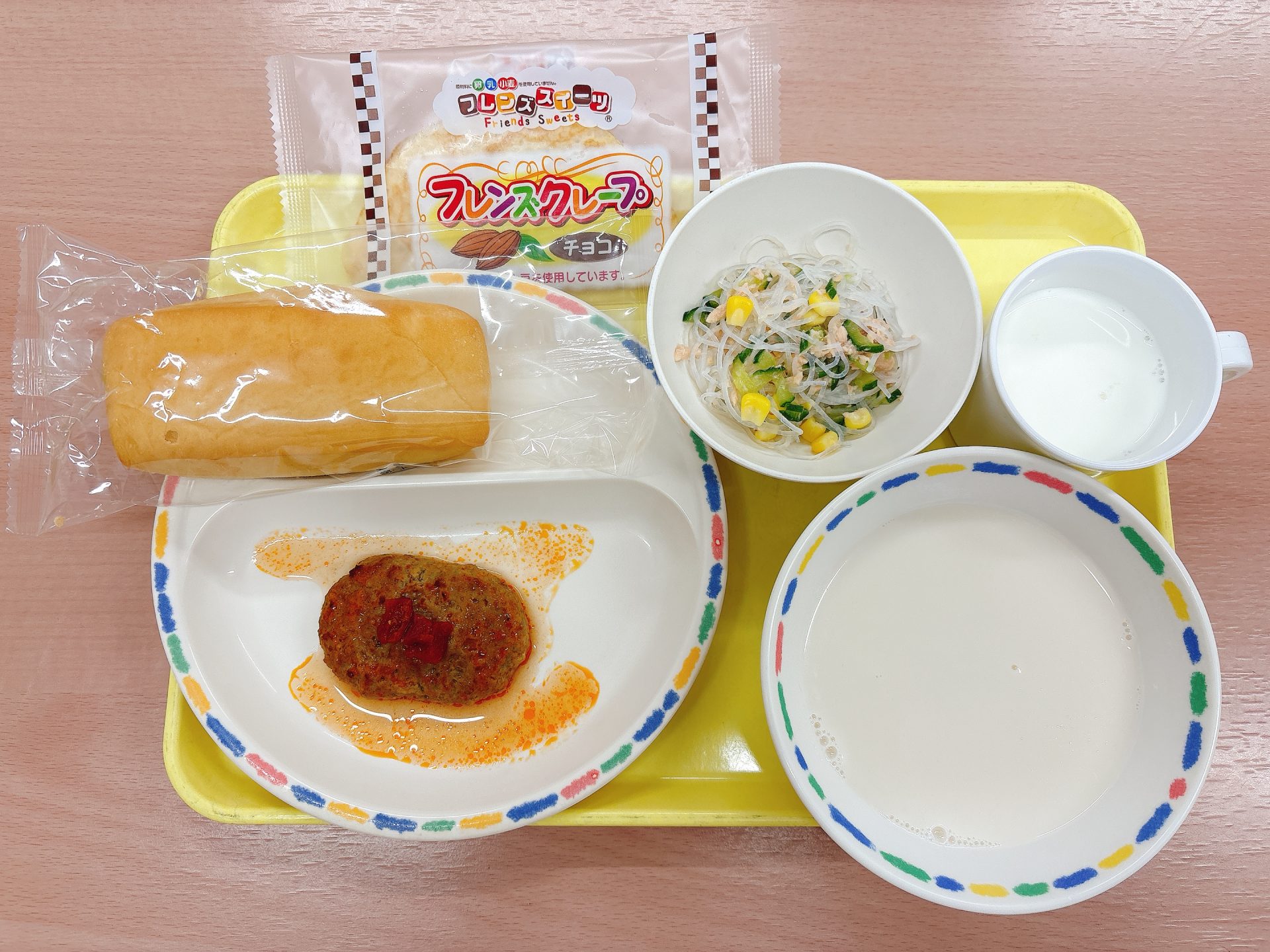 令和7年12月03日水曜日 本日の給食 ・プレーンパン・煮込みハンバーグ・みそミルクスープ・春雨サラダ・牛乳・チョコクレープ 3園リクエストメニュー:今日は3園さんリクエストのパン、煮込みハンバーグ、みそミルクスープ、春雨サラダ、クレープです🍫⭐️