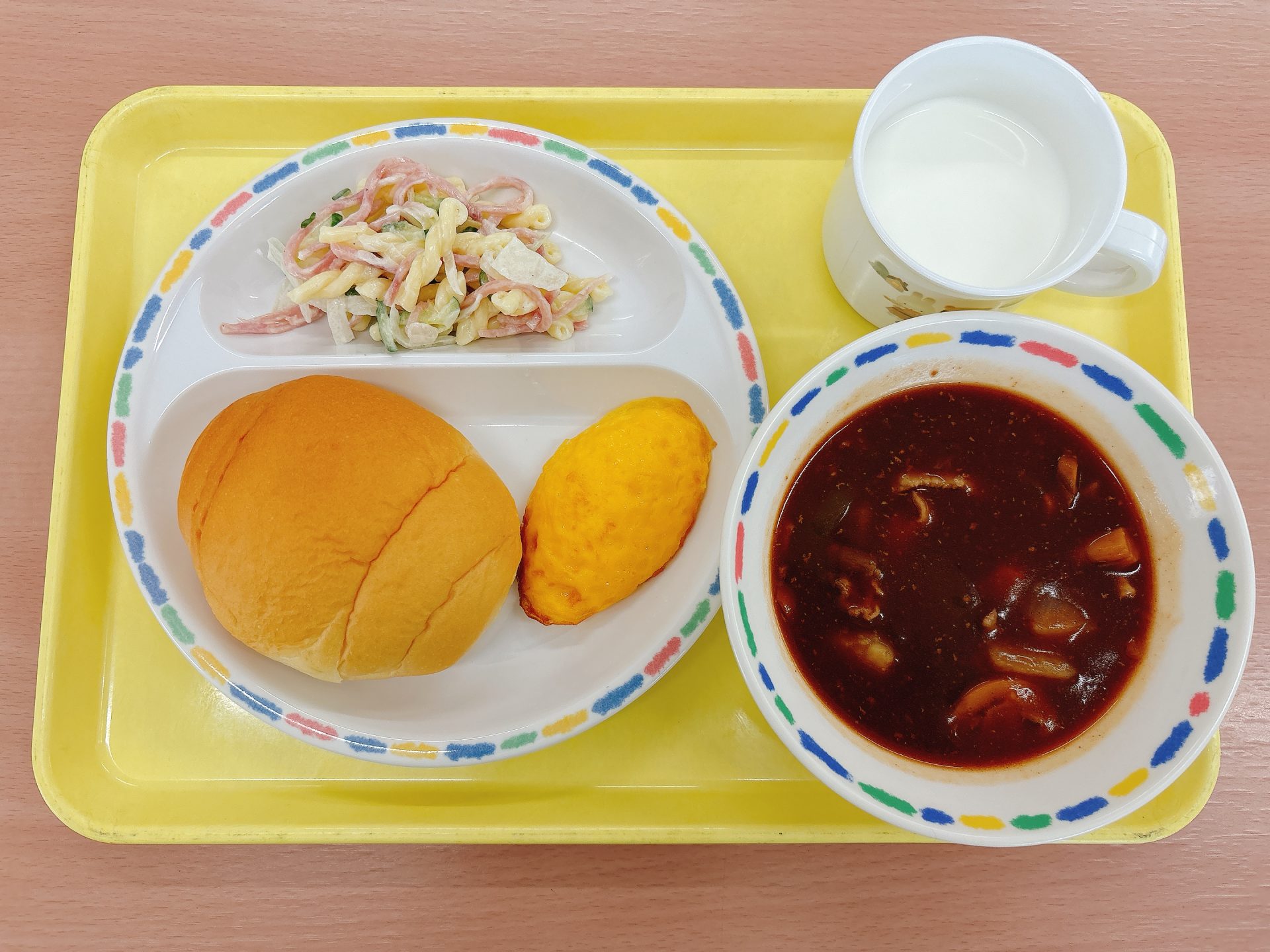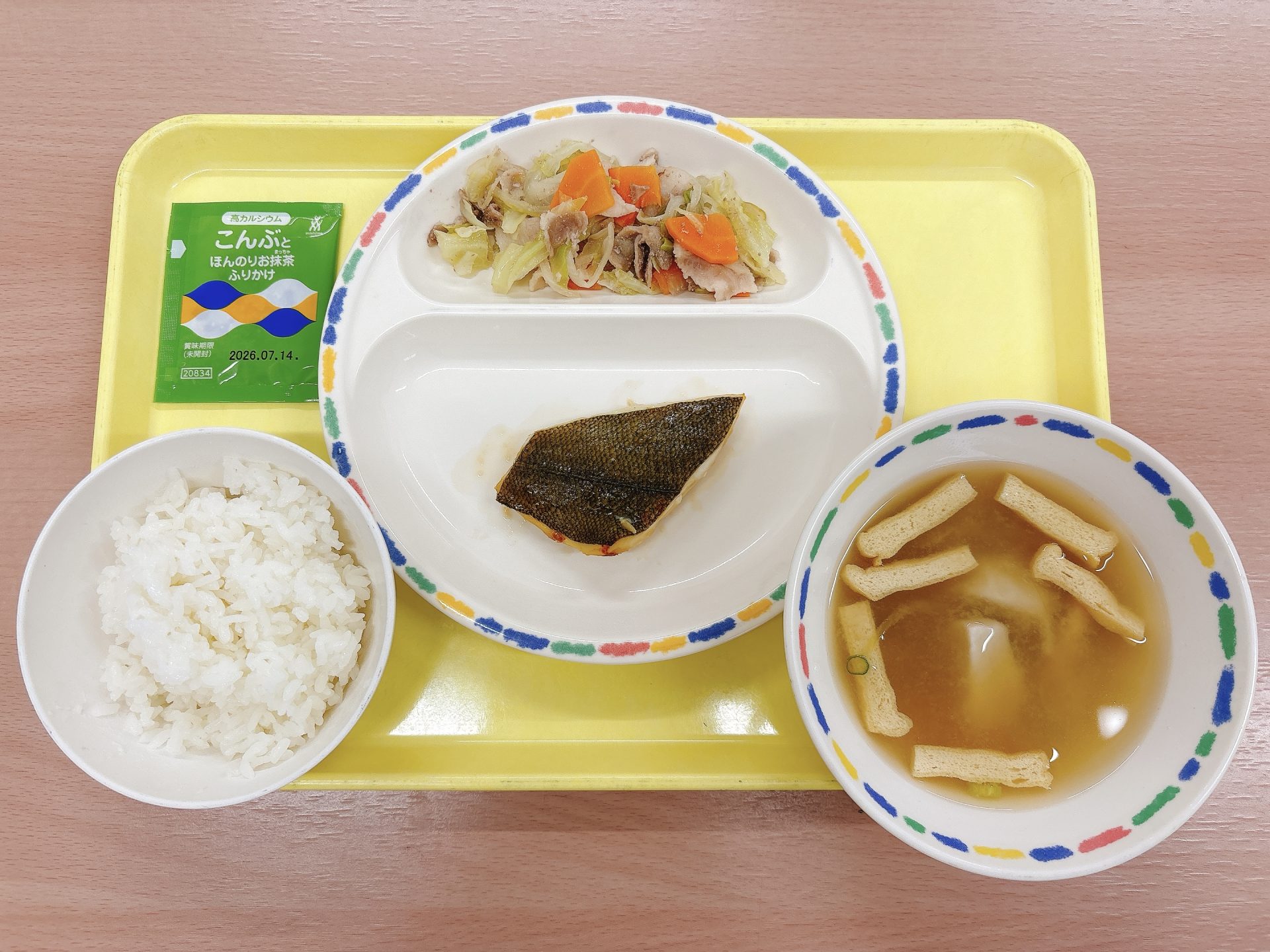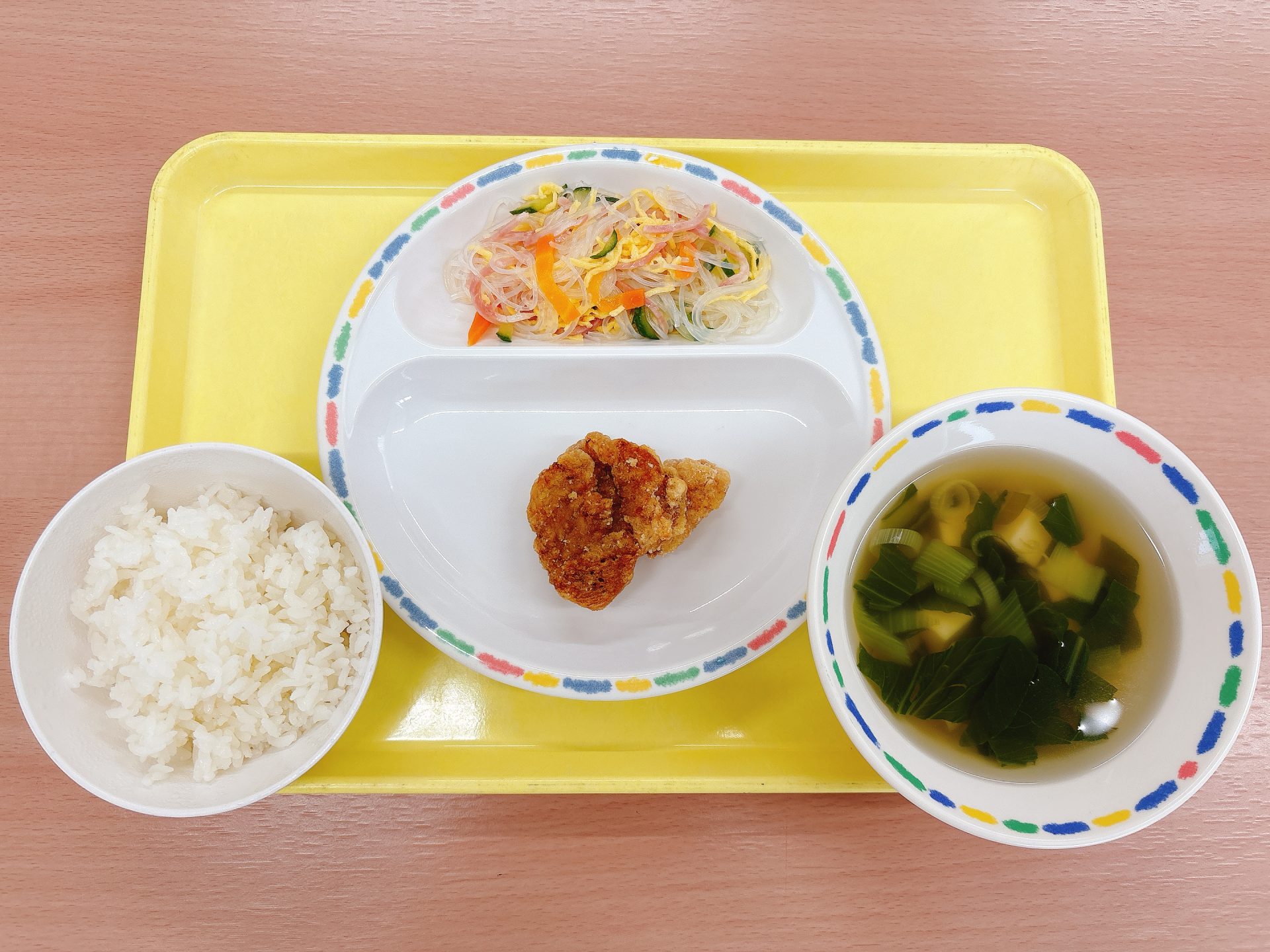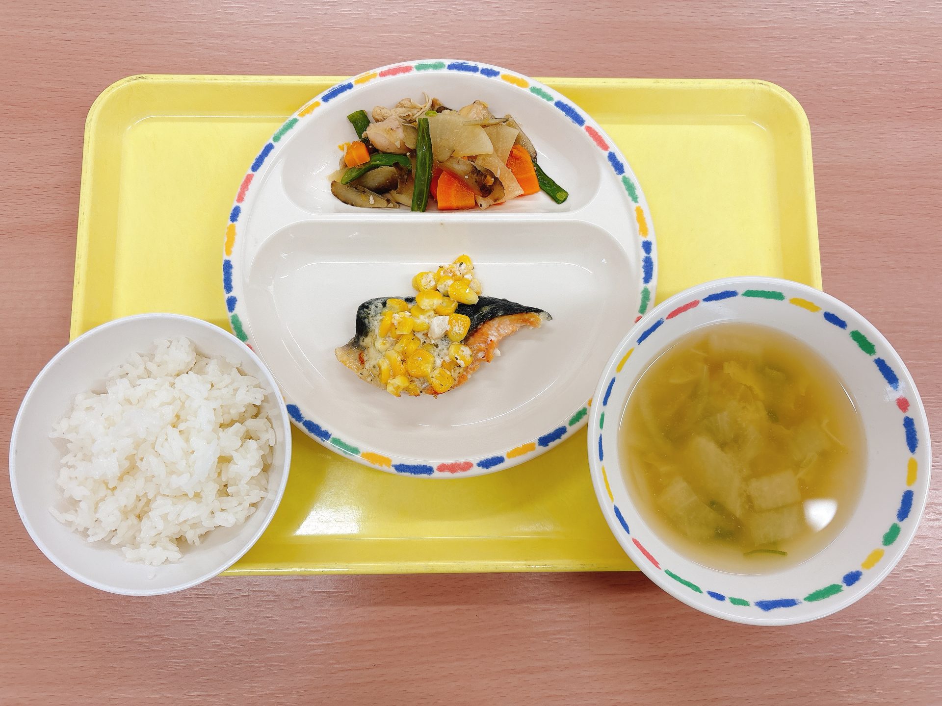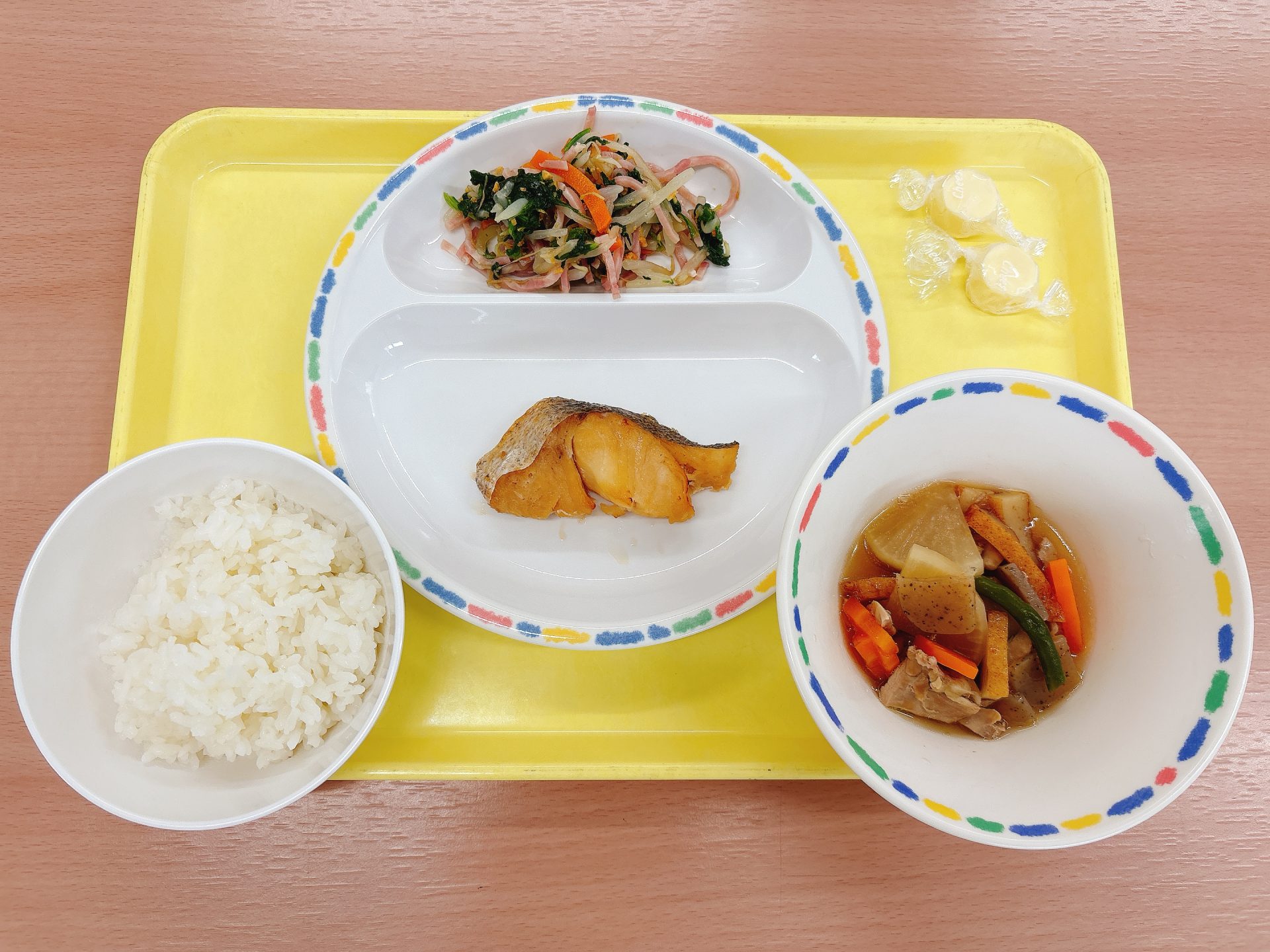 令和7年9月10日水曜日 本日の給食 ・ご飯・カレー(防災食)・小松菜と厚揚げの炒め物・フルーツ缶(防災食) 今日の鳥取県産食材:豚肉、小松菜防災食メニュー:今日は鳥取市防災の日なので、園に備蓄している防災食(カレー・フルーツ缶)を食べる日です⛑️
