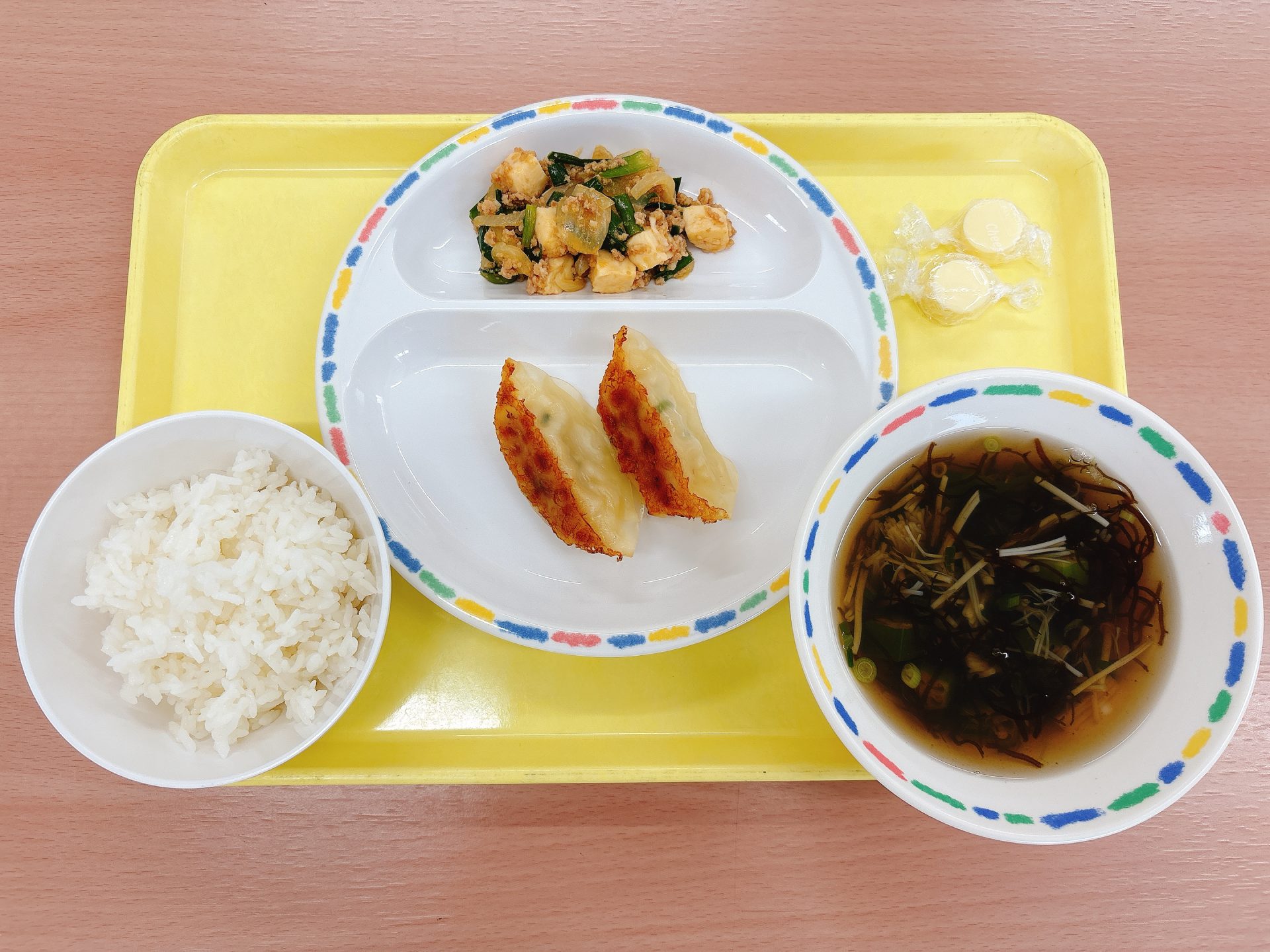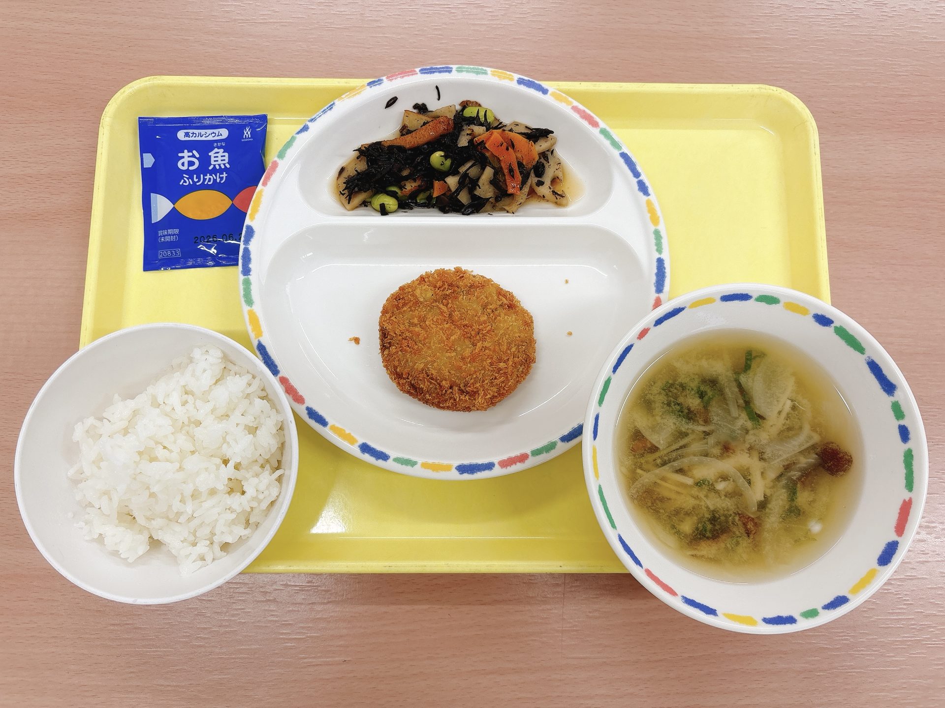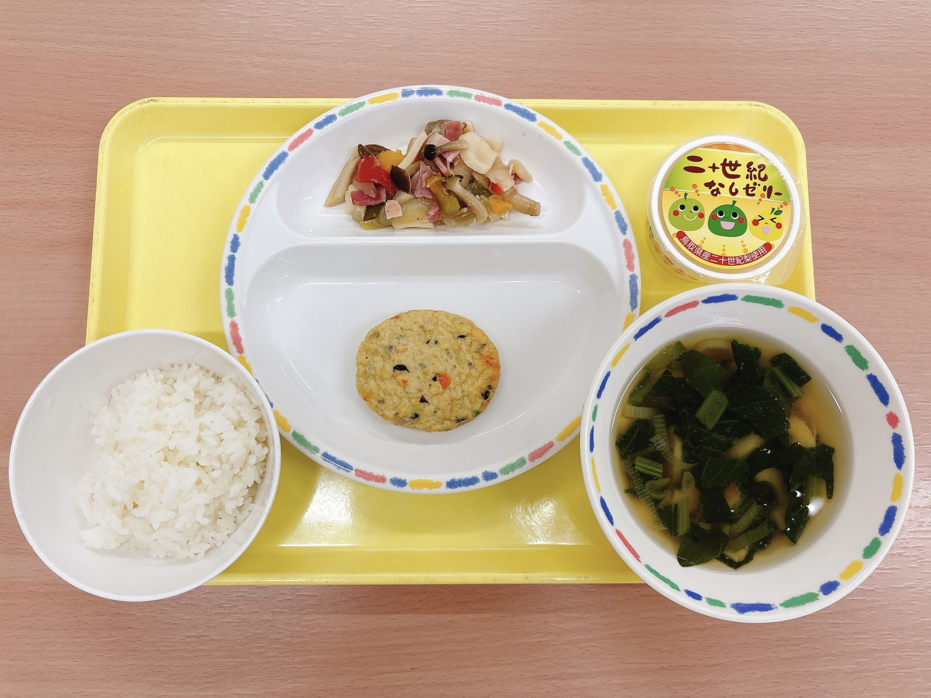 令和7年9月12日金曜日 本日の給食 ・ご飯・豆腐ハンバーグ・小松菜のみそ汁・きのこソテー・二十世紀梨ゼリー 今日の鳥取県産食材:小松菜、しめじ、エリンギ、二十世紀梨ゼリーとっとり県民の日メニュー:今日はとっとり県民の日なので、鳥取県産の食材を使ったメニューです🍄🍐