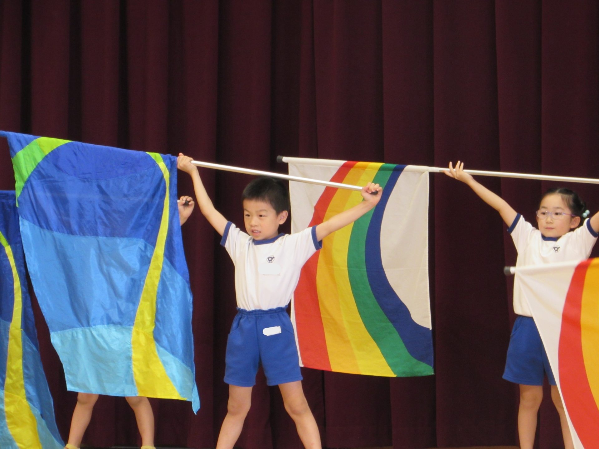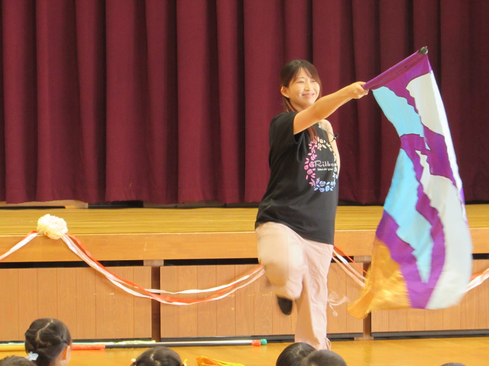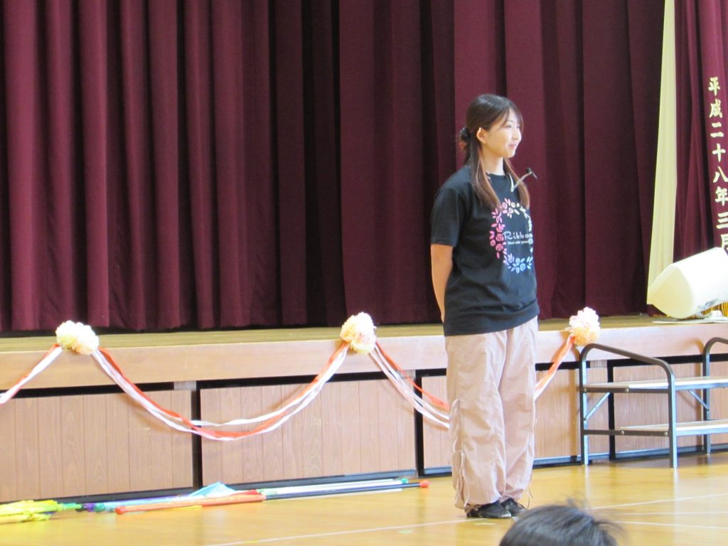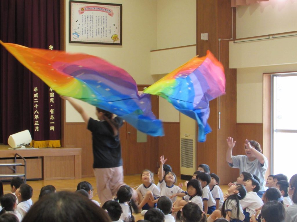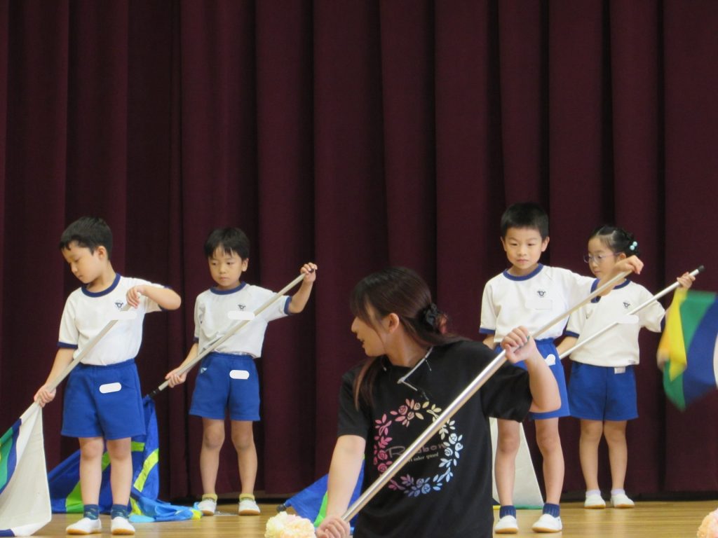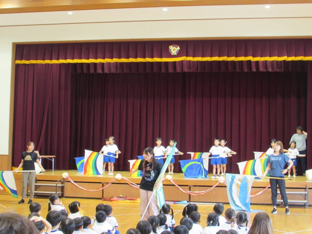 そして、今月のきらきらタイムのゲストには、『Baton キャンベル』に所属しておられる4名の選手の方をお迎えし、バトントワリングの演技を見せていただきました。世界大会で活躍され、世界1位になられたり、世界で上位になられている皆さんの素晴らしい演技に、子ども達の目もすっかりくぎ付け!!「すごい!」「かっこいい!」の感想はもちろん、「ふしぎ~!」といった声も!手先だけでなく腕や首、背中でもくるくるとバトンが回るのですから、そりゃ不思議ですよね!世界大会での演技も披露してくださり、その技の難易度の高さにすっかり心を奪われました。