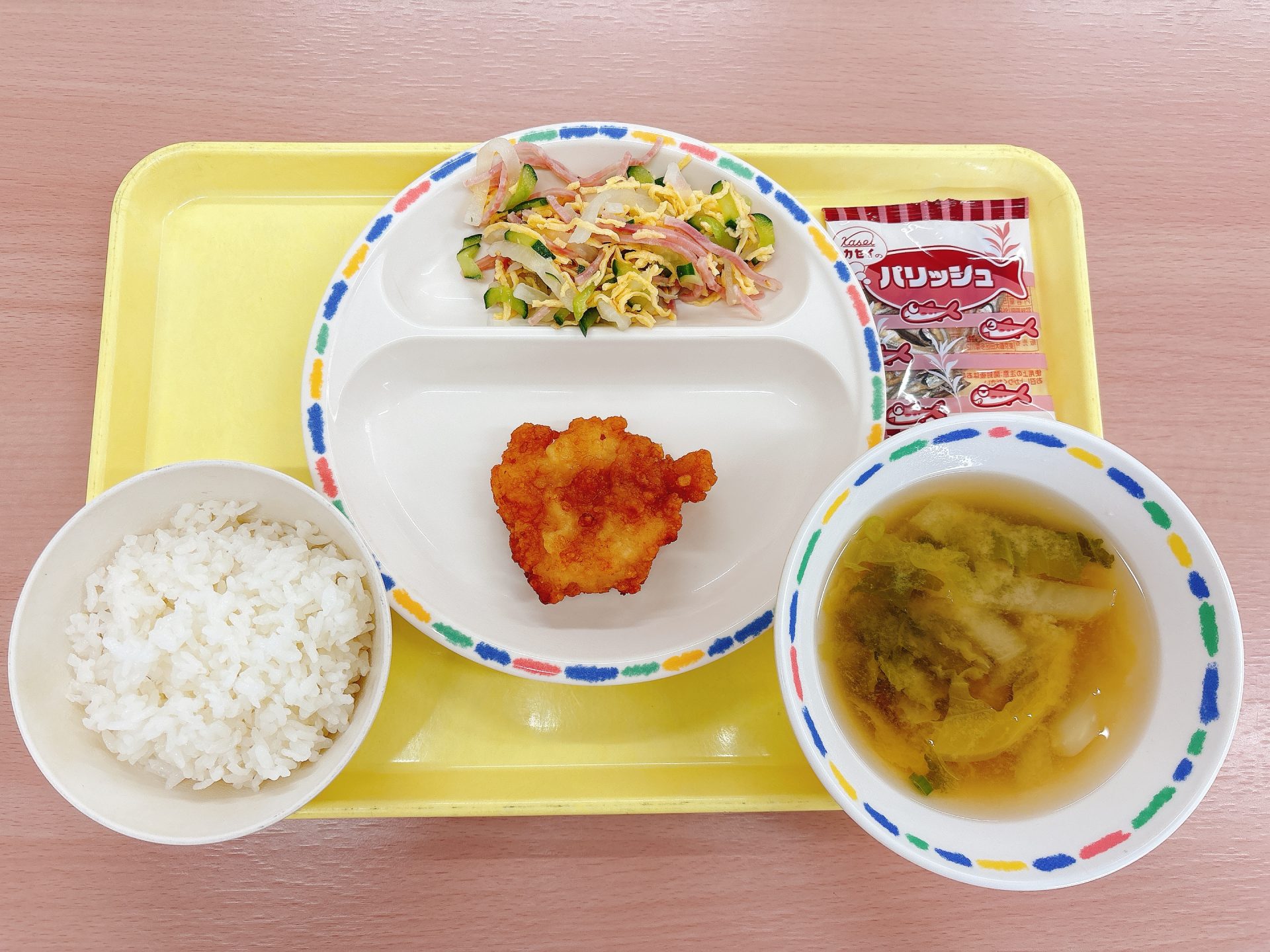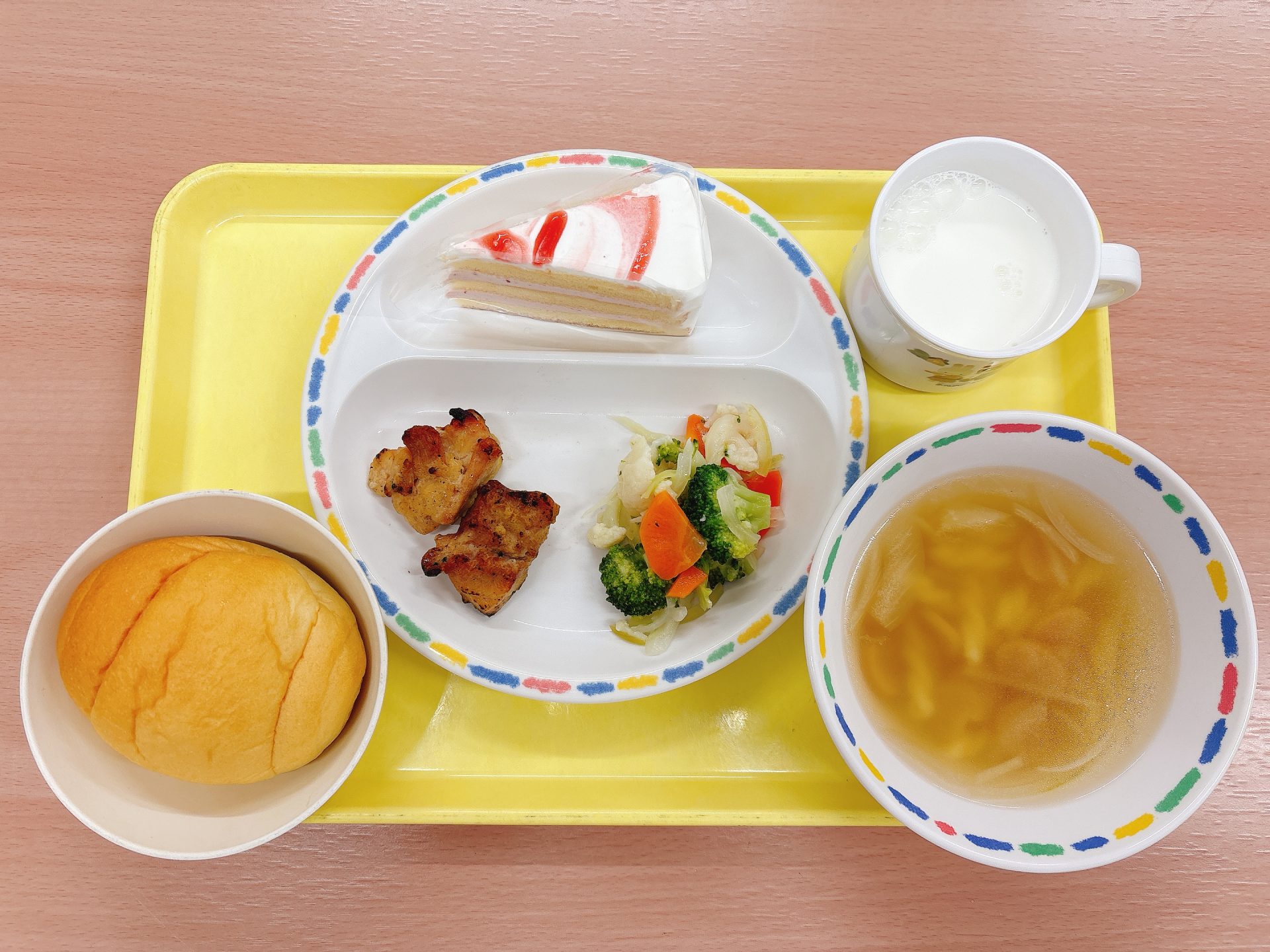 令和7年12月24日水曜日 本日の給食 ・スフレブレッド・鶏肉の照り焼き・マカロニスープ・もみの木サラダ・牛乳・いちごケーキ 今日の鳥取県産食材:にんじんクリスマスメニュー:今日はクリスマスイブなので、ツリーに見立てたブロッコリーのサラダと、いちごケーキです🎄🍓🎅🏻