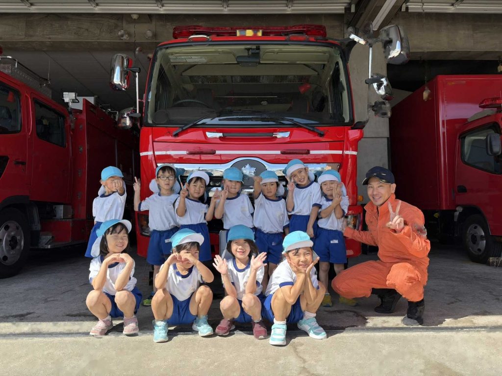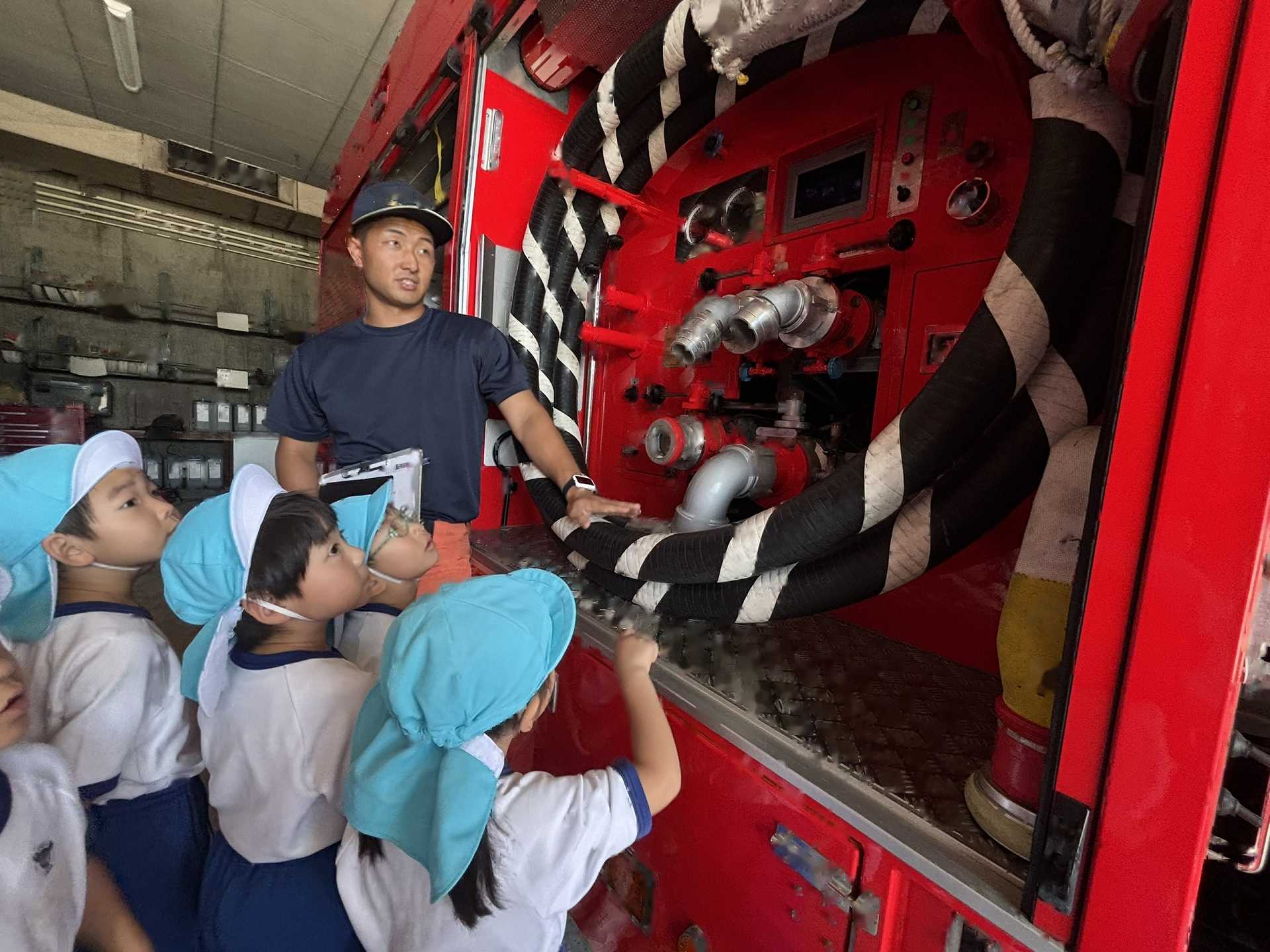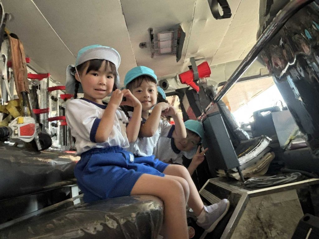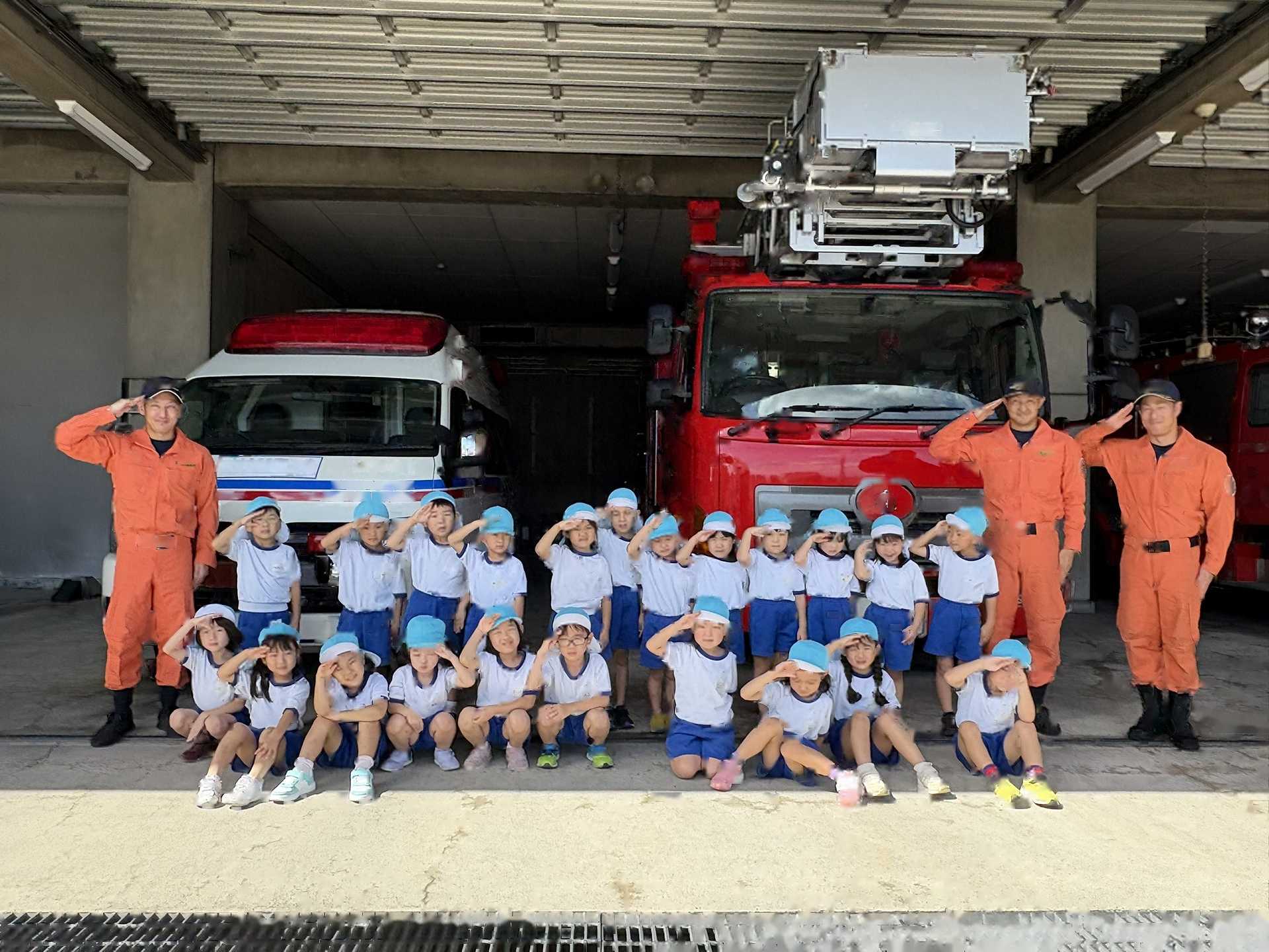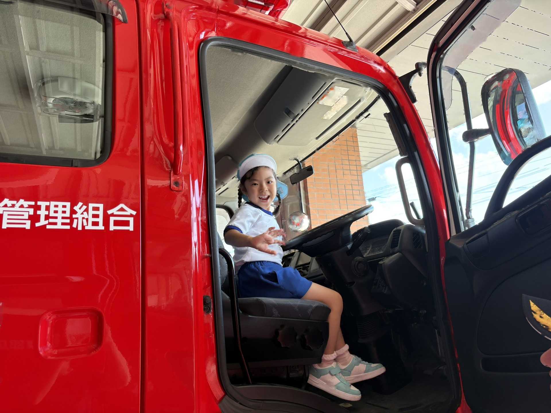年中組★園外活動「消防署見学」 園外活動で”消防署”へ見学に行ってきました。消防士さんのお仕事について教えてもらったり、消防車両に実際に乗らせてもらったりしながら、消防のお仕事について関心を高めていた子ども達でした♪