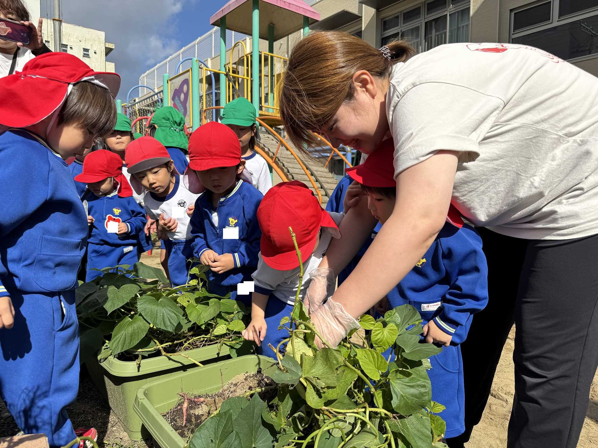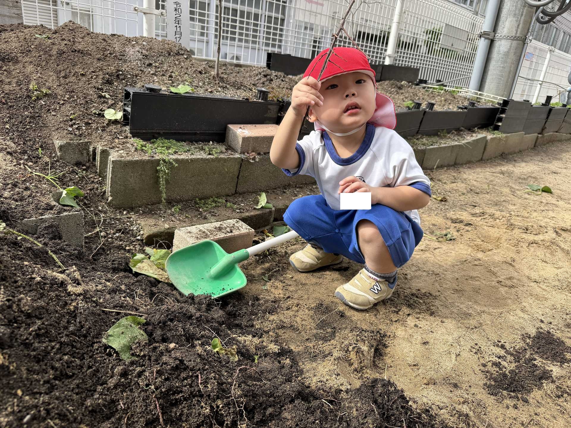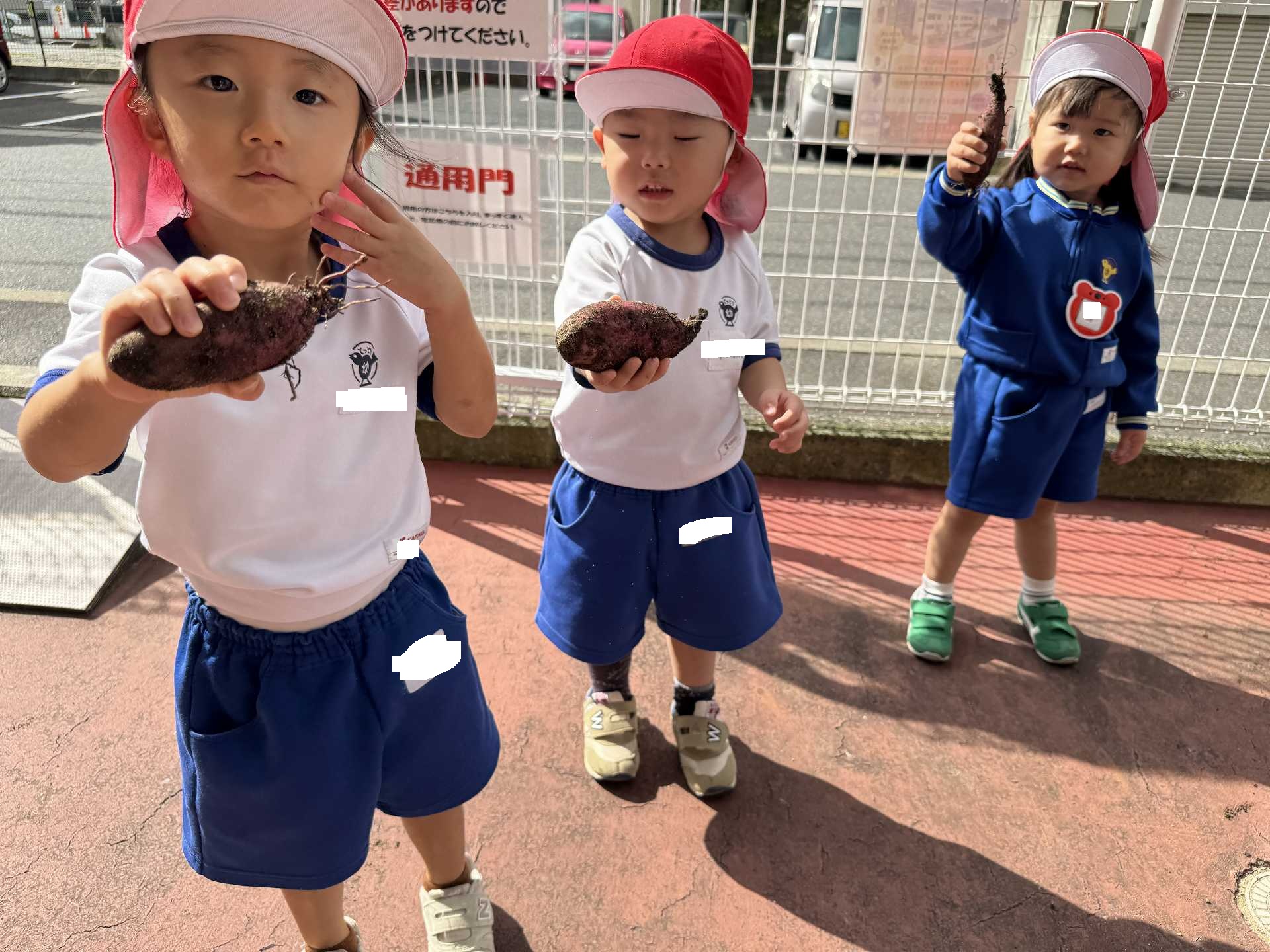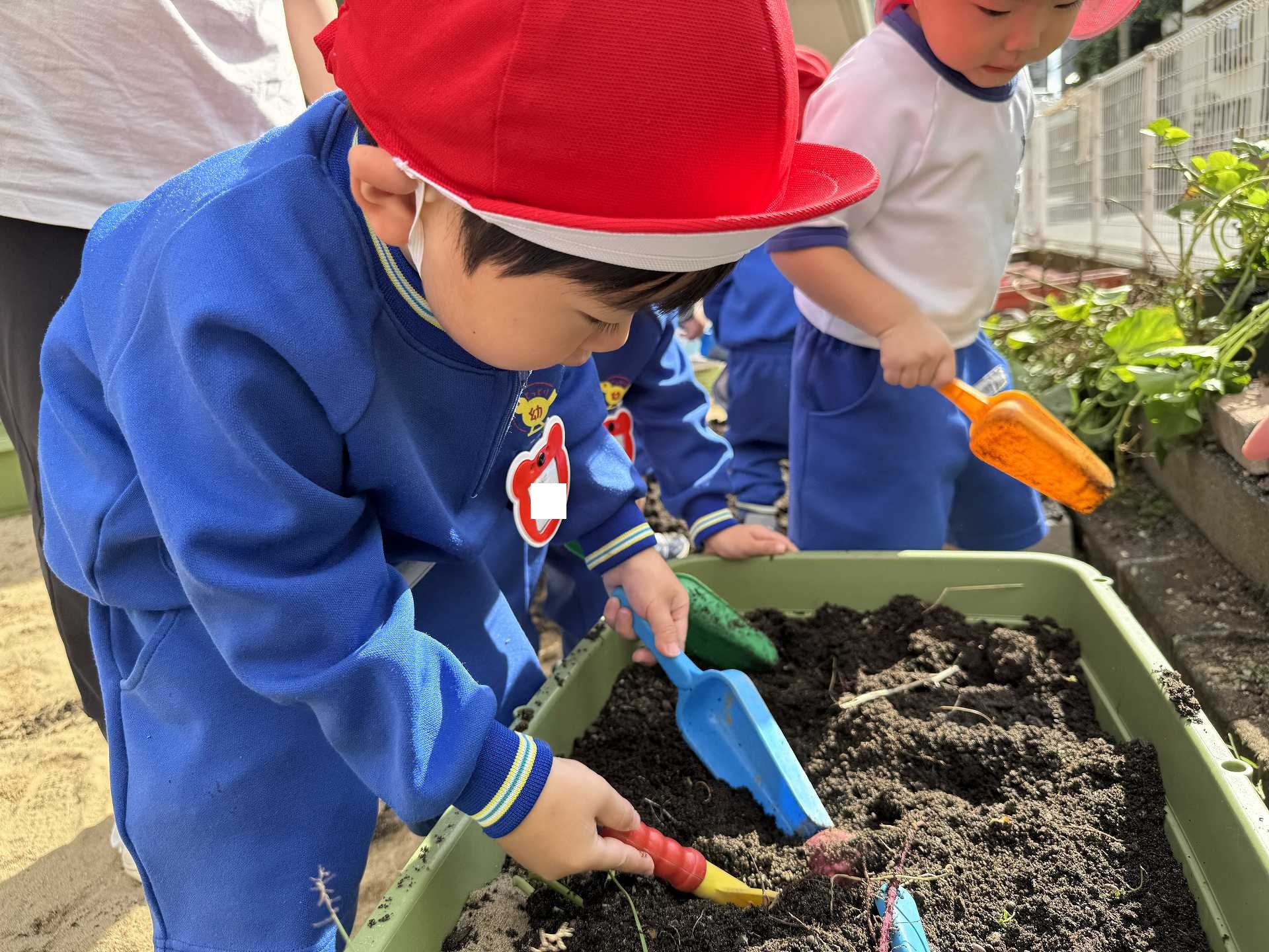 2歳の子ども達も園庭のプランターに植えたさつまいもを収穫しました!春に植えた芋の苗が育ち葉っぱが大きく育っていることに驚きながらも、芋ほりの話をしっかり聞いて活動に参加しました。つるを引っ張りさつまいもが少し顔を出すと「あった!ここにあるよ!」と頑張って砂を掘り「出てきたー!!」と土の中から出てきたさつまいもに大喜びの子ども達でした。小さいお芋、大きいお芋と様々なさつまいもが収穫でき、今度クッキングを行うことを伝えると「何食べようかなぁ」「早く食べたい!」ととても楽しみにしています♪