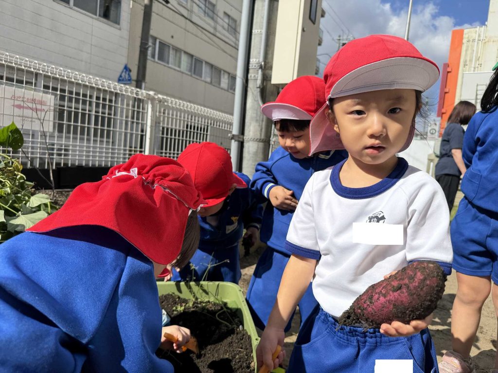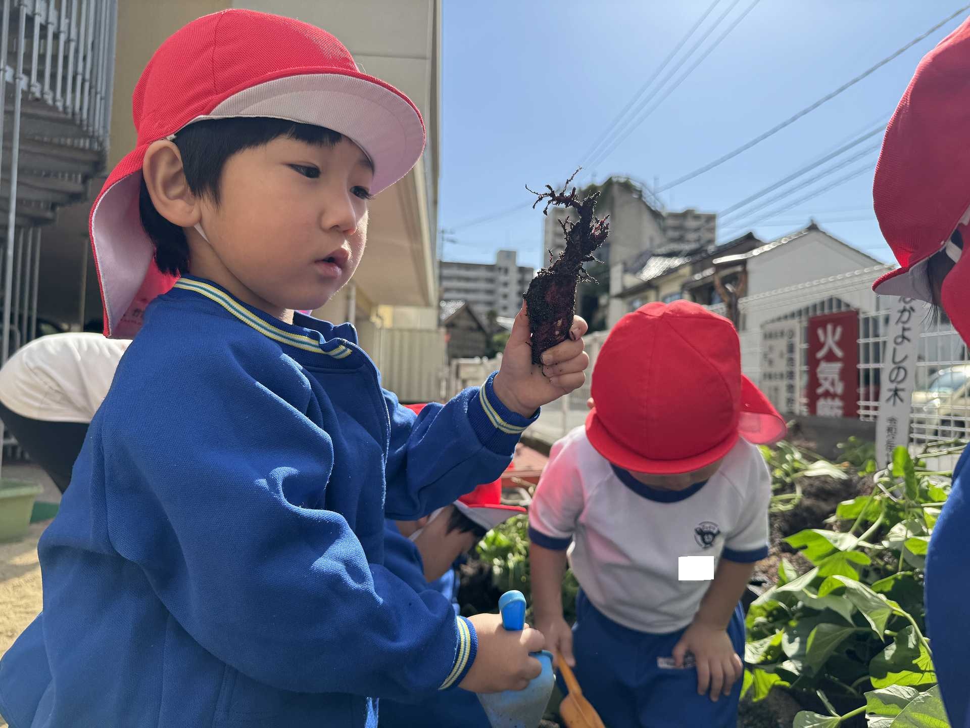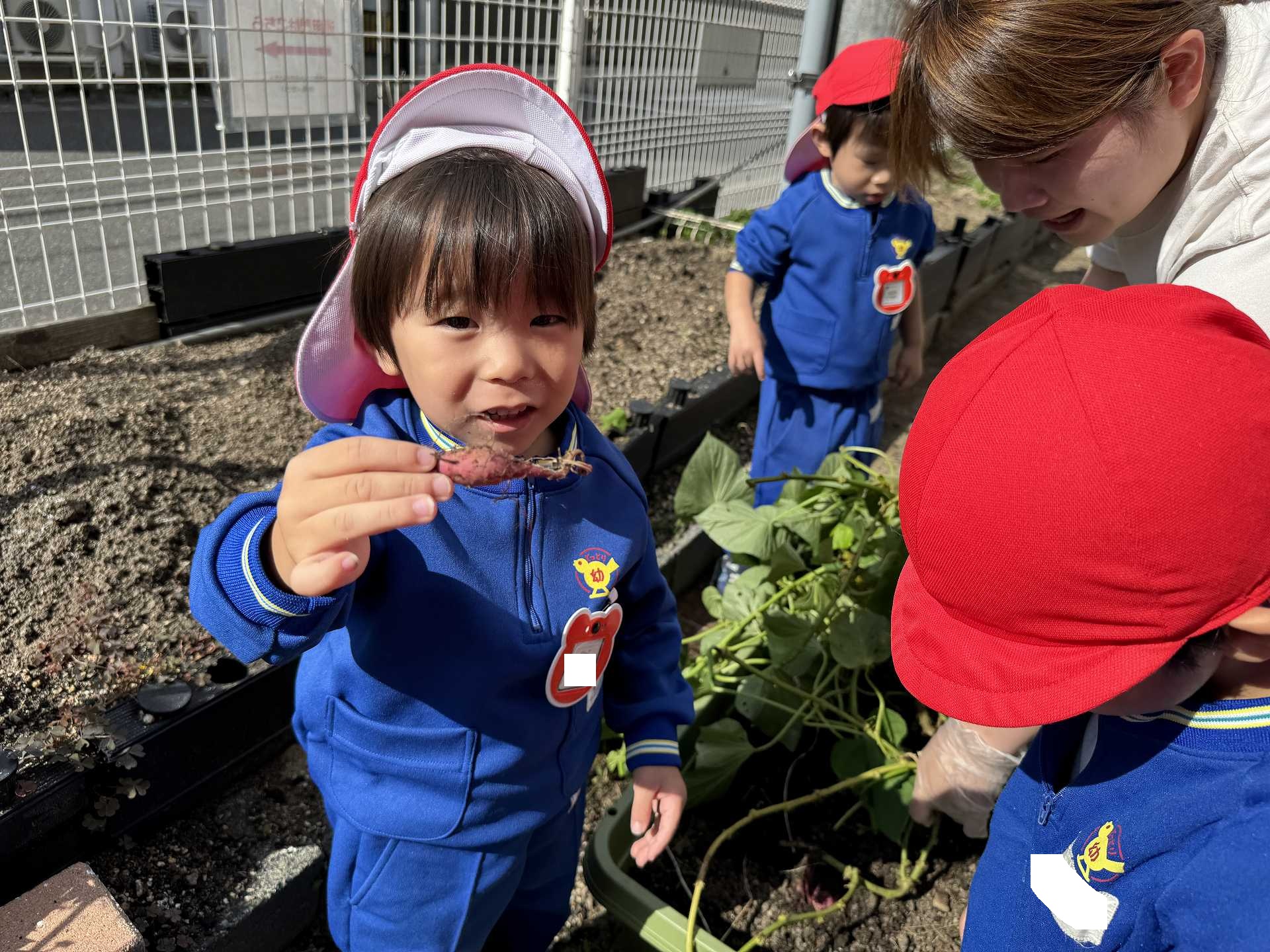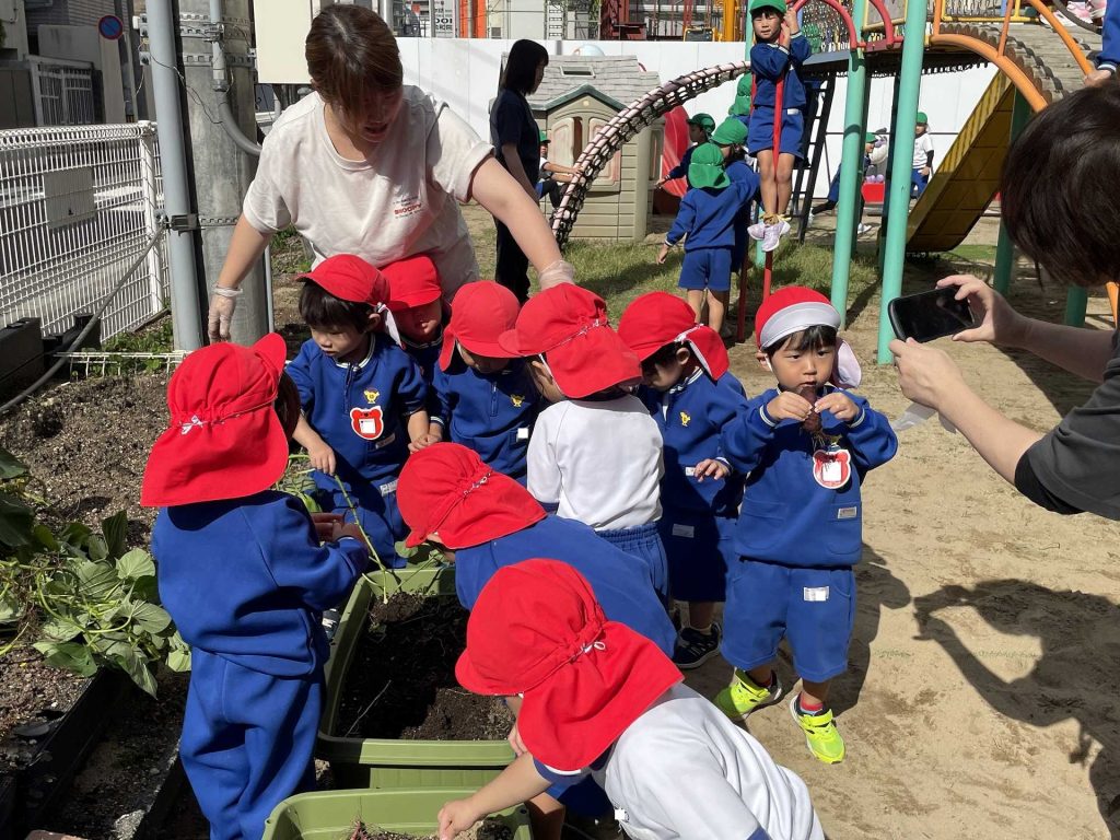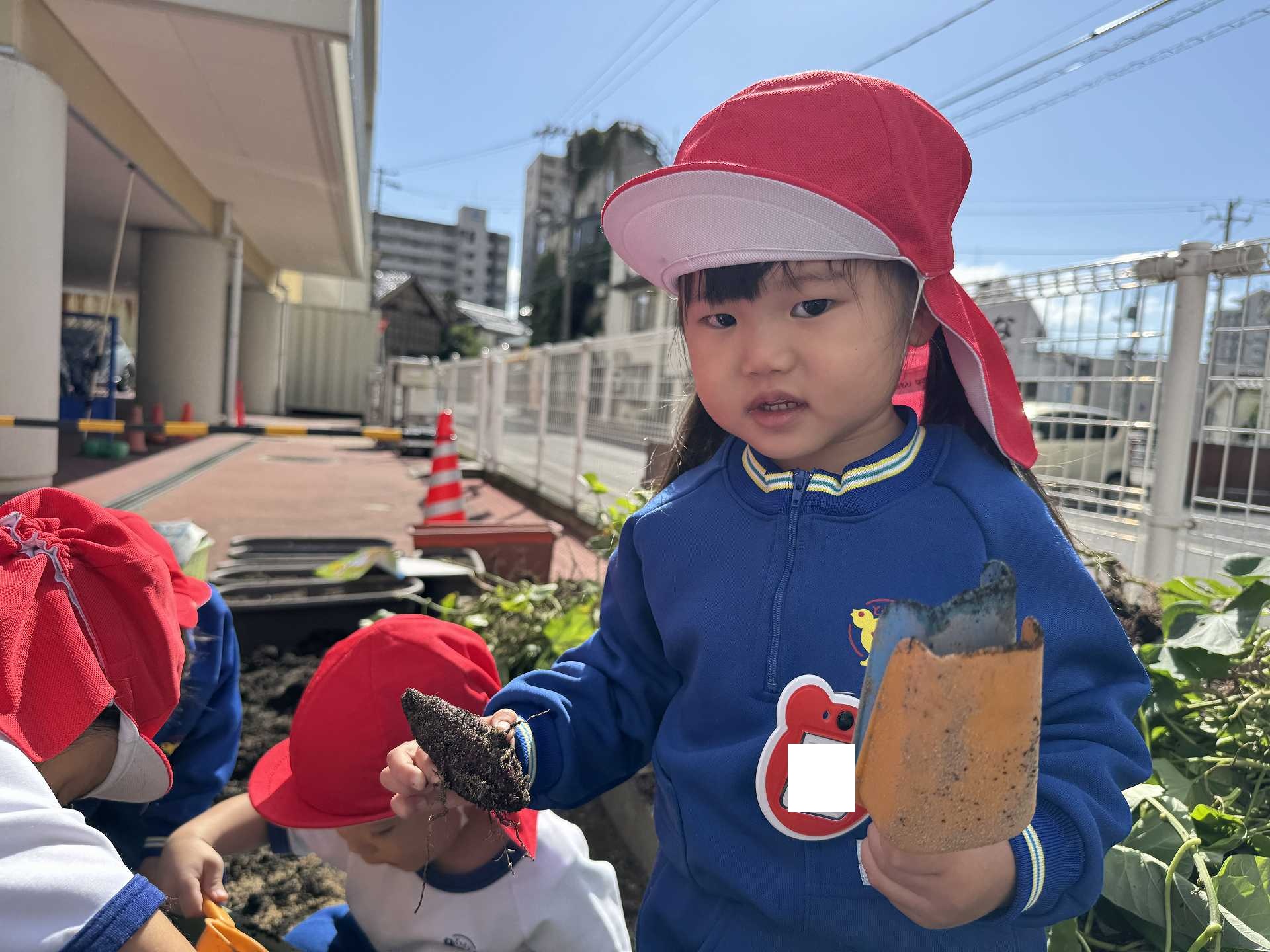2歳の子ども達も園庭のプランターに植えたさつまいもを収穫しました!春に植えた芋の苗が育ち葉っぱが大きく育っていることに驚きながらも、芋ほりの話をしっかり聞いて活動に参加しました。つるを引っ張りさつまいもが少し顔を出すと「あった!ここにあるよ!」と頑張って砂を掘り「出てきたー!!」と土の中から出てきたさつまいもに大喜びの子ども達でした。小さいお芋、大きいお芋と様々なさつまいもが収穫でき、今度クッキングを行うことを伝えると「何食べようかなぁ」「早く食べたい!」ととても楽しみにしています♪