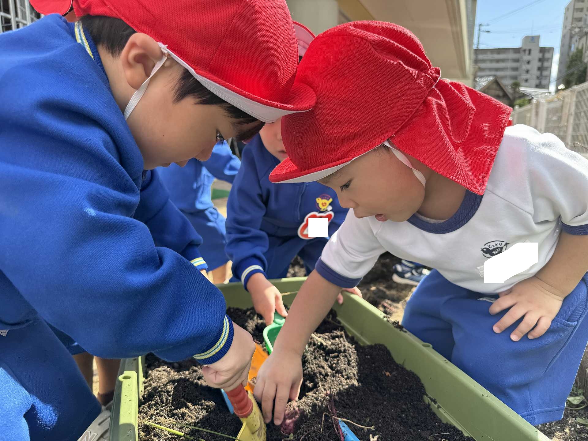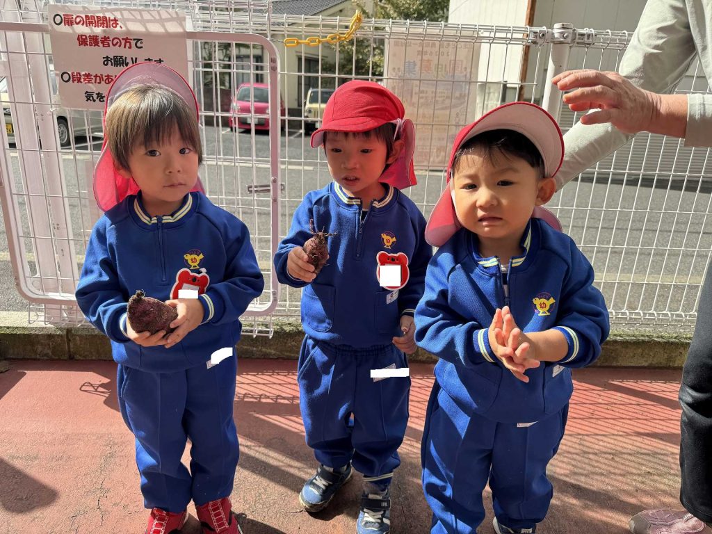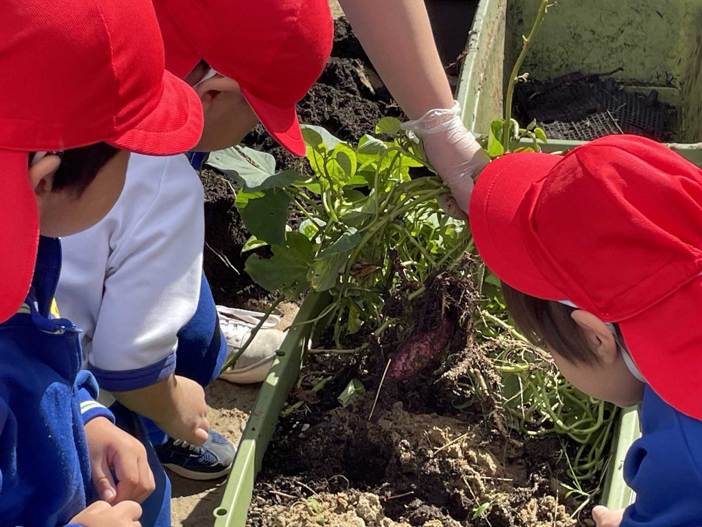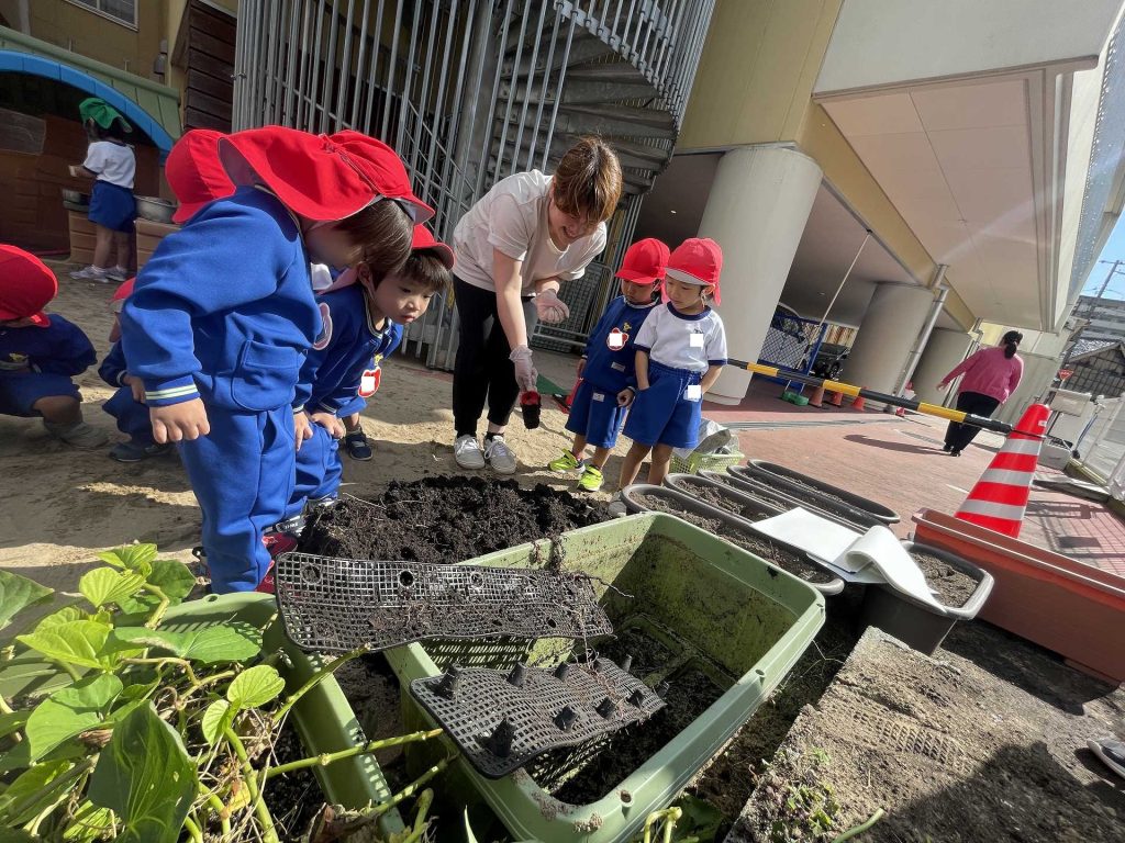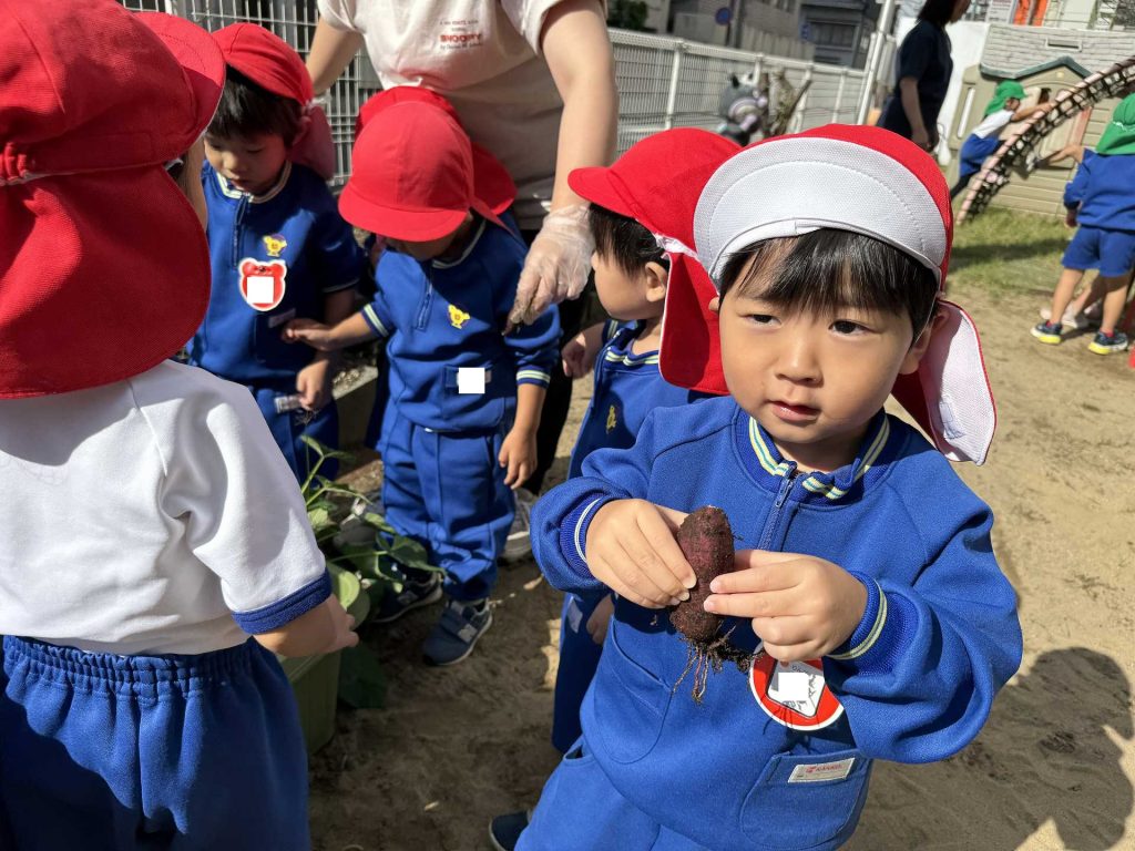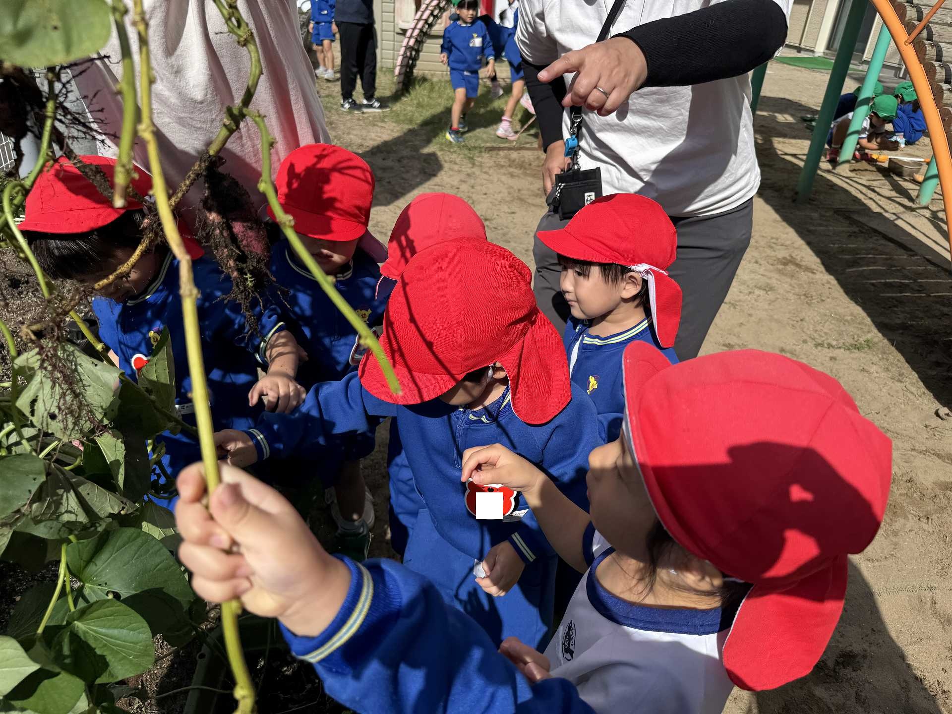 2歳の子ども達も園庭のプランターに植えたさつまいもを収穫しました!春に植えた芋の苗が育ち葉っぱが大きく育っていることに驚きながらも、芋ほりの話をしっかり聞いて活動に参加しました。つるを引っ張りさつまいもが少し顔を出すと「あった!ここにあるよ!」と頑張って砂を掘り「出てきたー!!」と土の中から出てきたさつまいもに大喜びの子ども達でした。小さいお芋、大きいお芋と様々なさつまいもが収穫でき、今度クッキングを行うことを伝えると「何食べようかなぁ」「早く食べたい!」ととても楽しみにしています♪