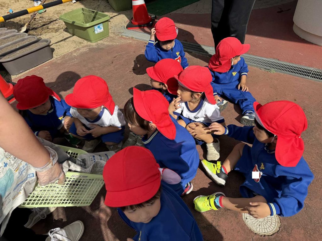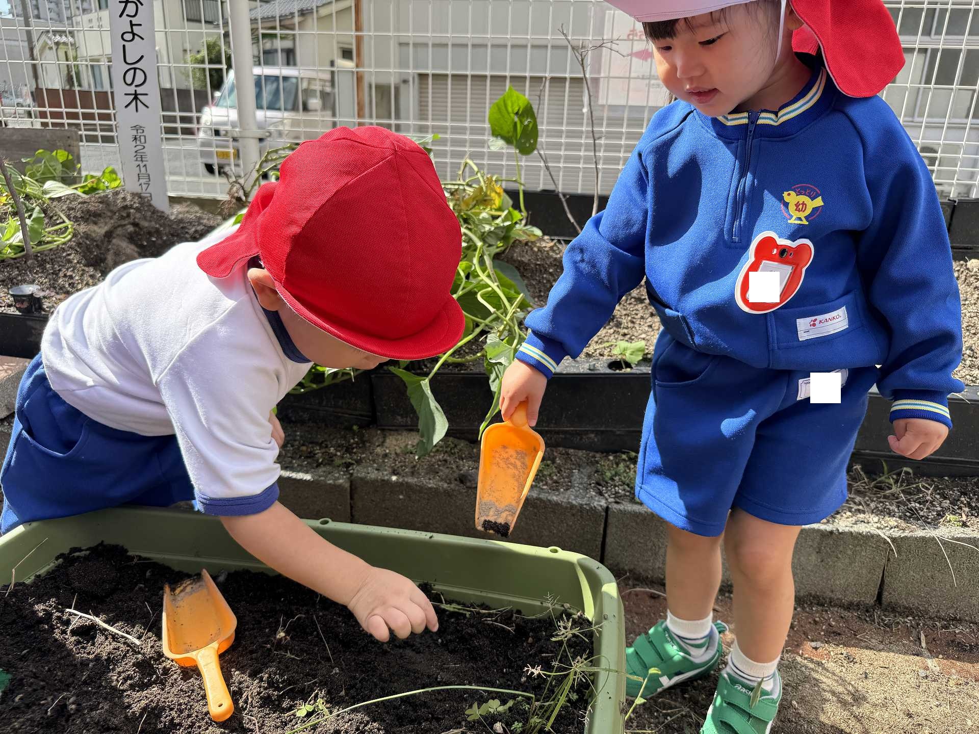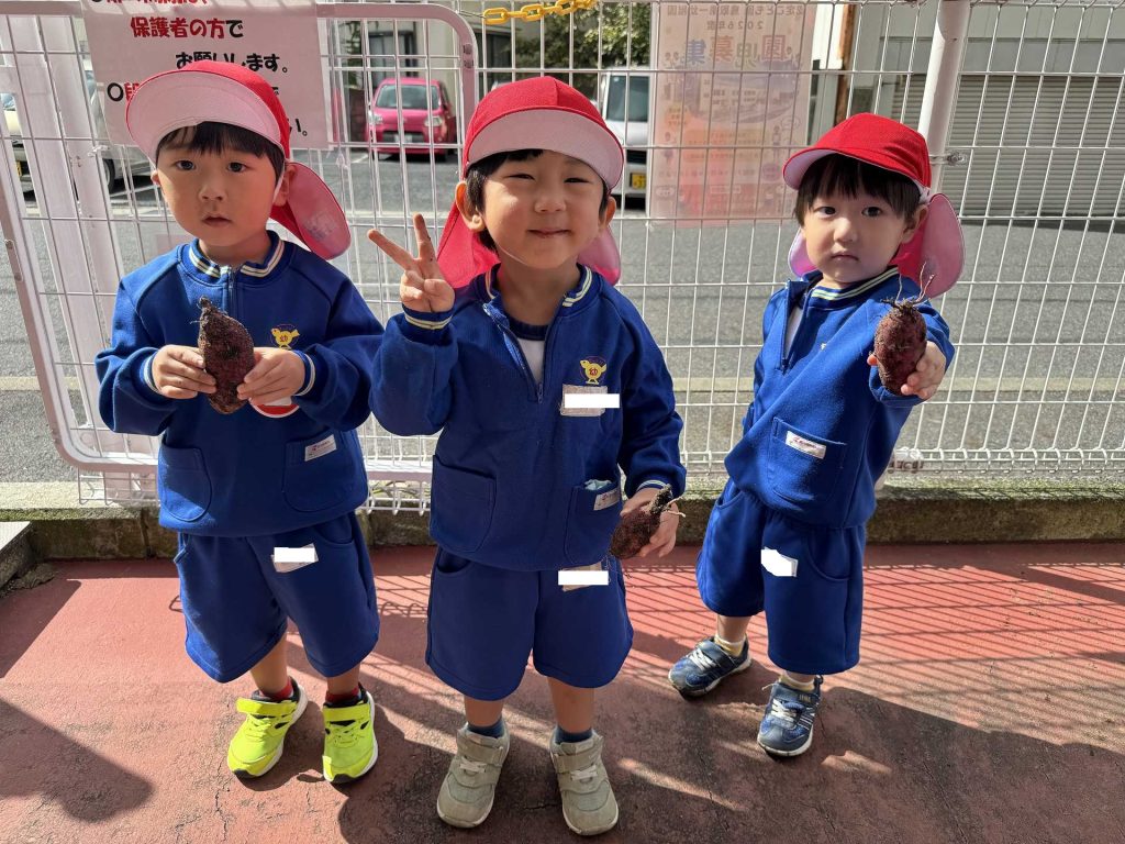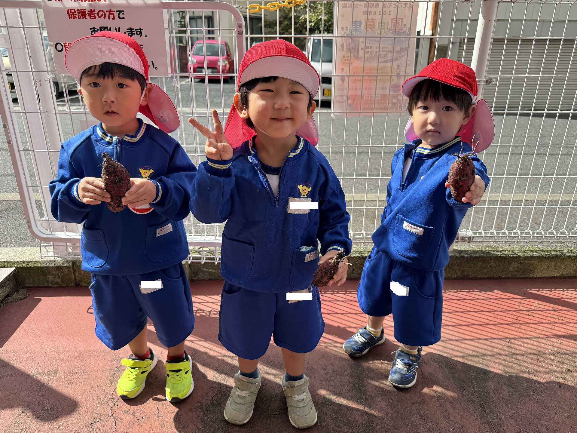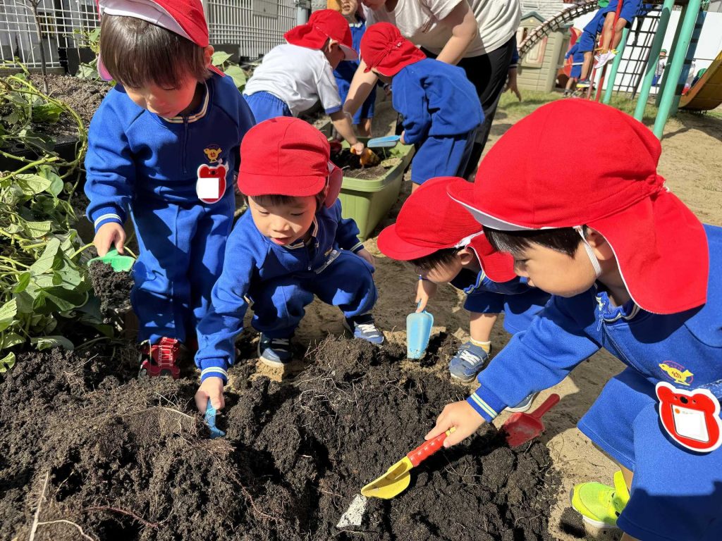 2歳の子ども達も園庭のプランターに植えたさつまいもを収穫しました!春に植えた芋の苗が育ち葉っぱが大きく育っていることに驚きながらも、芋ほりの話をしっかり聞いて活動に参加しました。つるを引っ張りさつまいもが少し顔を出すと「あった!ここにあるよ!」と頑張って砂を掘り「出てきたー!!」と土の中から出てきたさつまいもに大喜びの子ども達でした。小さいお芋、大きいお芋と様々なさつまいもが収穫でき、今度クッキングを行うことを伝えると「何食べようかなぁ」「早く食べたい!」ととても楽しみにしています♪