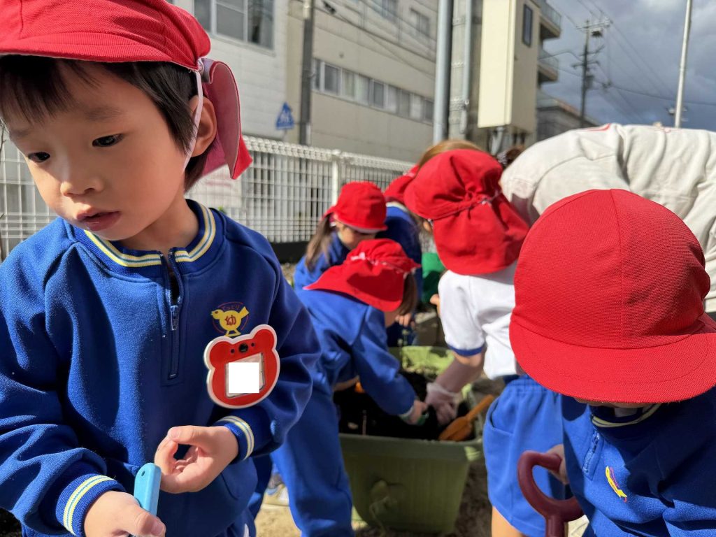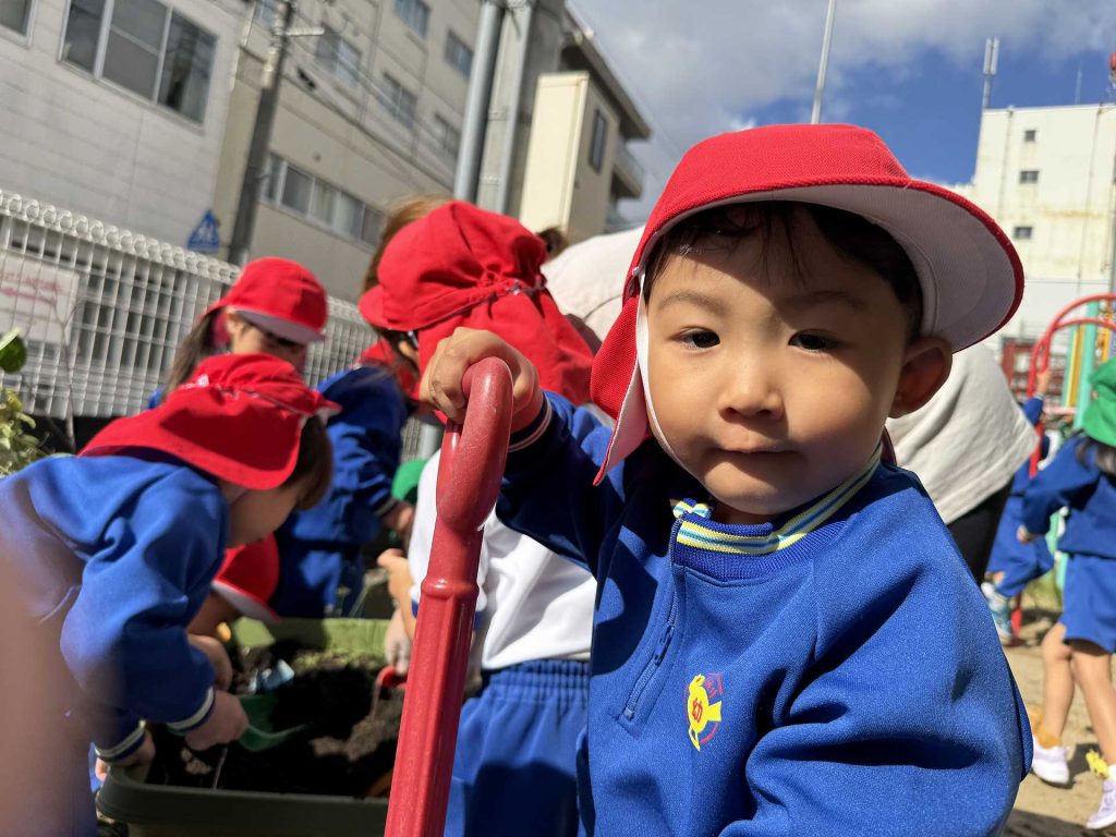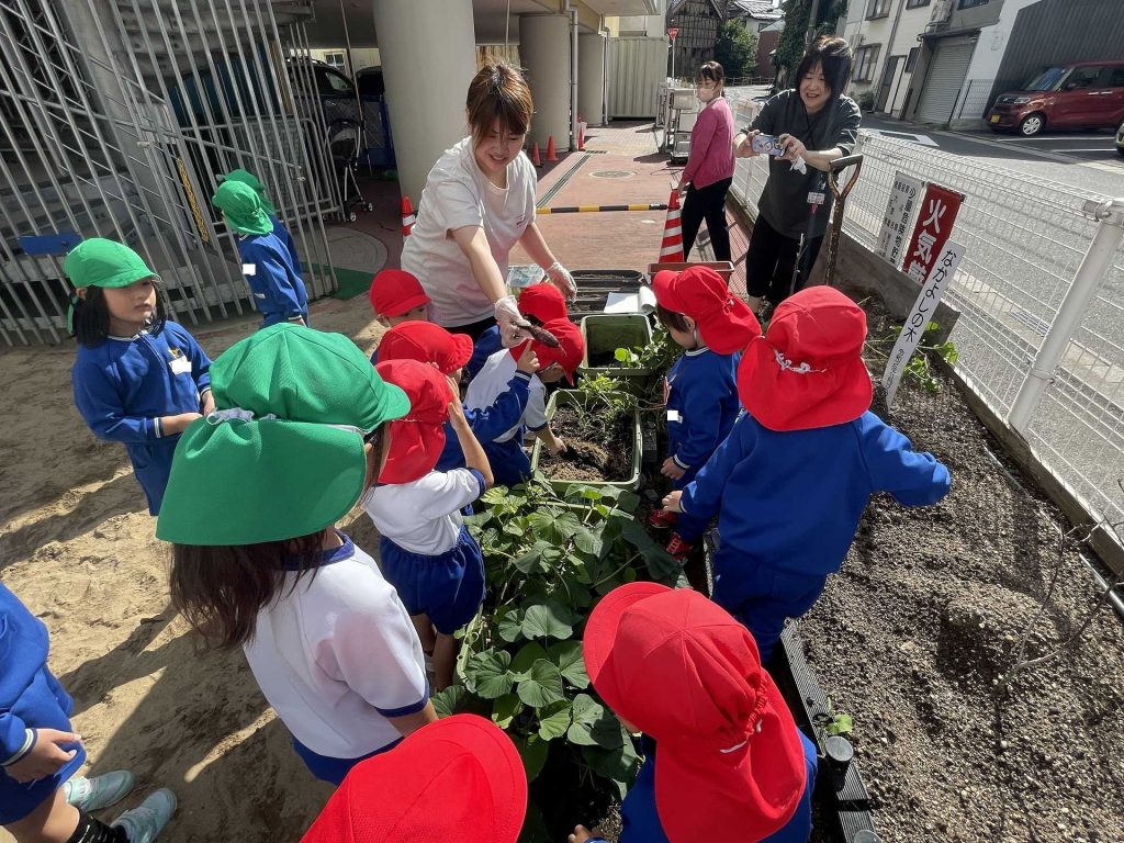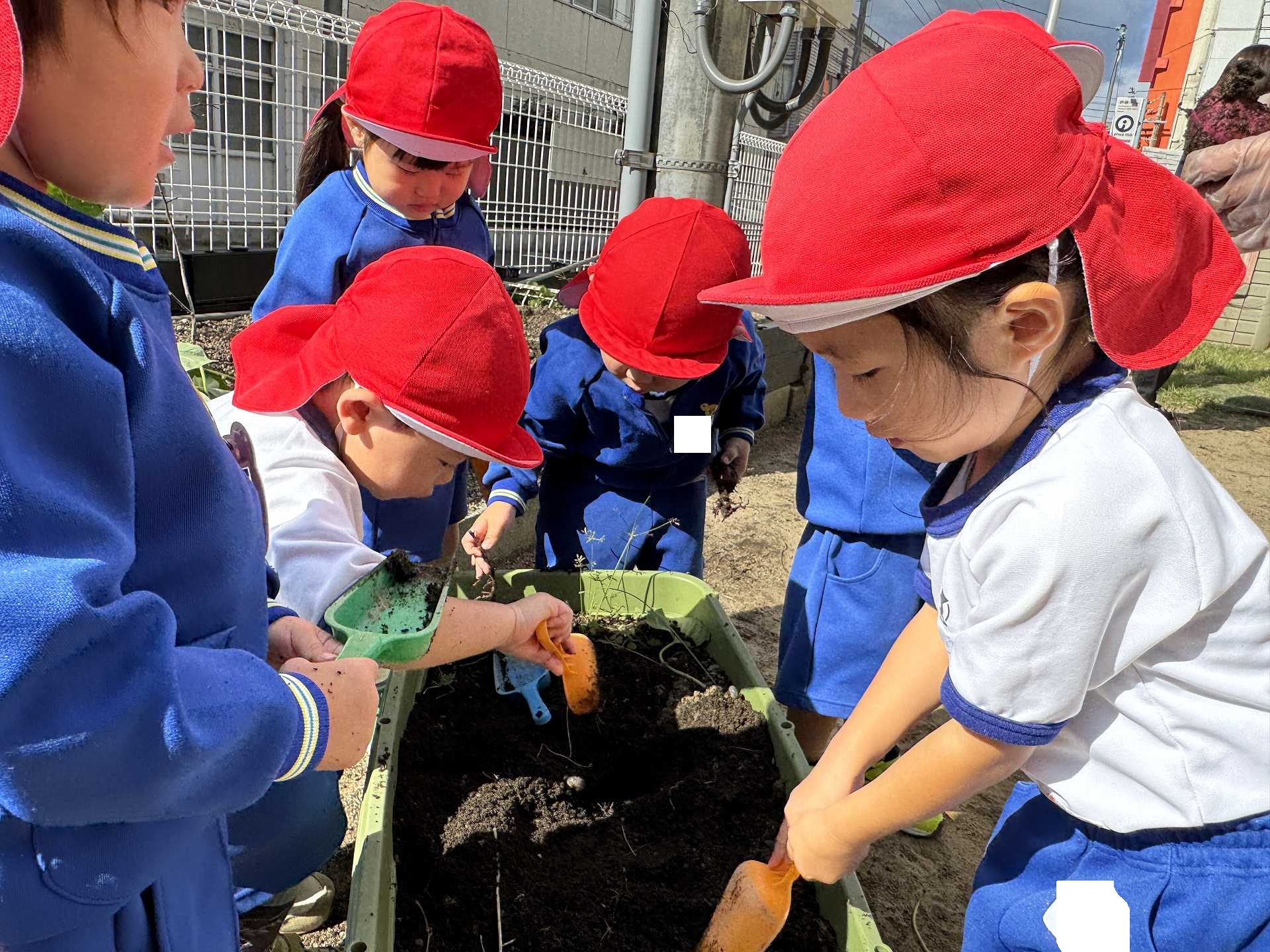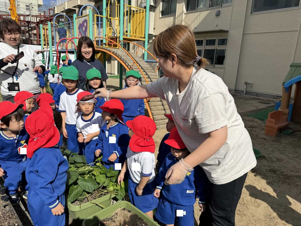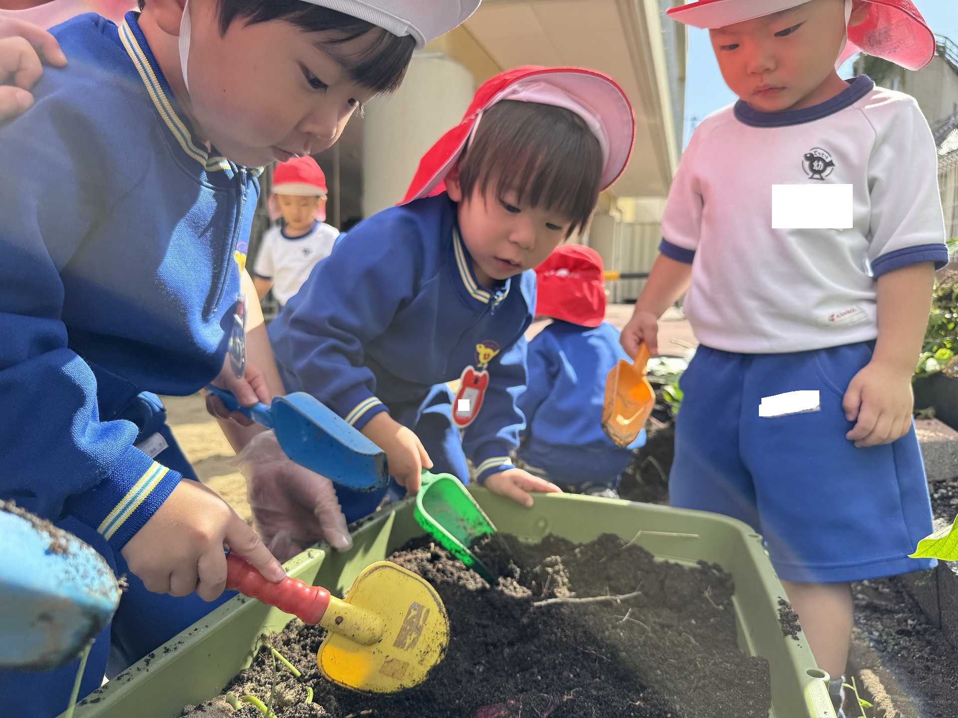 2歳の子ども達も園庭のプランターに植えたさつまいもを収穫しました!春に植えた芋の苗が育ち葉っぱが大きく育っていることに驚きながらも、芋ほりの話をしっかり聞いて活動に参加しました。つるを引っ張りさつまいもが少し顔を出すと「あった!ここにあるよ!」と頑張って砂を掘り「出てきたー!!」と土の中から出てきたさつまいもに大喜びの子ども達でした。小さいお芋、大きいお芋と様々なさつまいもが収穫でき、今度クッキングを行うことを伝えると「何食べようかなぁ」「早く食べたい!」ととても楽しみにしています♪